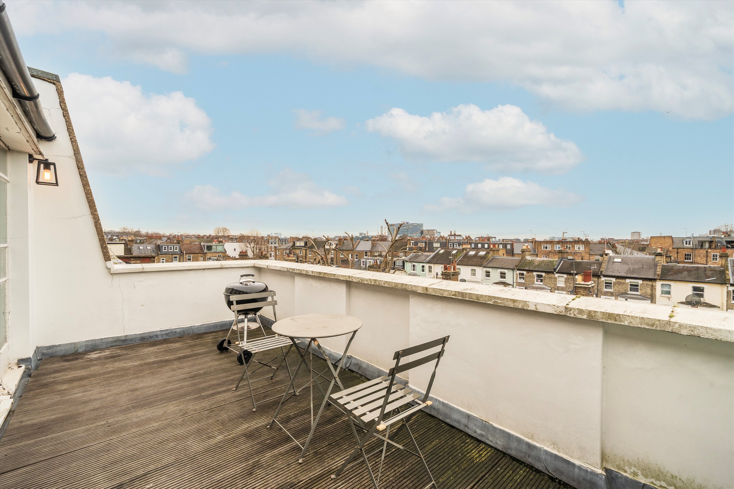 A charming and modern three bedroom flat set on the top two floors of the Victorian conversion. This flat has a spacious open plan kitchen living leading onto the private west facing terrace, two bathrooms and with views over the London rooftops it would make a phenomenal home.