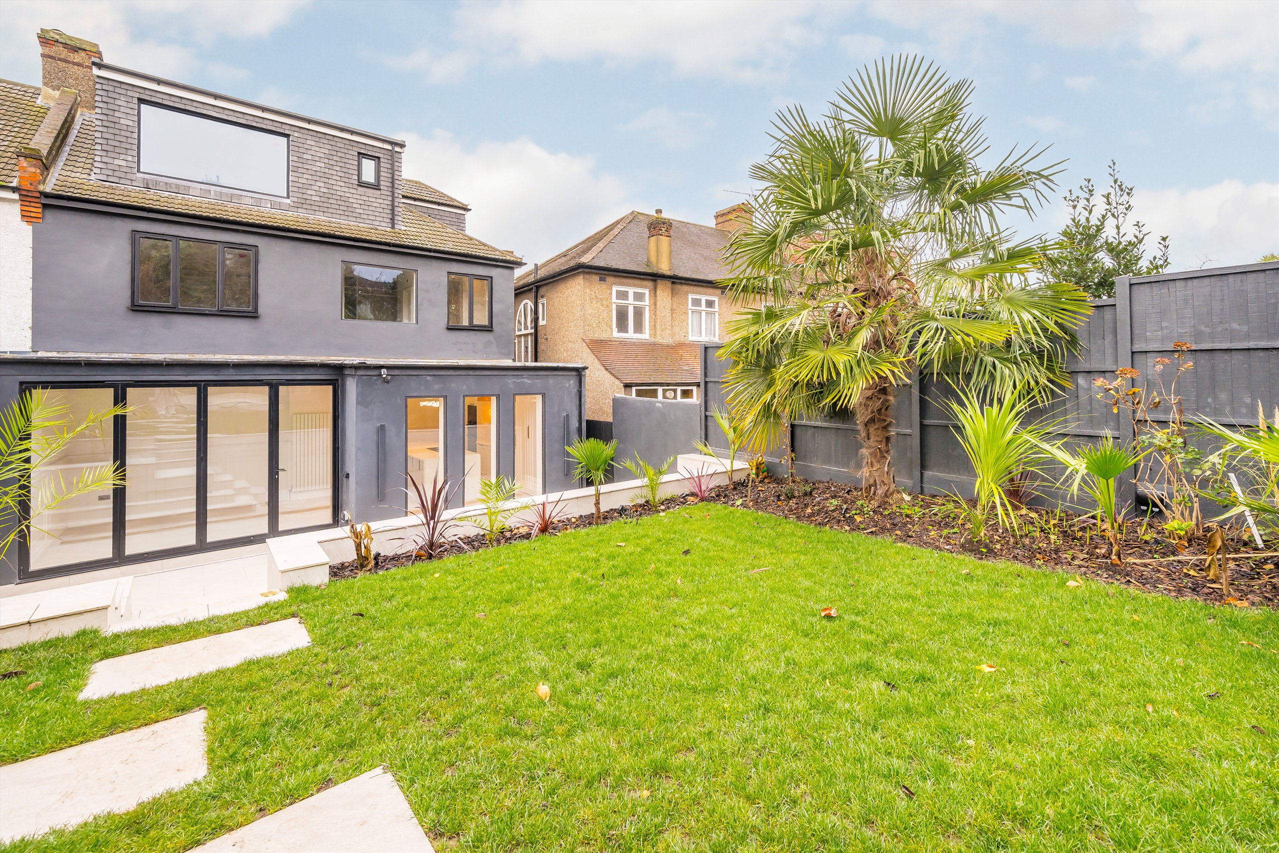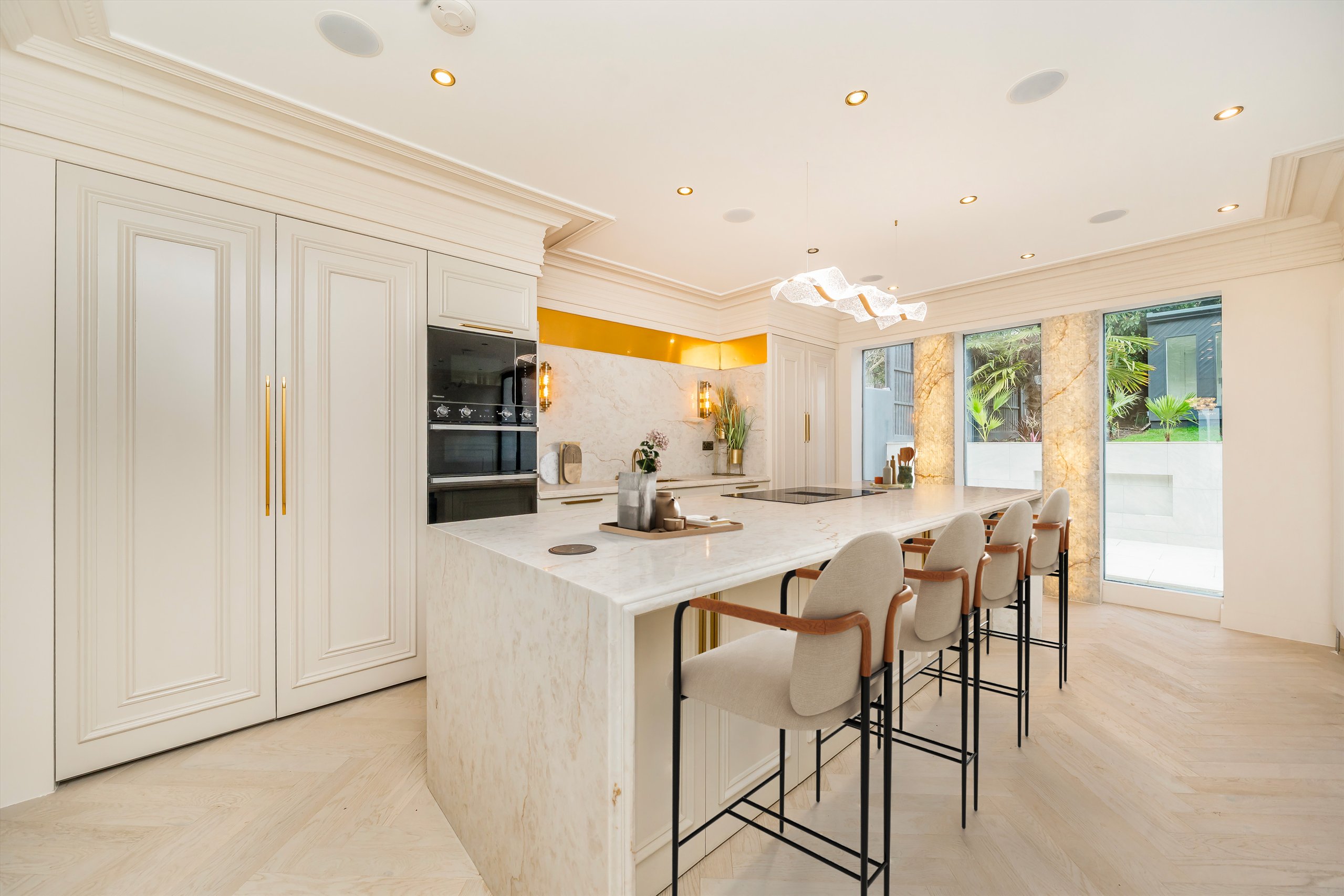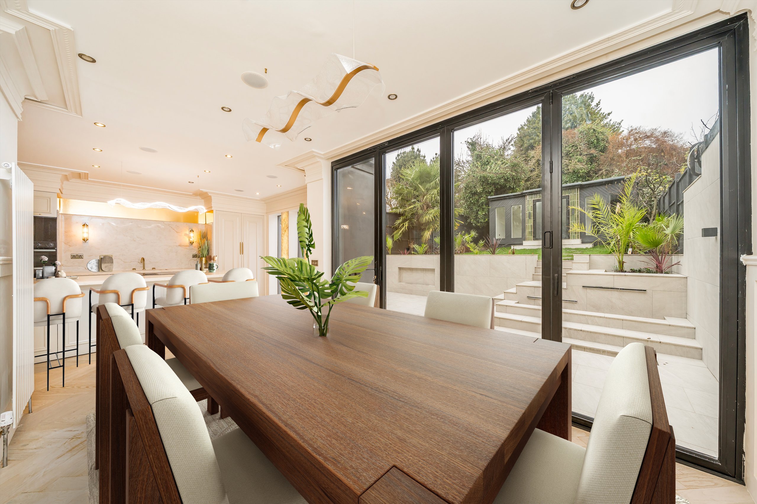 This immaculately refurbished, four-bedroom semi-detached house is arranged over 2,593sqft and comprises a separate reception room, cinema room, study, spacious kitchen/diner with bifold doors leading out to a fully landscaped garden with water feature and LED lighting, an outbuilding with sauna, which creates an ideal gym/wellness space, a ground floor WC and four bedrooms with four en suite bathrooms.