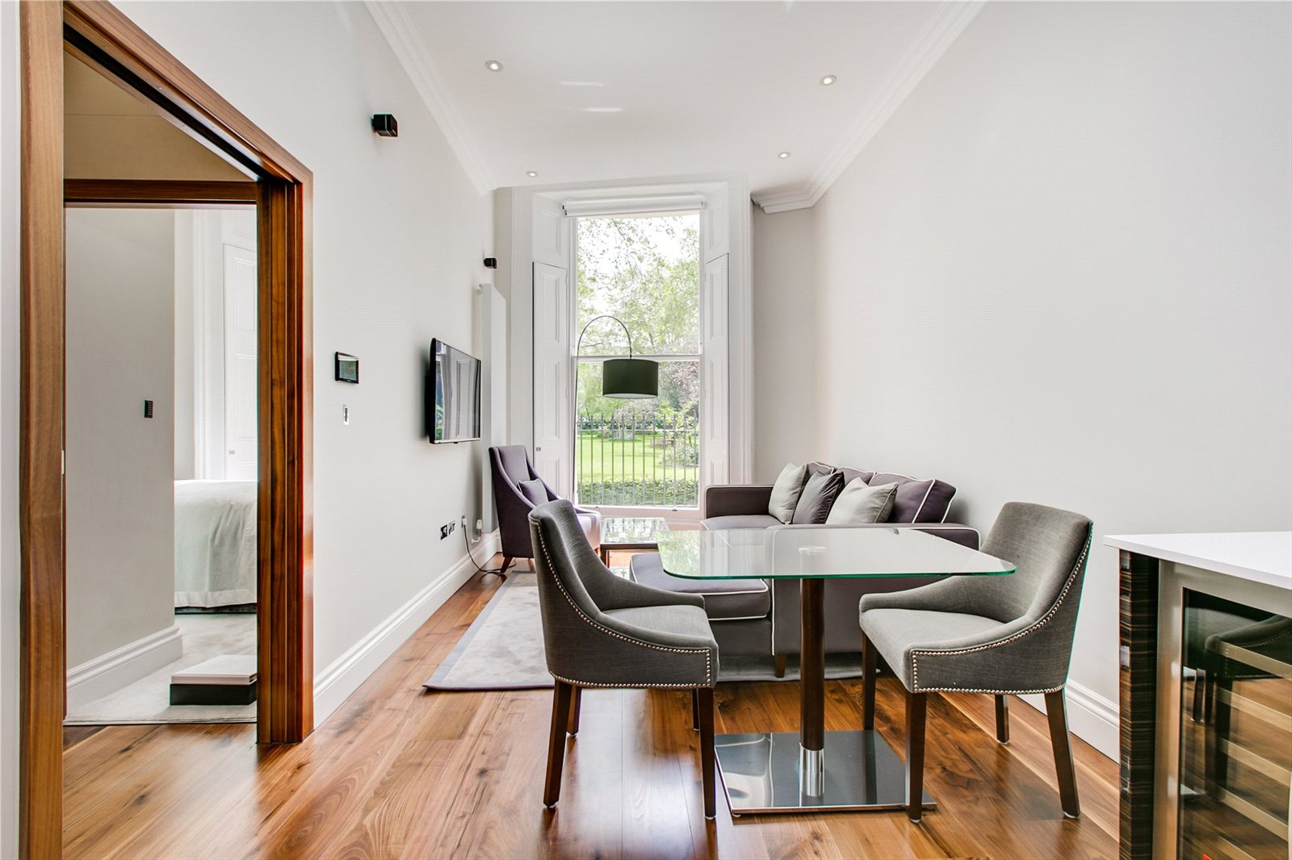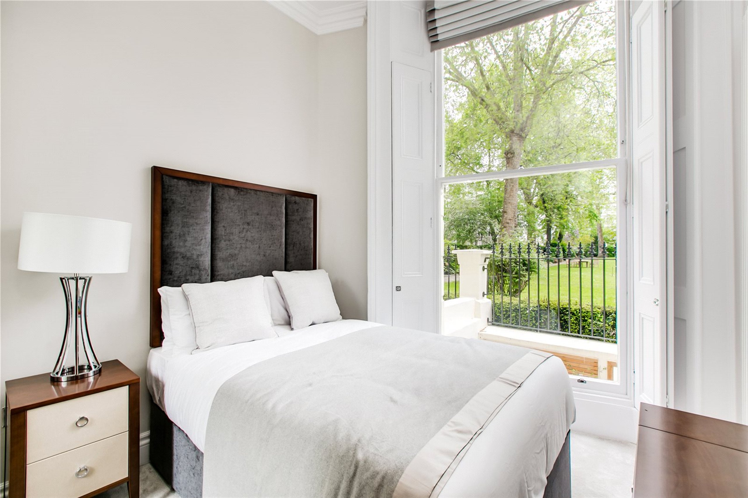 A modern and bright raised ground floor flat set within a period building overlooking a garden square.