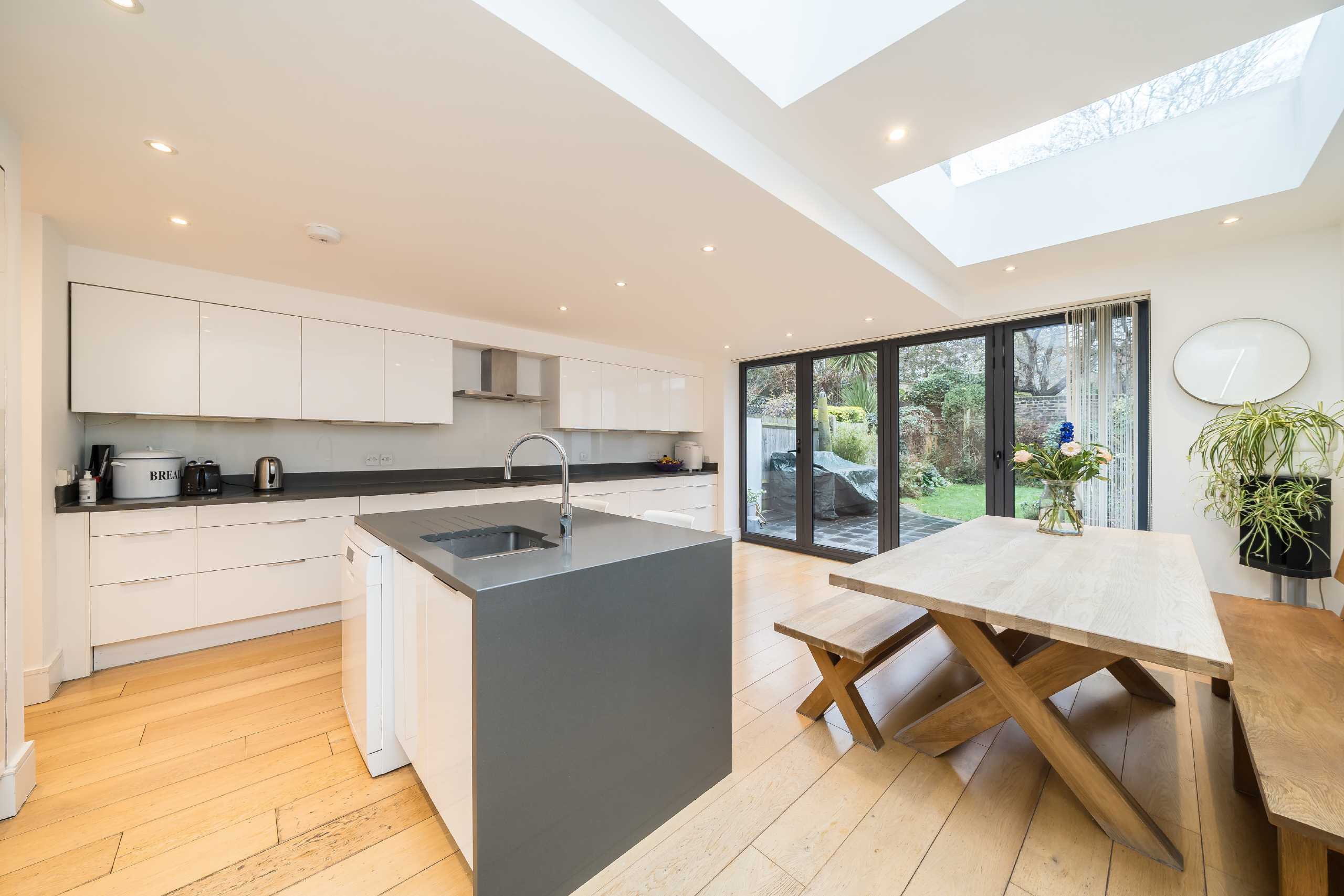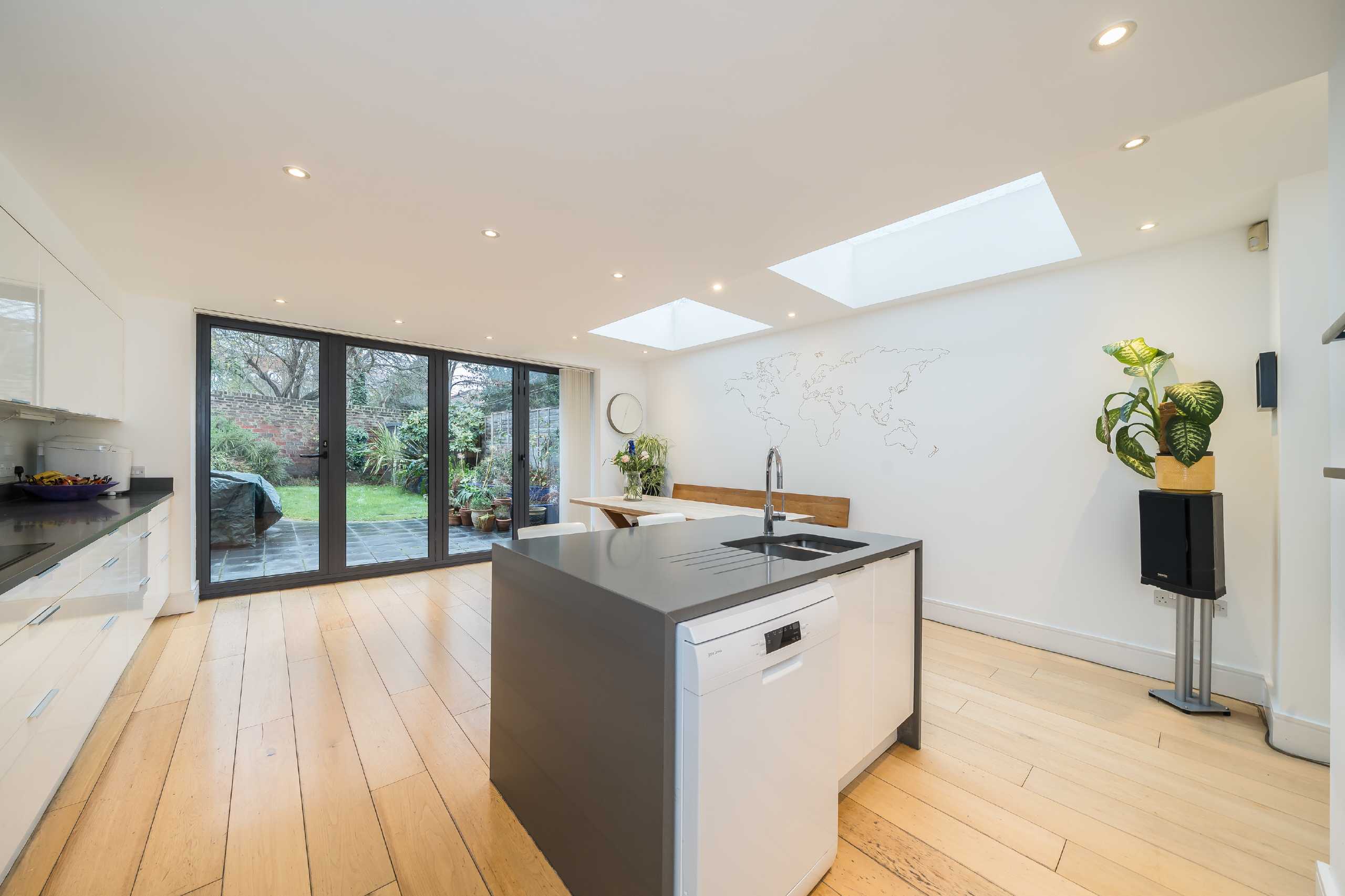 Coming to the market in immaculate condition, this property offers the opportunity to purchase a five bedroom period conversion complete with a ground floor, side return and loft extension. The ground floor has an open plan double reception room which retains period features such as the fireplaces and decorative ceiling cornicing blending seamlessly with the modern touches. The kitchen comes fully fitted and the combination of bifold doors and skylight windows allow light to flood the interior. An added benefit is the downstairs toilet. Three bedrooms are on the first floor, all of which are spacious doubles. The master bedroom on the second floor has skylight windows and a Juliet balcony creating a bright room throughout the day. The last bedroom and family bathroom are also on this floor, and completing the property is the landscaped garden and underground cellar.