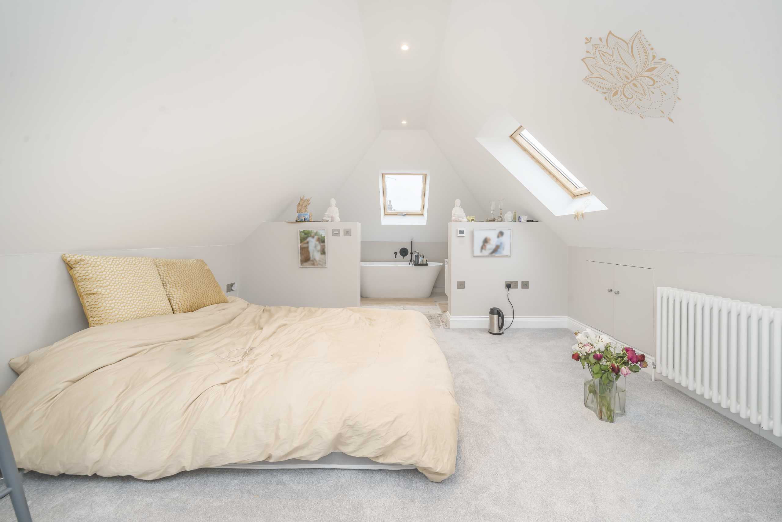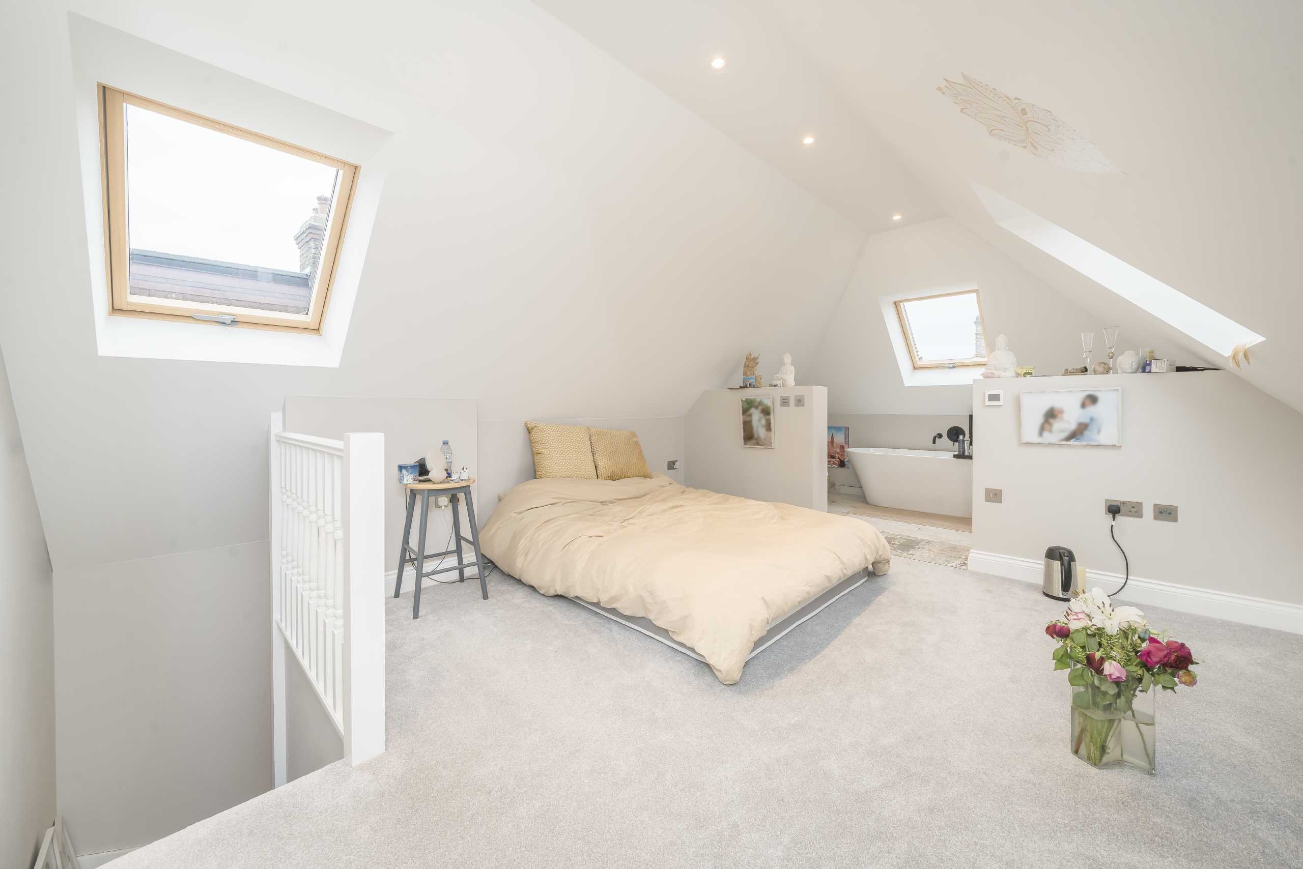 The upper floors comprise three well-proportioned bedrooms. The first floor hosts two bedrooms along with a family bathroom. The top floor is dedicated to the main bedroom, featuring an open-plan en-suite bathroom with a bathtub, creating a private and relaxing retreat.