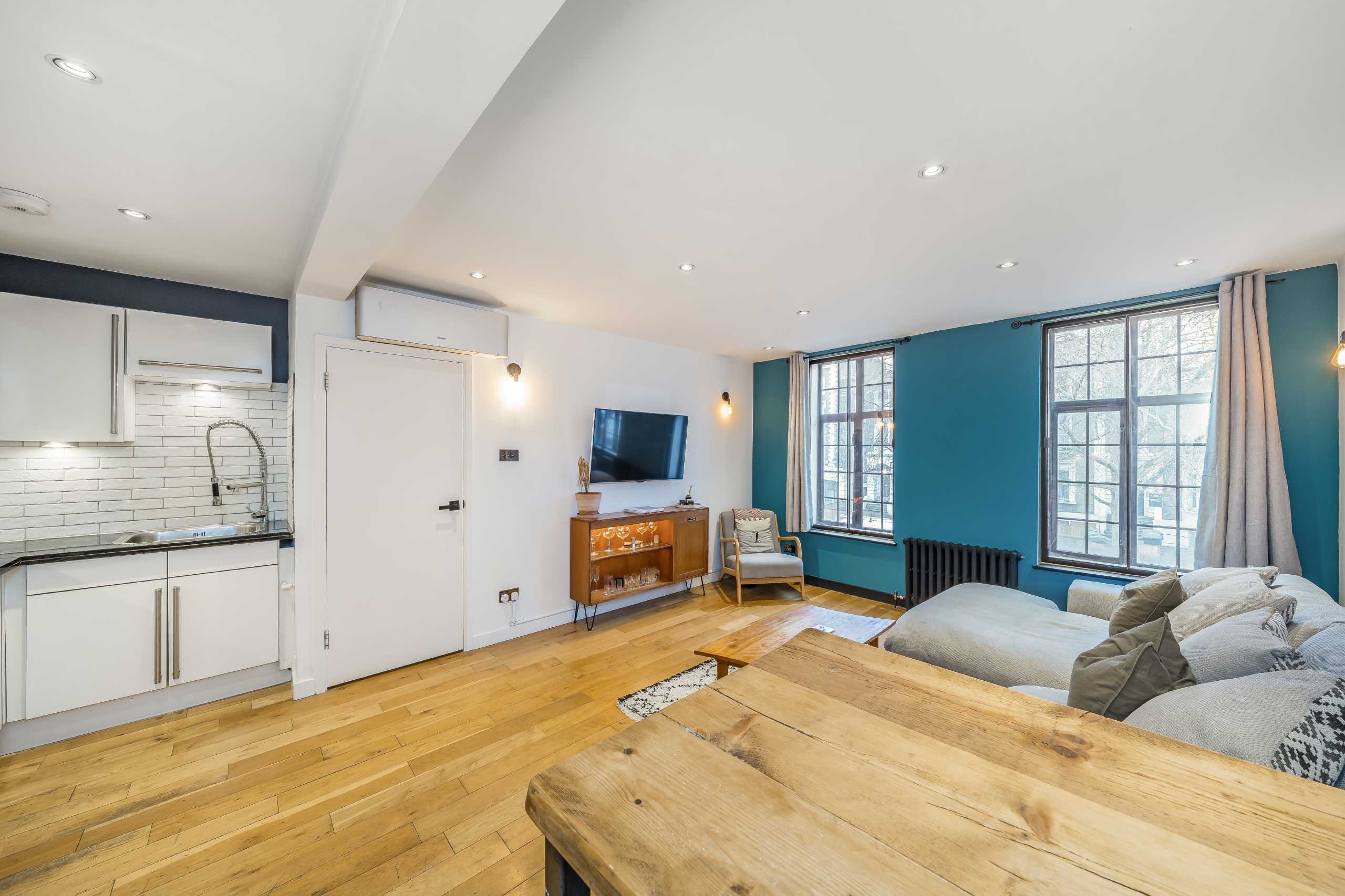 The property is in excellent condition with accommodation comprising two double bedrooms, a family bathroom and a generous open plan kitchen and living space. The property also benefits from an incredible communal roof terrace, fitted with outdoor furniture and benches, air conditioning throughout and a 975 year lease. The property is being sold chain free.