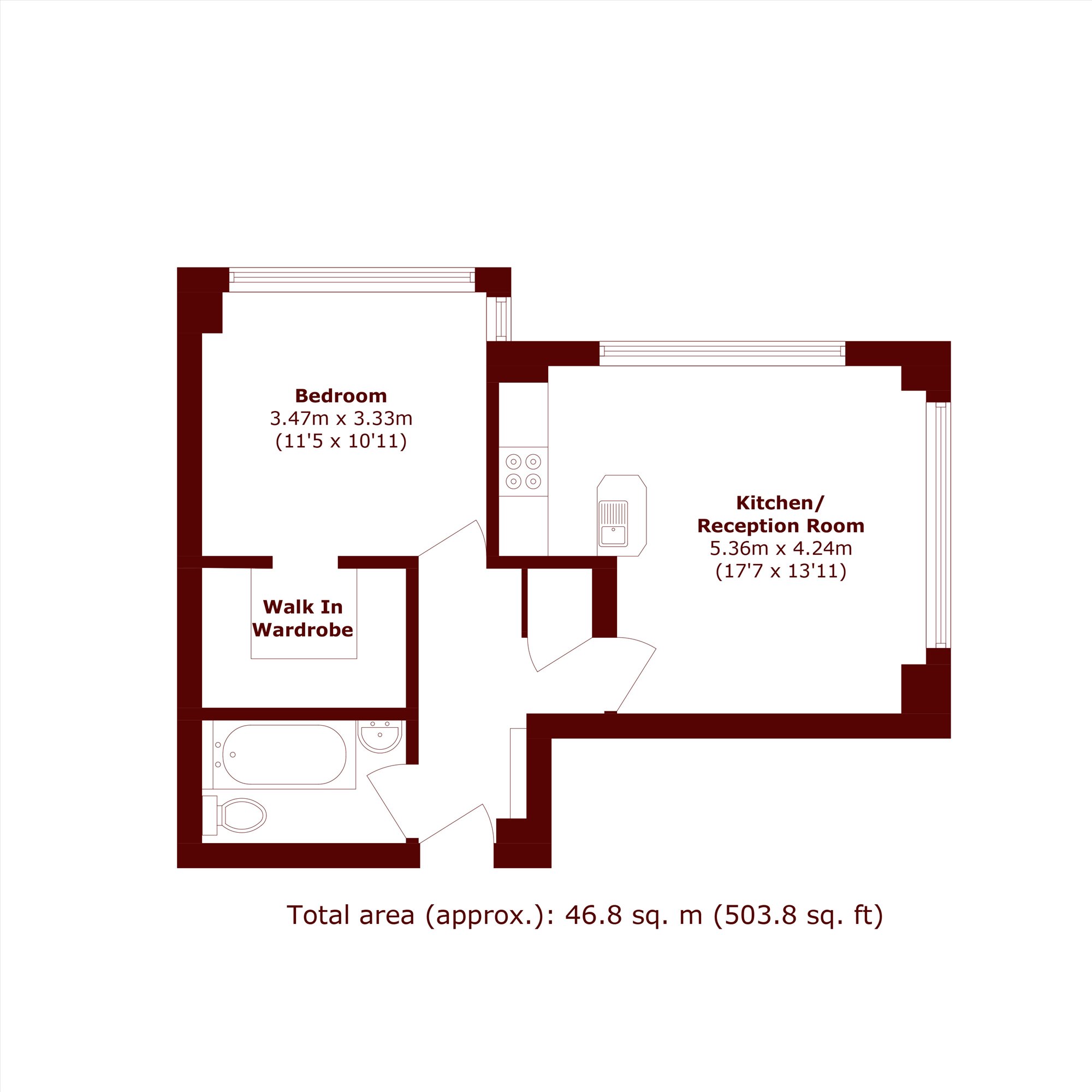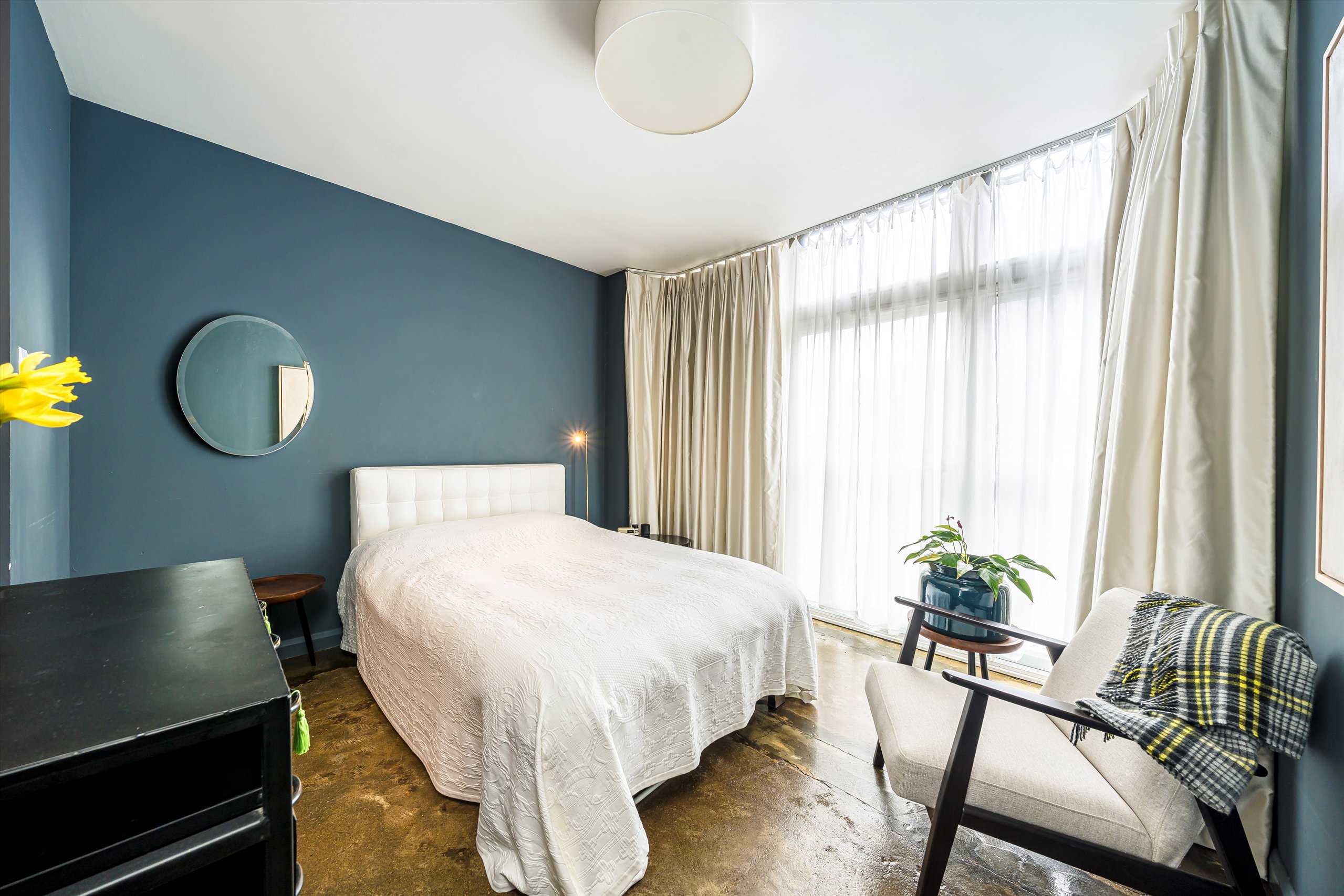 The spacious double bedroom is equally impressive, benefiting from floor to ceiling windows and a generous walk-in wardrobe.