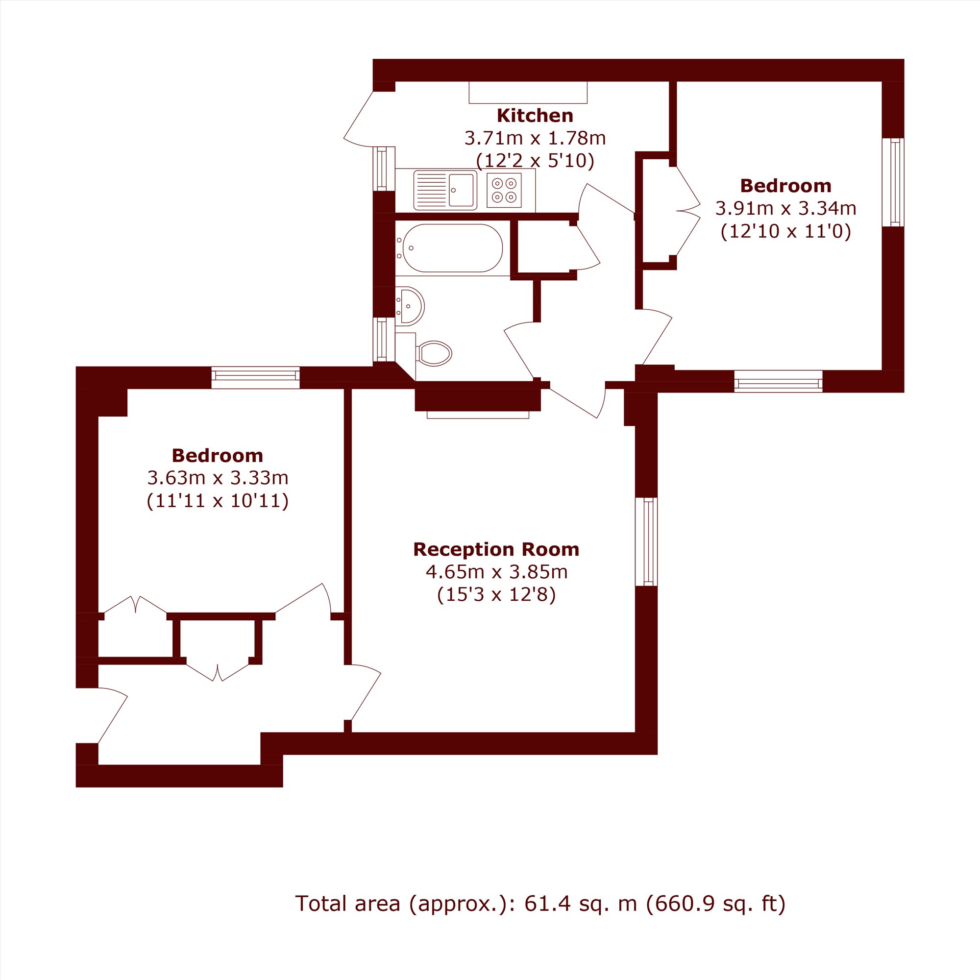 The accommodation comprises a spacious reception room featuring a charming fireplace and period sash windows, a separate well-appointed kitchen, and two generously sized double bedrooms, both benefiting from built-in wardrobes.