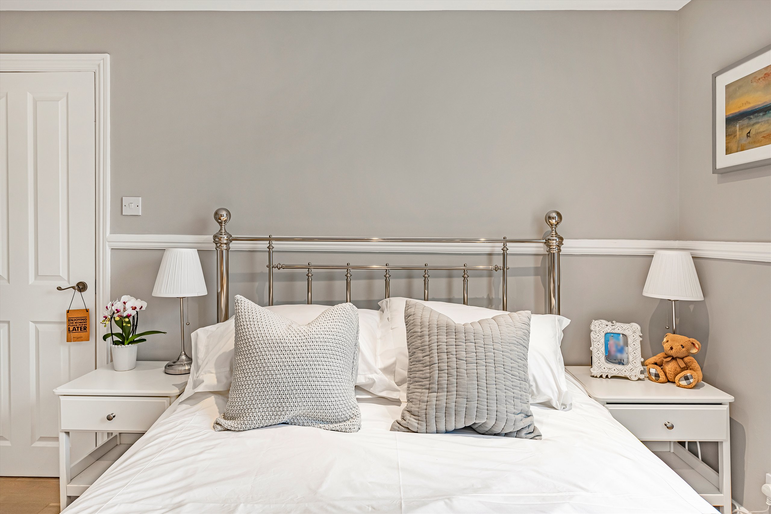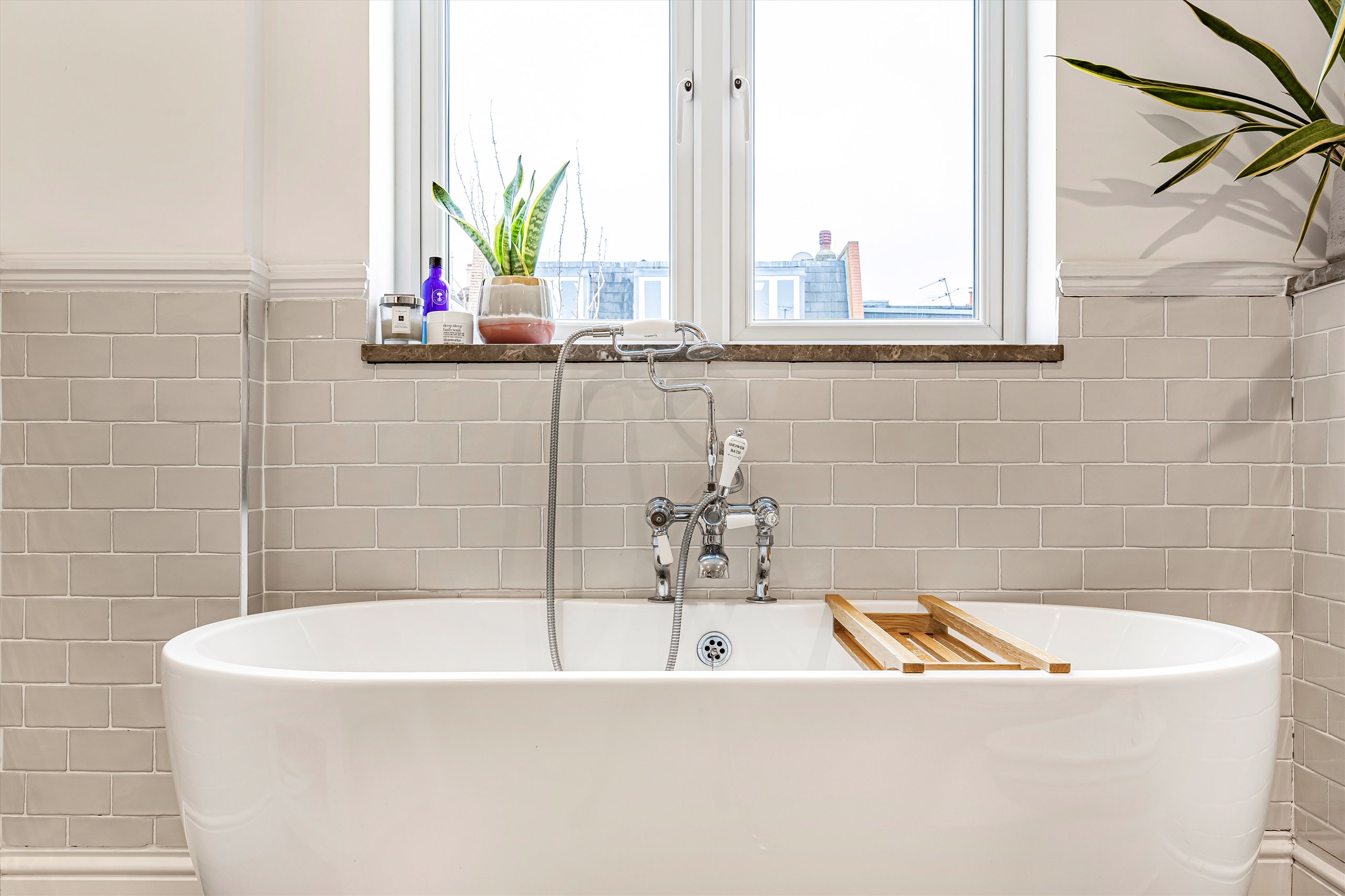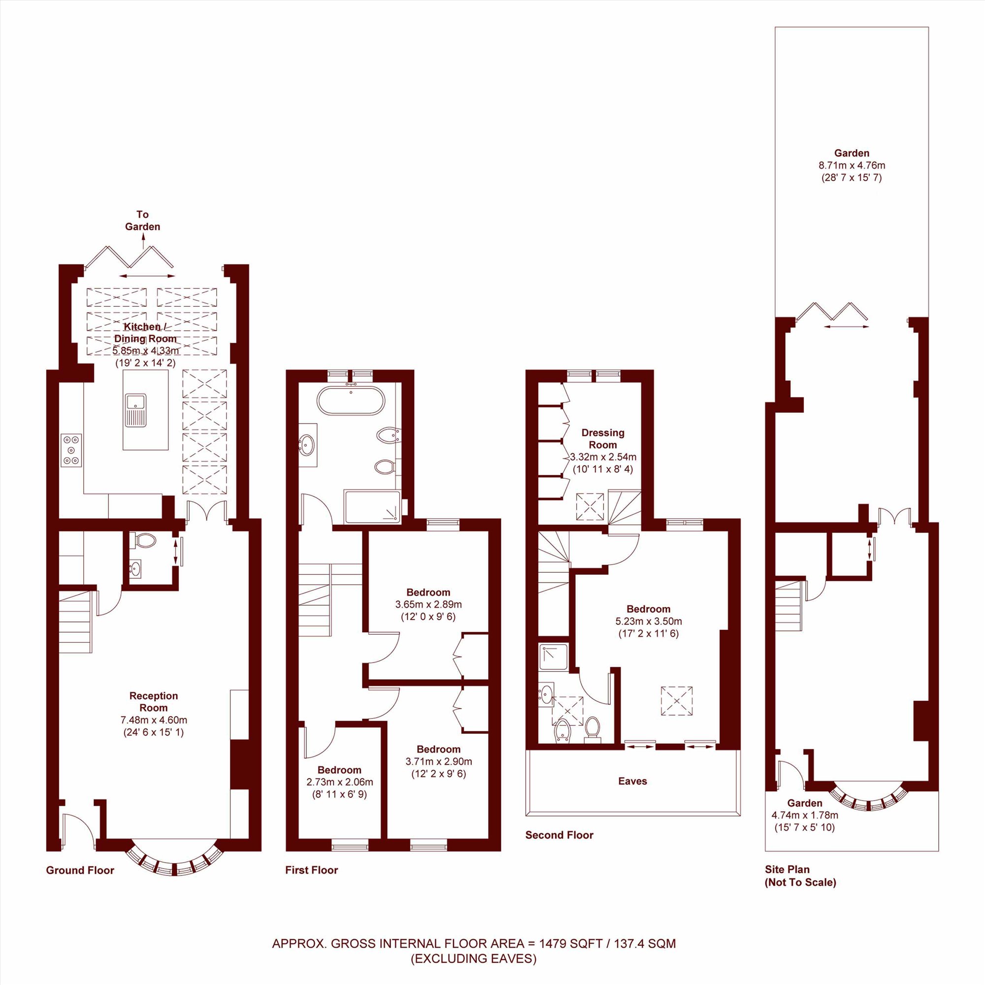 The first floor comprises two double bedrooms with fitted wardrobes, a further bedroom, and a spacious contemporary bathroom featuring a freestanding bathtub and separate walk-in shower. The top floor offers a bright and airy double bedroom with an adjoining shower room and a split-level dressing room / study.