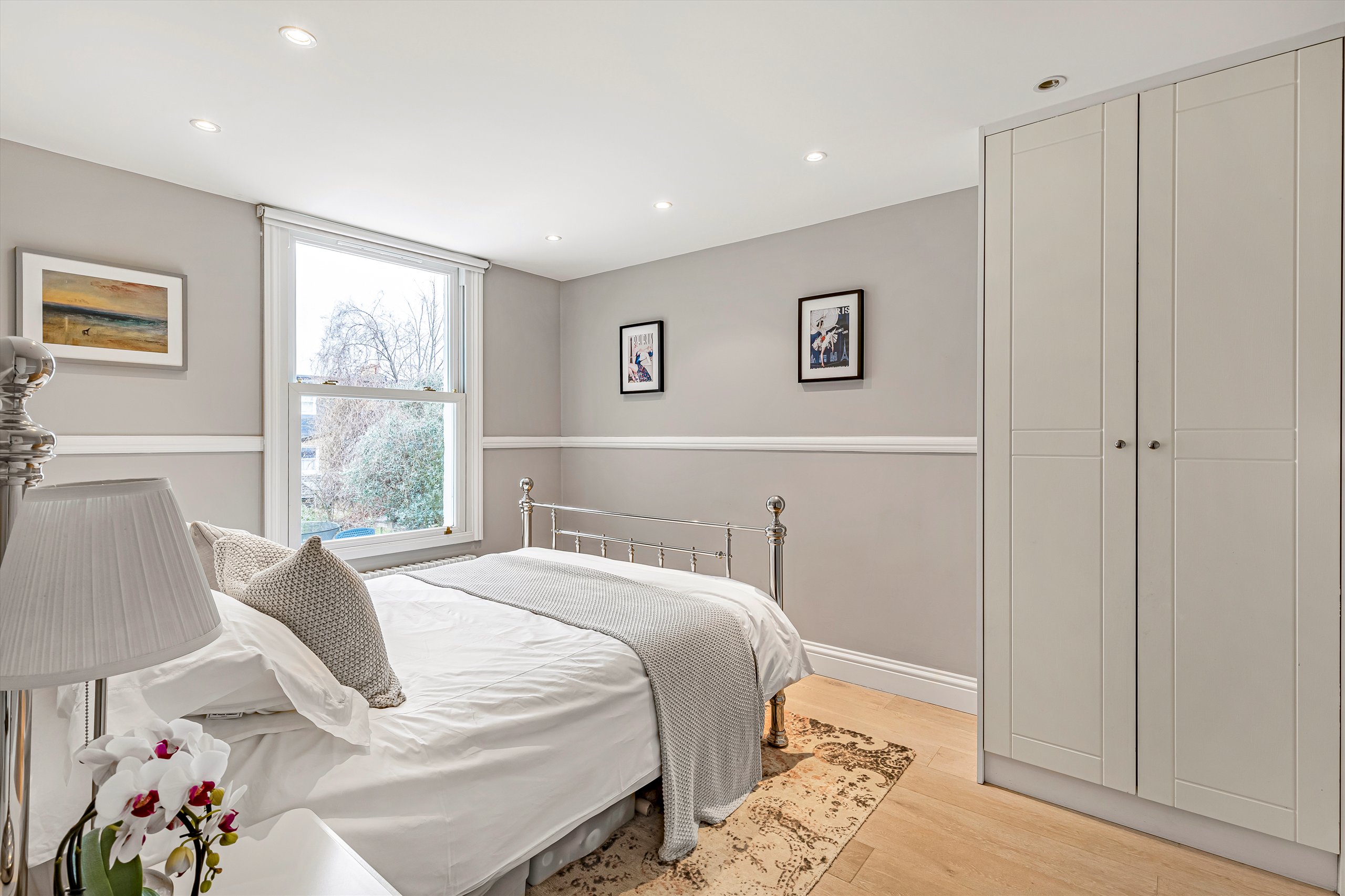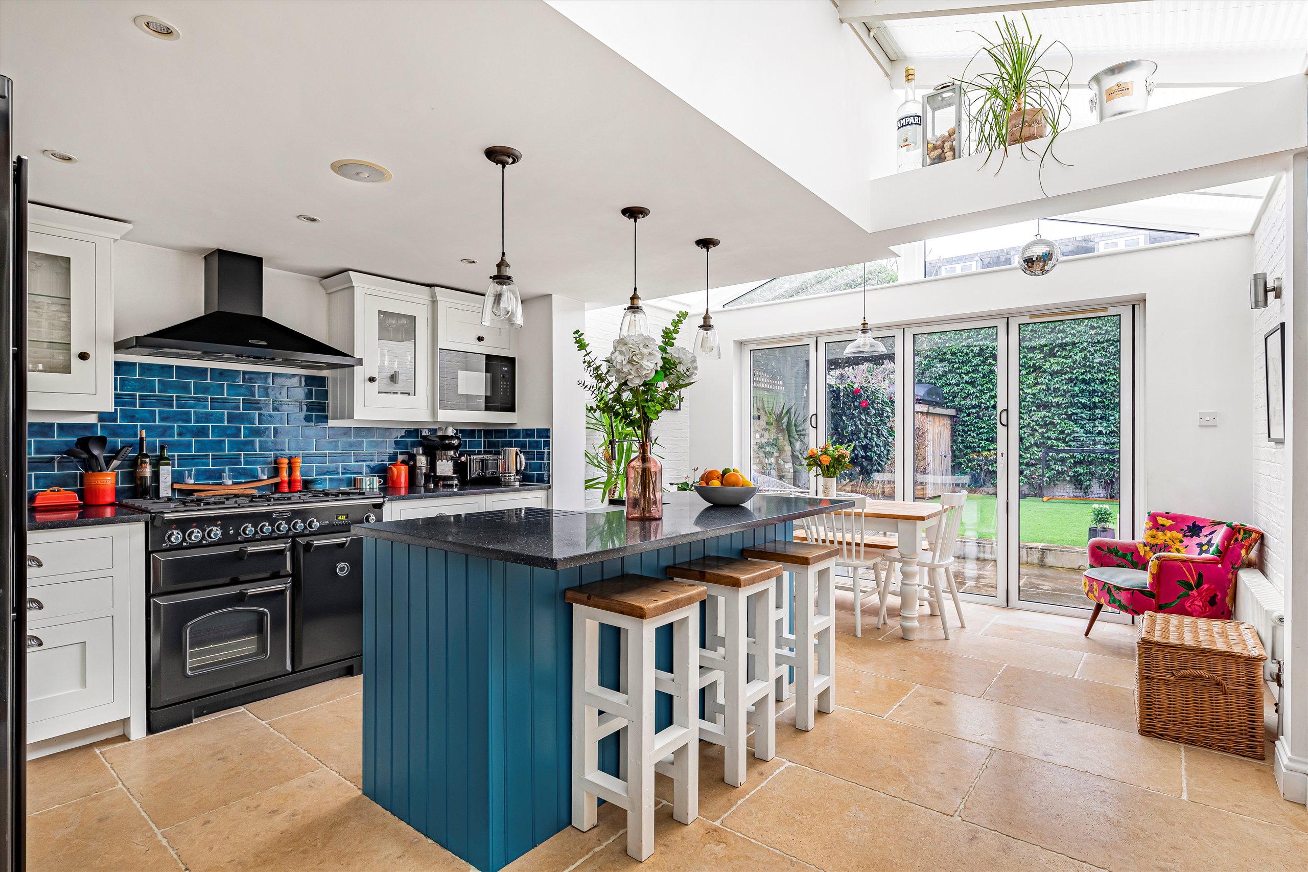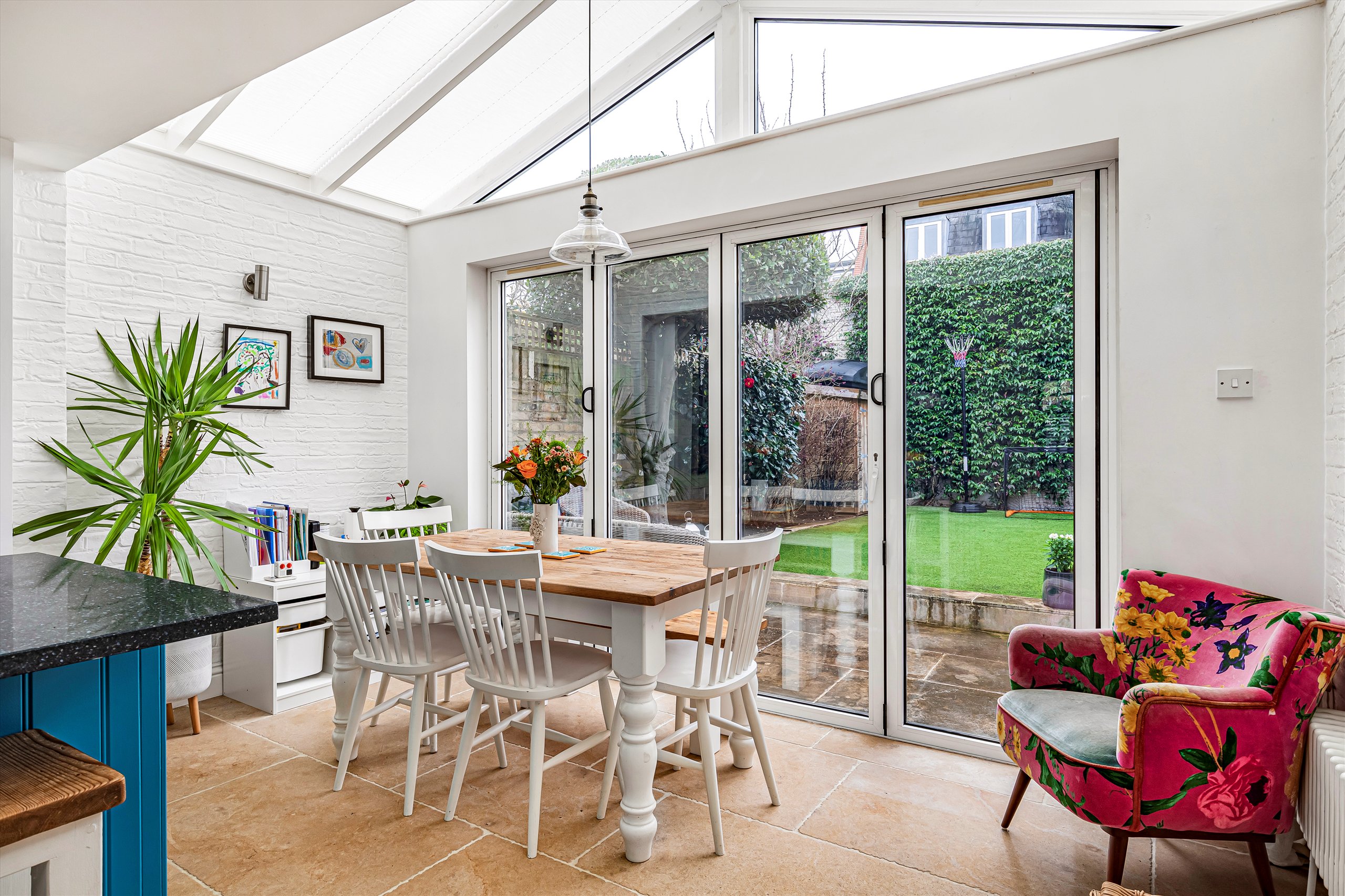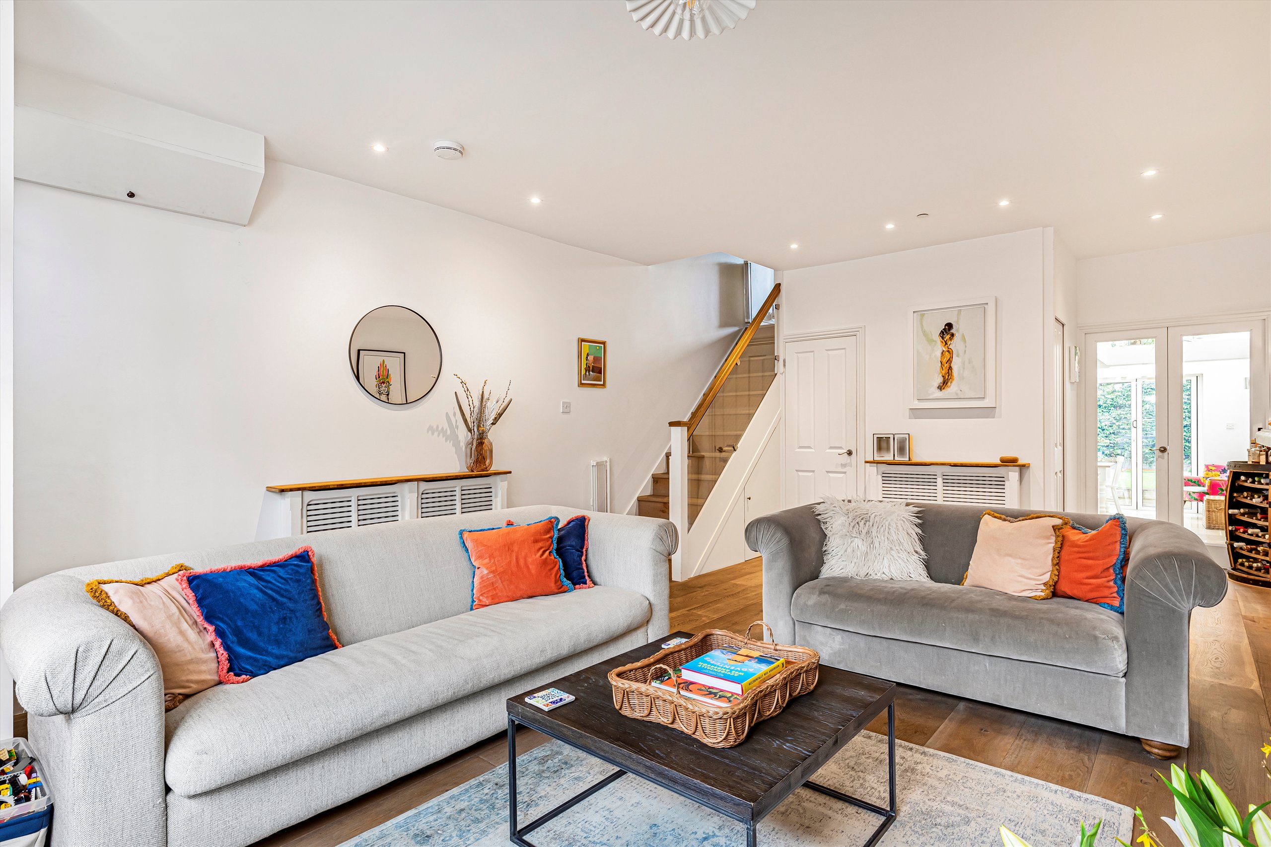 The ground floor features a generous double reception room, with oak flooring, an elegant bay window, and bespoke alcove storage. Leading off the reception room are a practical utility / cloak room and a separate W/C. The space flows into a modern, integrated, open-plan, fitted kitchen with a central island. At the rear is a dining area illuminated by skylights. Full-width bi-fold doors open onto the south-facing garden which enjoys plenty of light, as well as excellent privacy thanks to the high wall at the rear.