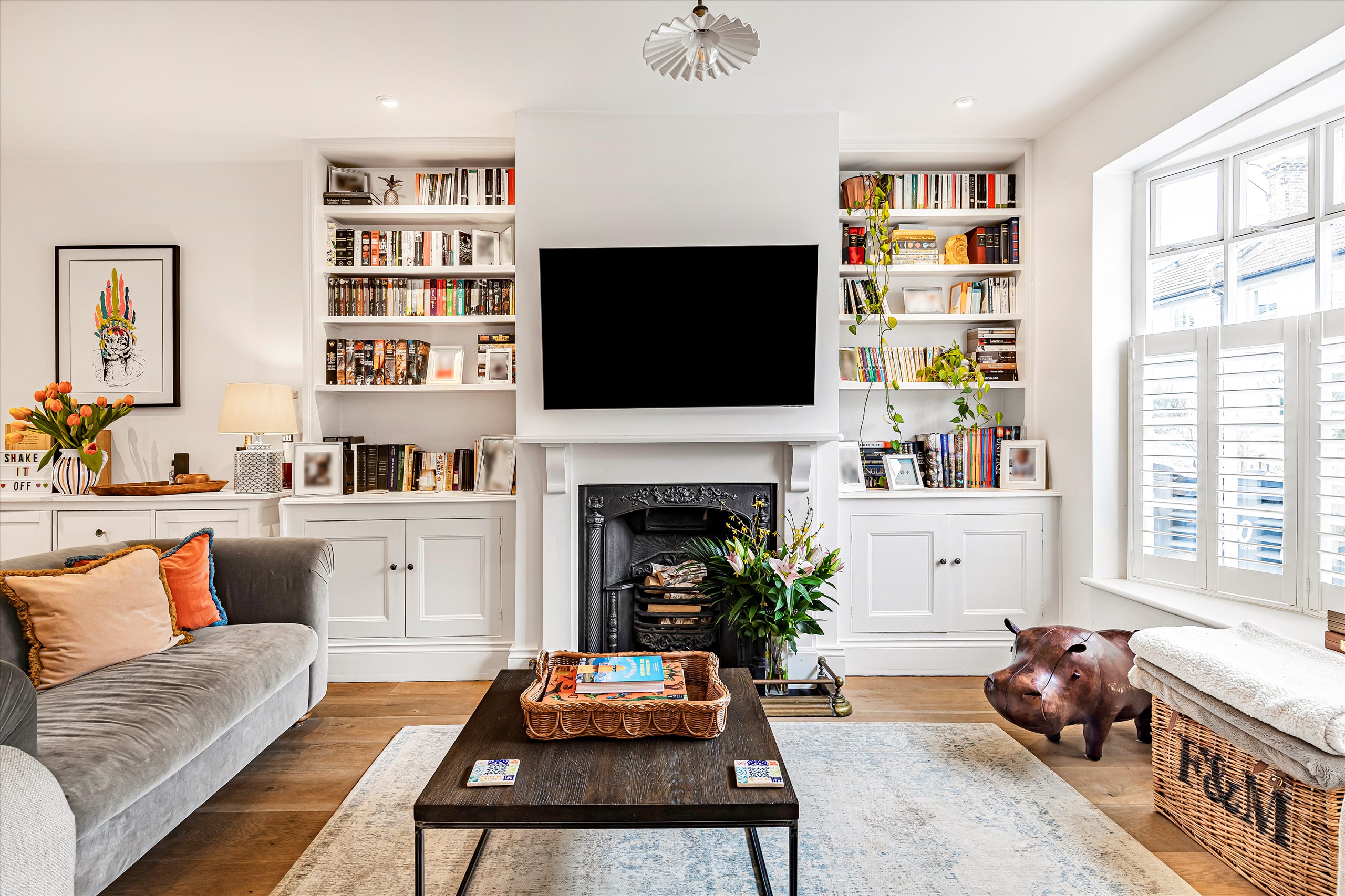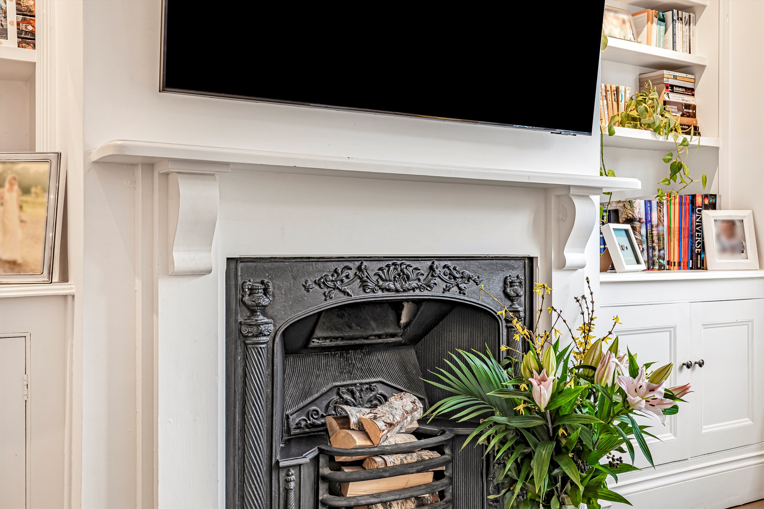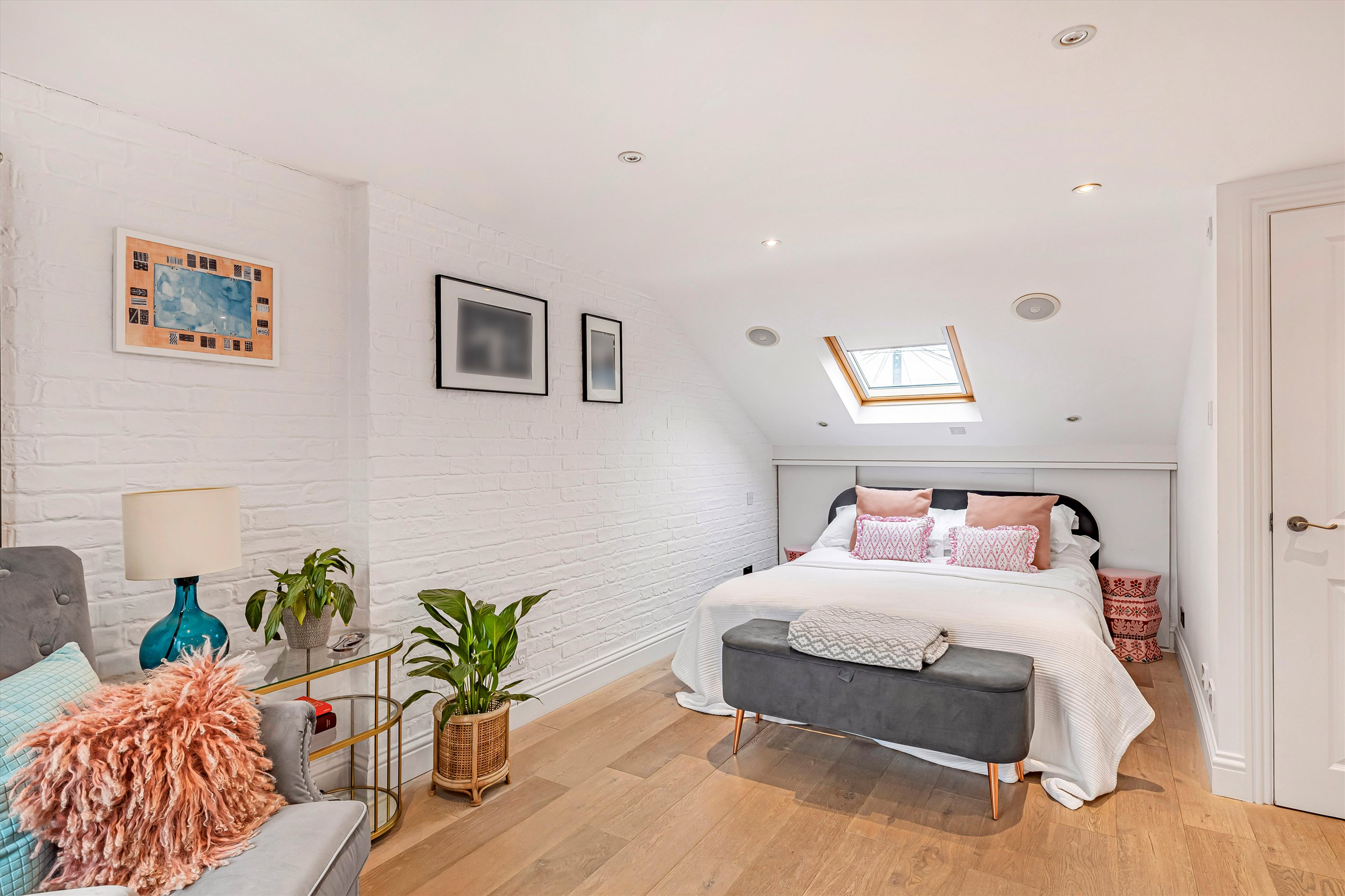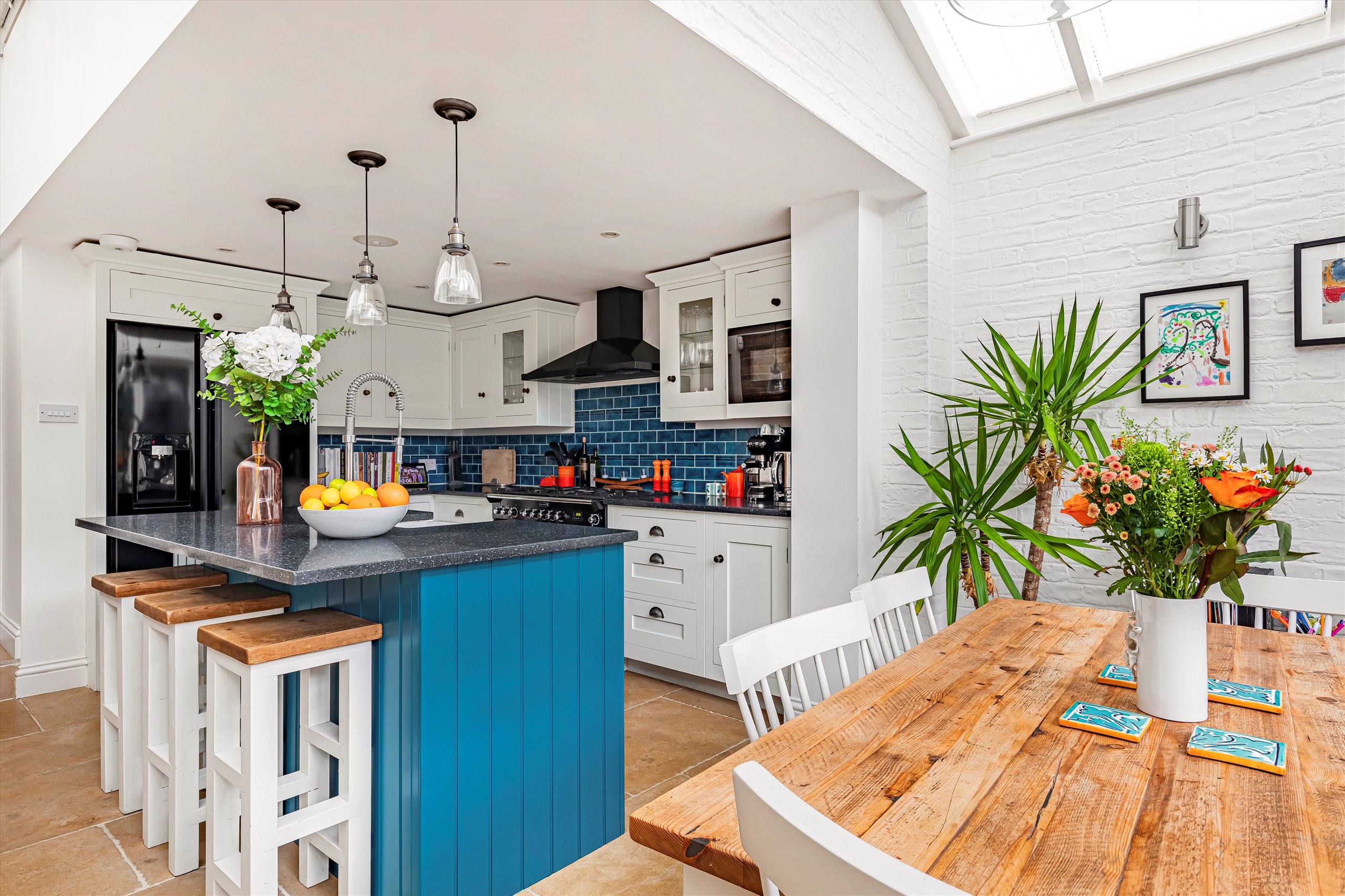 The ground floor features a generous double reception room, with oak flooring, an elegant bay window, and bespoke alcove storage. Leading off the reception room are a practical utility / cloak room and a separate W/C. The space flows into a modern, integrated, open-plan, fitted kitchen with a central island. At the rear is a dining area illuminated by skylights. Full-width bi-fold doors open onto the south-facing garden which enjoys plenty of light, as well as excellent privacy thanks to the high wall at the rear.