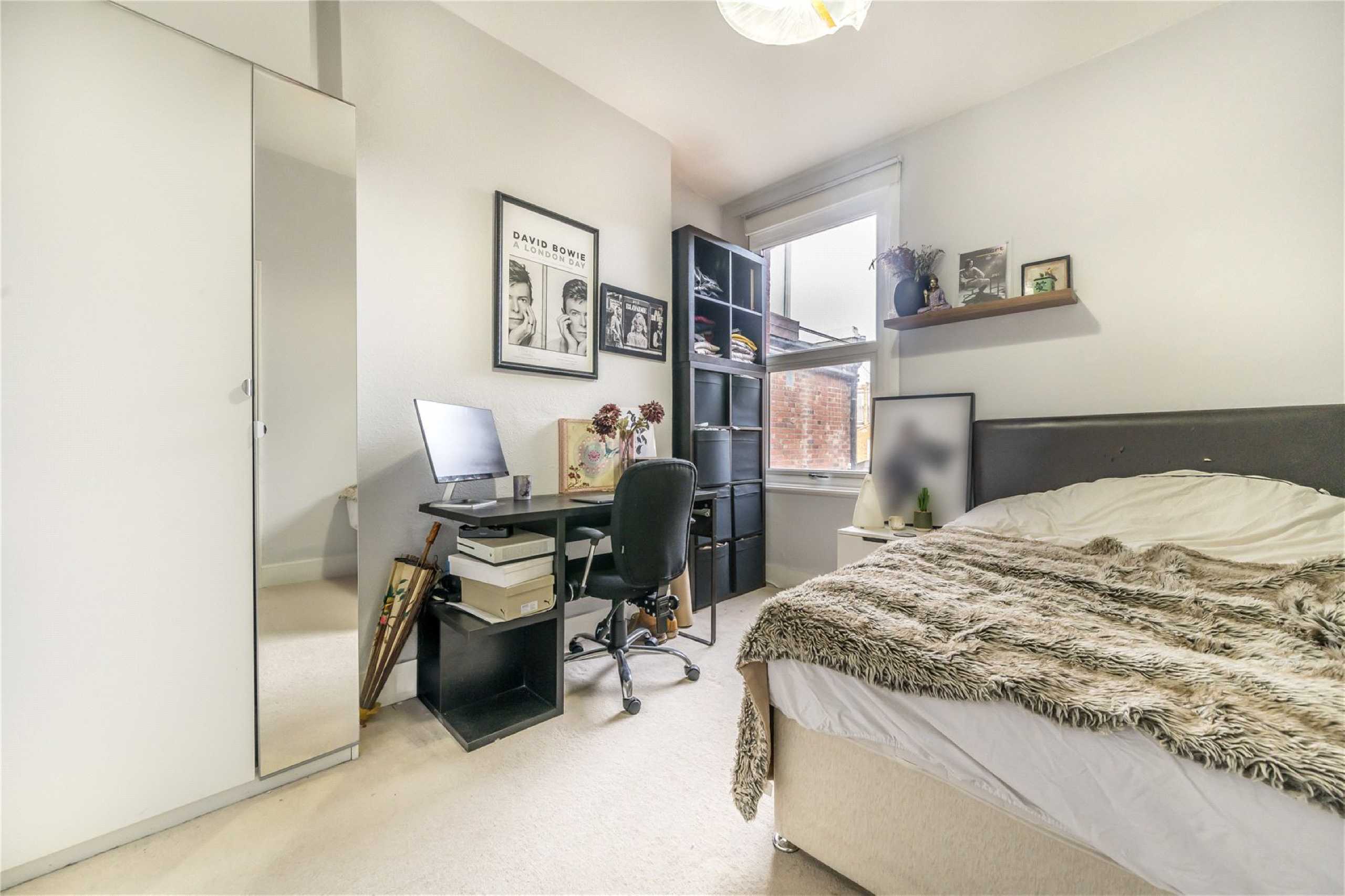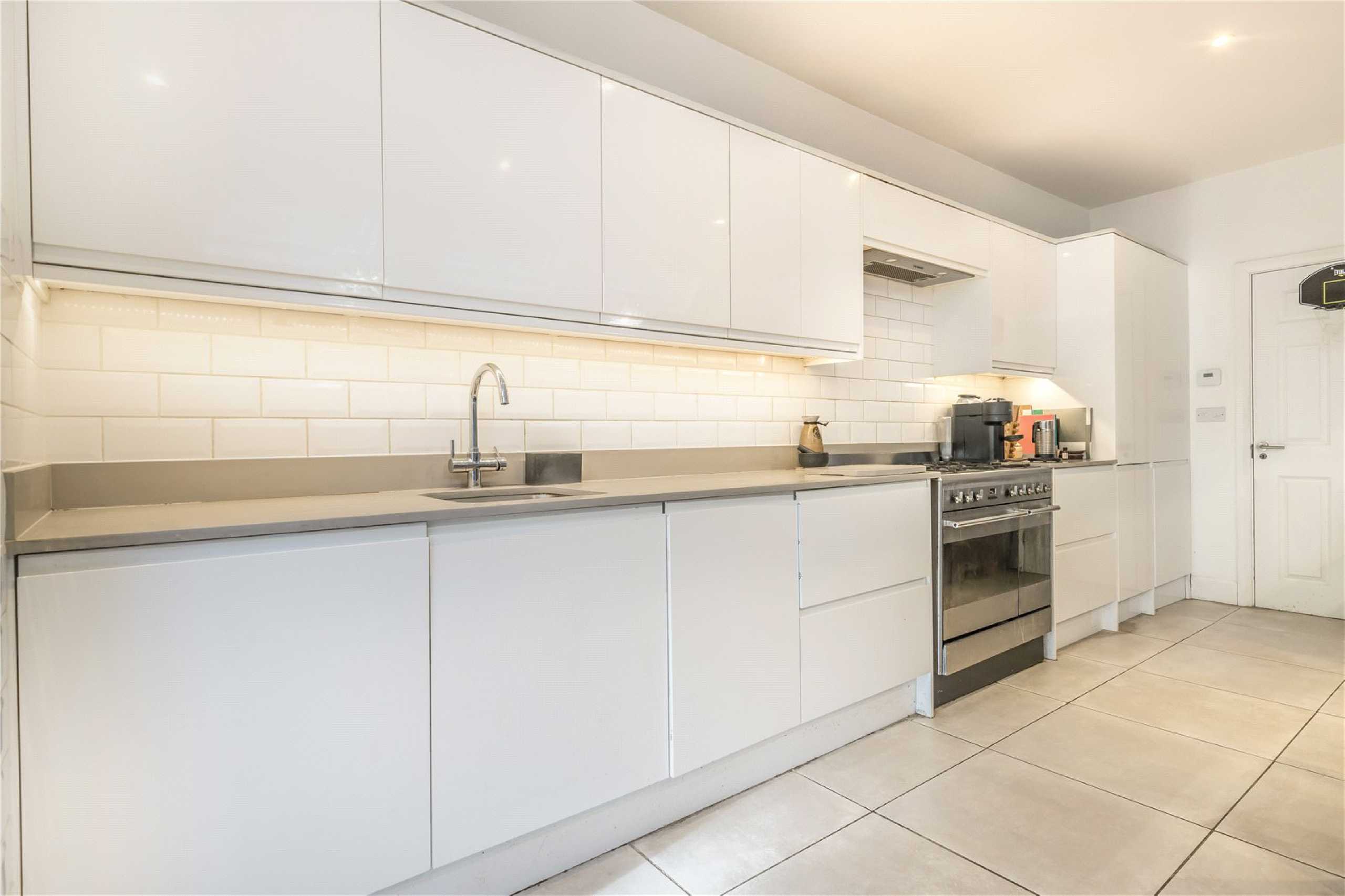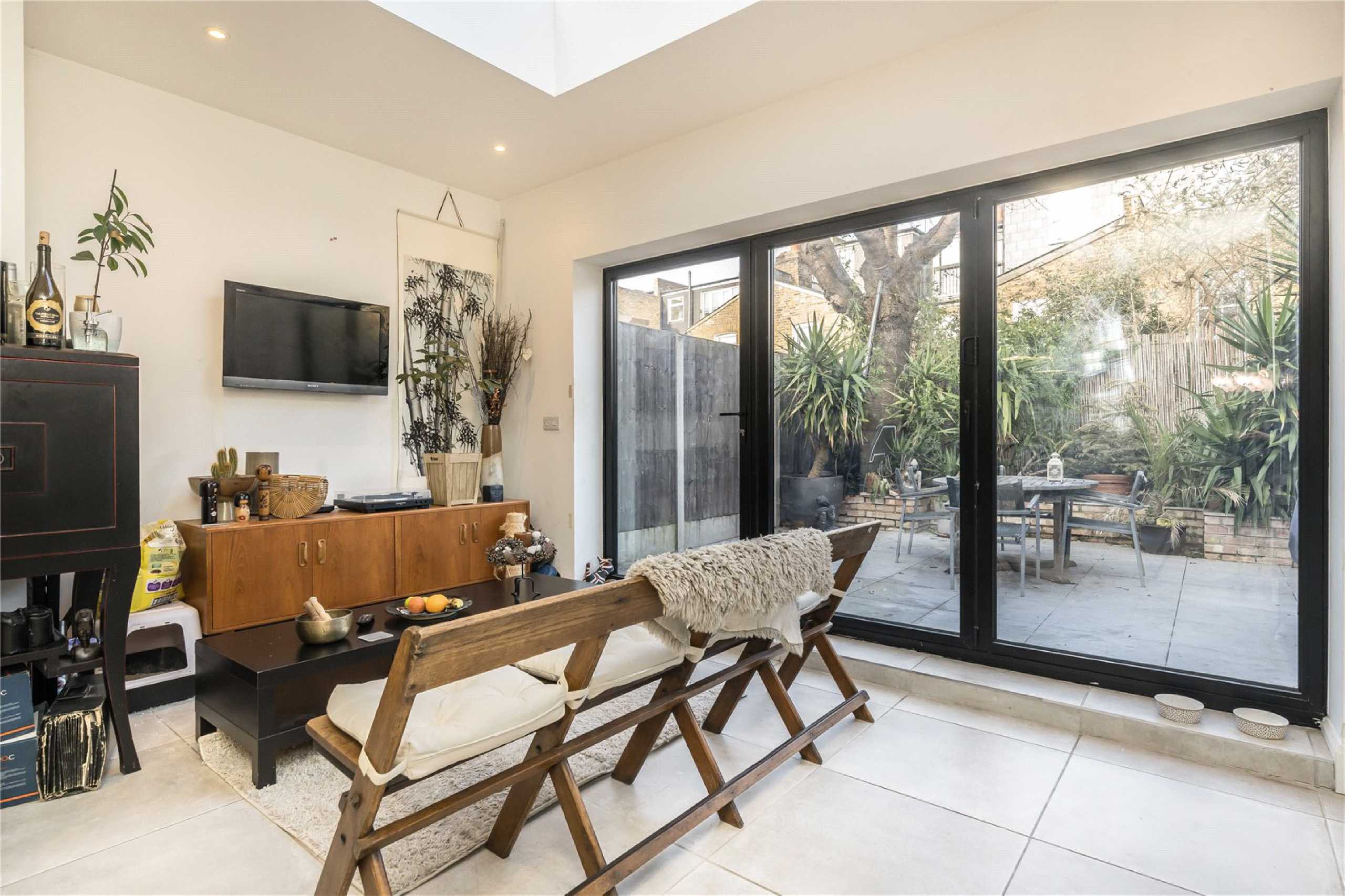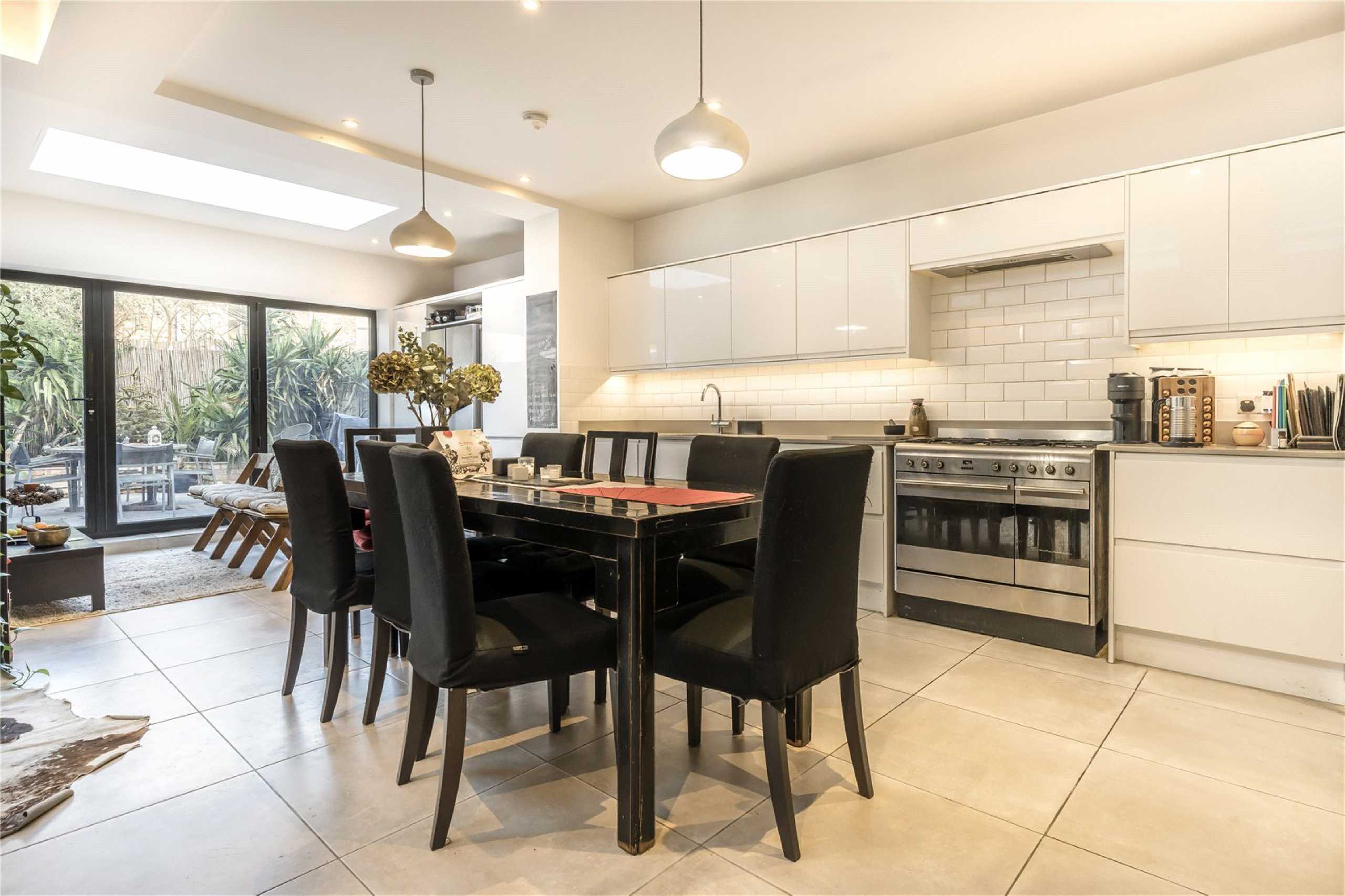 The spacious kitchen offers ample room for dining and flows effortlessly into the reception space beyond. Bathed in natural light from a charming skylight and enhanced by contemporary spot lighting, the room feels bright and welcoming throughout. Striking bifold doors open directly onto a private rear garden, creating a seamless indoor-outdoor connection that is ideal for hosting or unwinding in warmer months. Underfloor heating in the kitchen adds an extra layer of comfort and practicality.