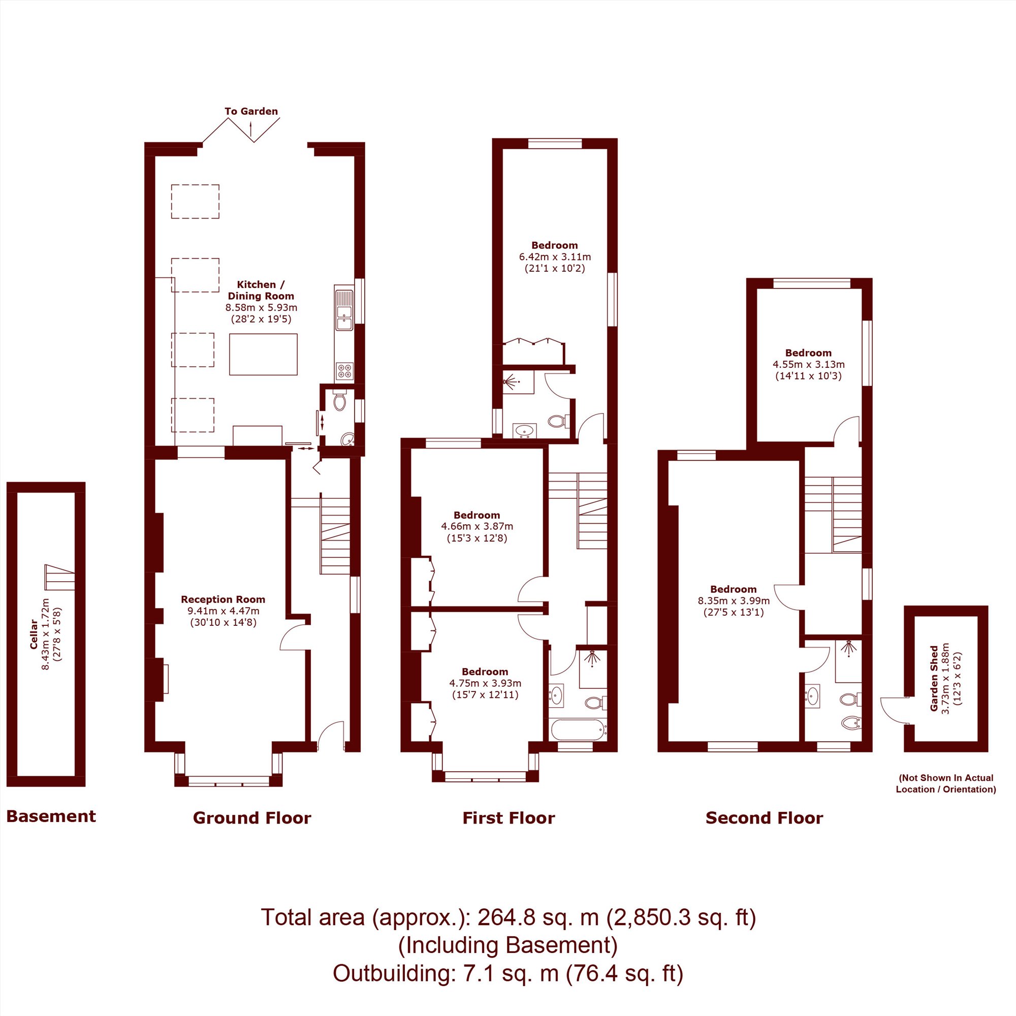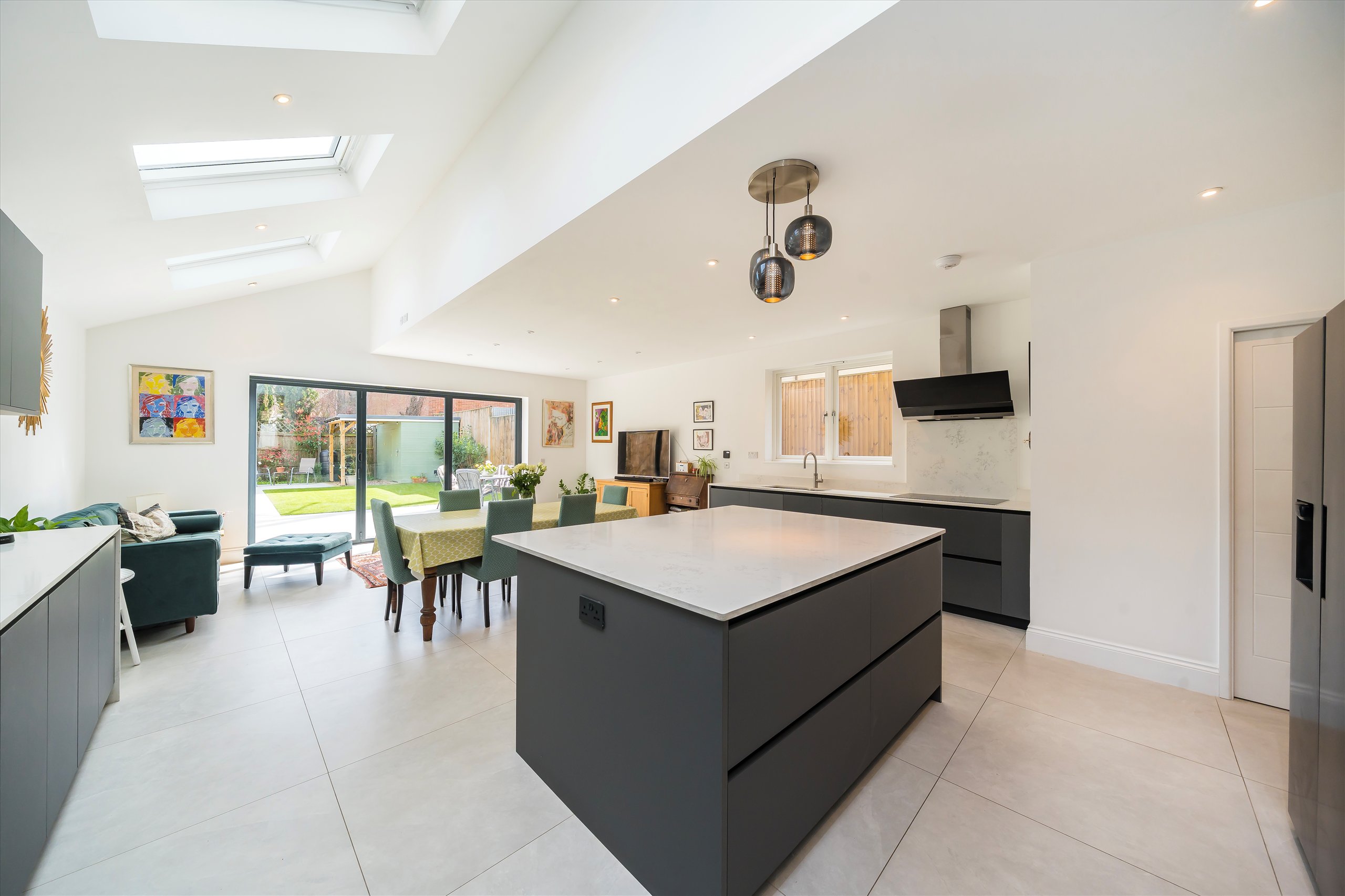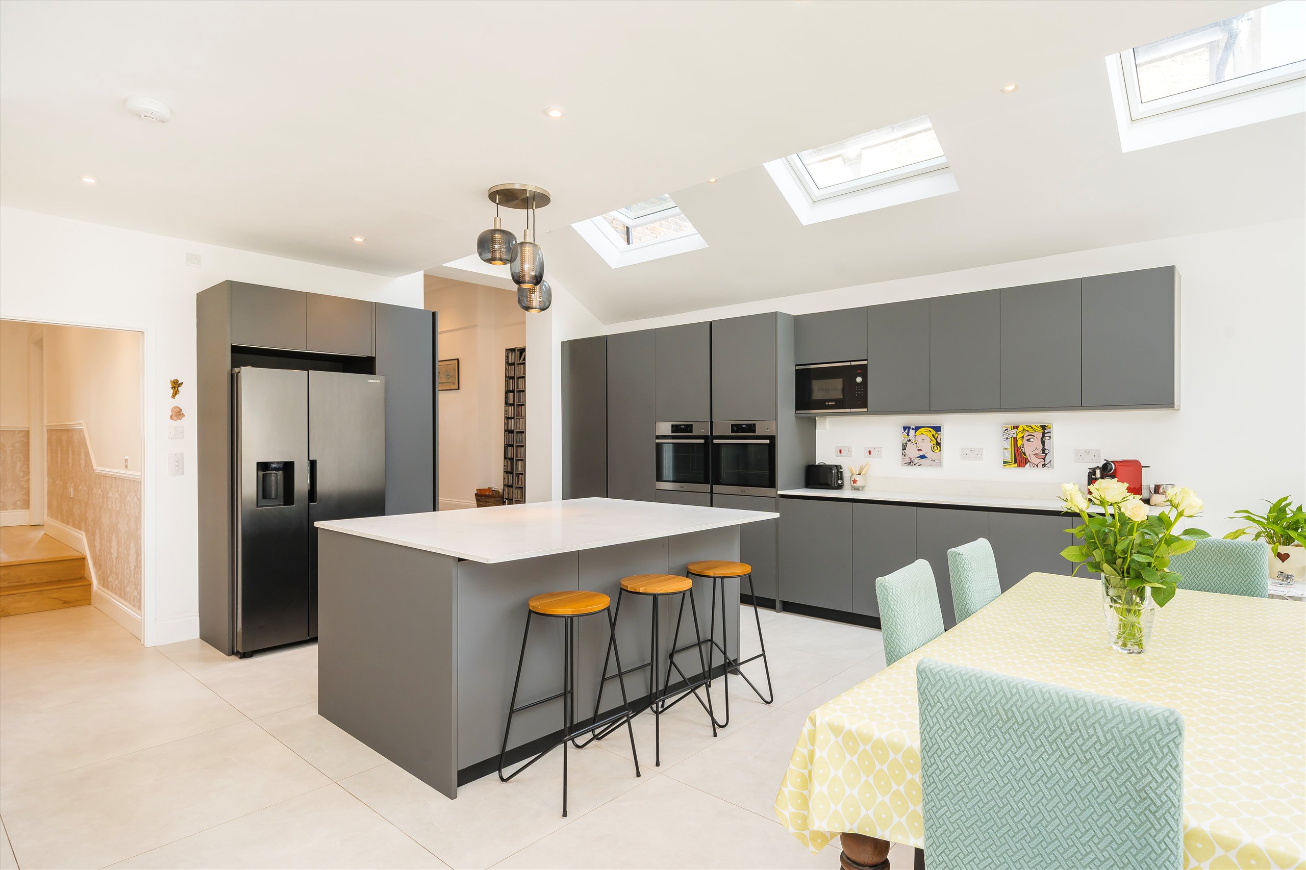 An inviting entrance hall greets you, with beautiful wood flooring running through into the generous double reception room, with 3m high ceilings and a feature fireplace. To the rear, a vast kitchen/family room offers a generous dining area and open-plan TV area. The kitchen itself is sleek and modern and features a central island, high quality worktops and integrated appliances. The entire ground floor has under floor heating. There is also a cloakroom/WC on the ground floor, useful cellar and handy side access to the house. The garden is attractively planted, has two separate porcelain patios and an area for outdoor dining. It has a powered out building and receives excellent natural light. The first floor has three double bedrooms, with fitted wardrobes served by two bathrooms. The second floor has a substantial, double aspect, principal bedroom with vaulted ceiling, en-suite bathroom and a fifth bedroom.