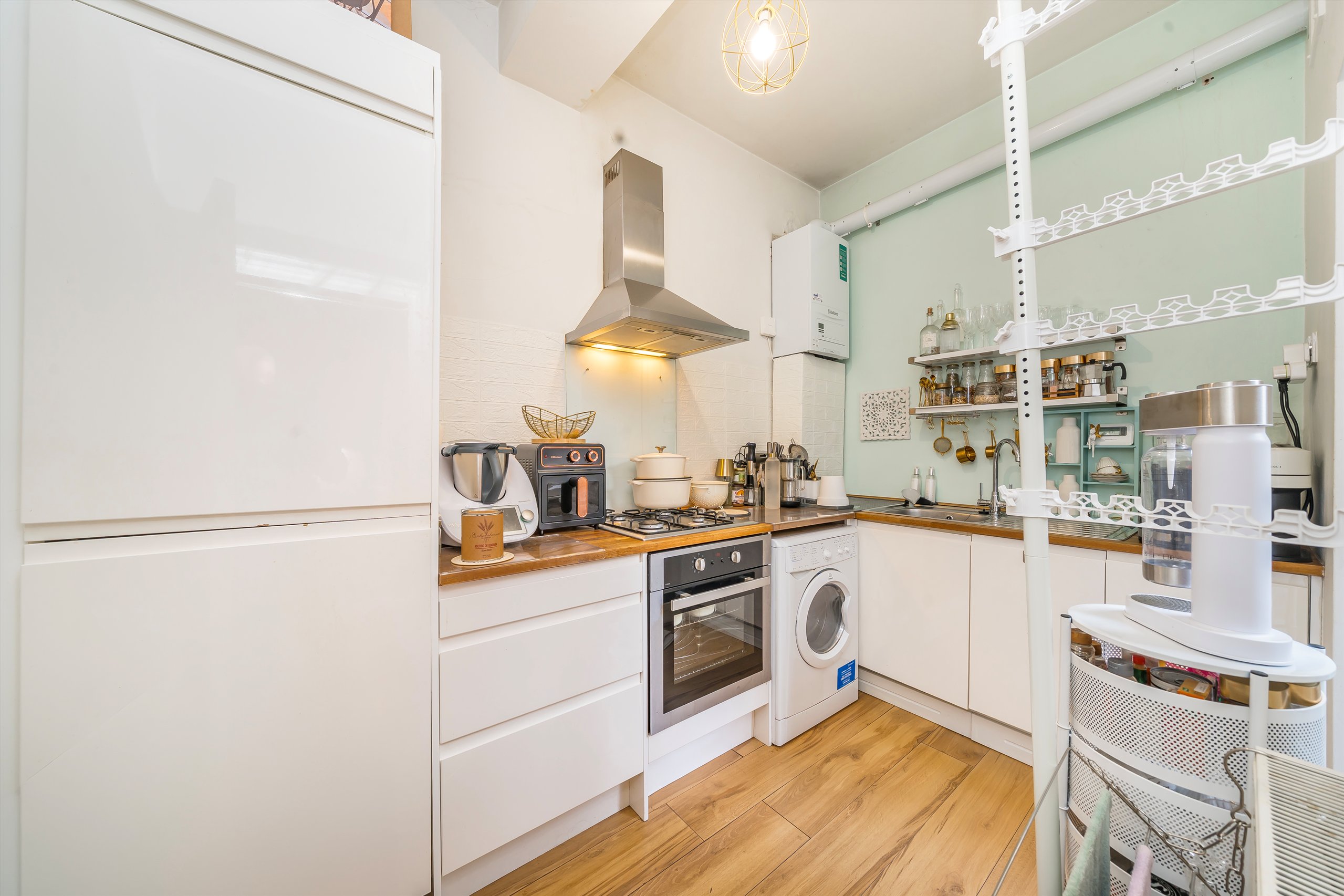 The apartment features a bright and well-proportioned reception room with high ceilings, elegant period detailing, and large windows that invite in plenty of natural light. The separate kitchen is thoughtfully designed with contemporary fittings and integrated appliances, making it both stylish and functional.