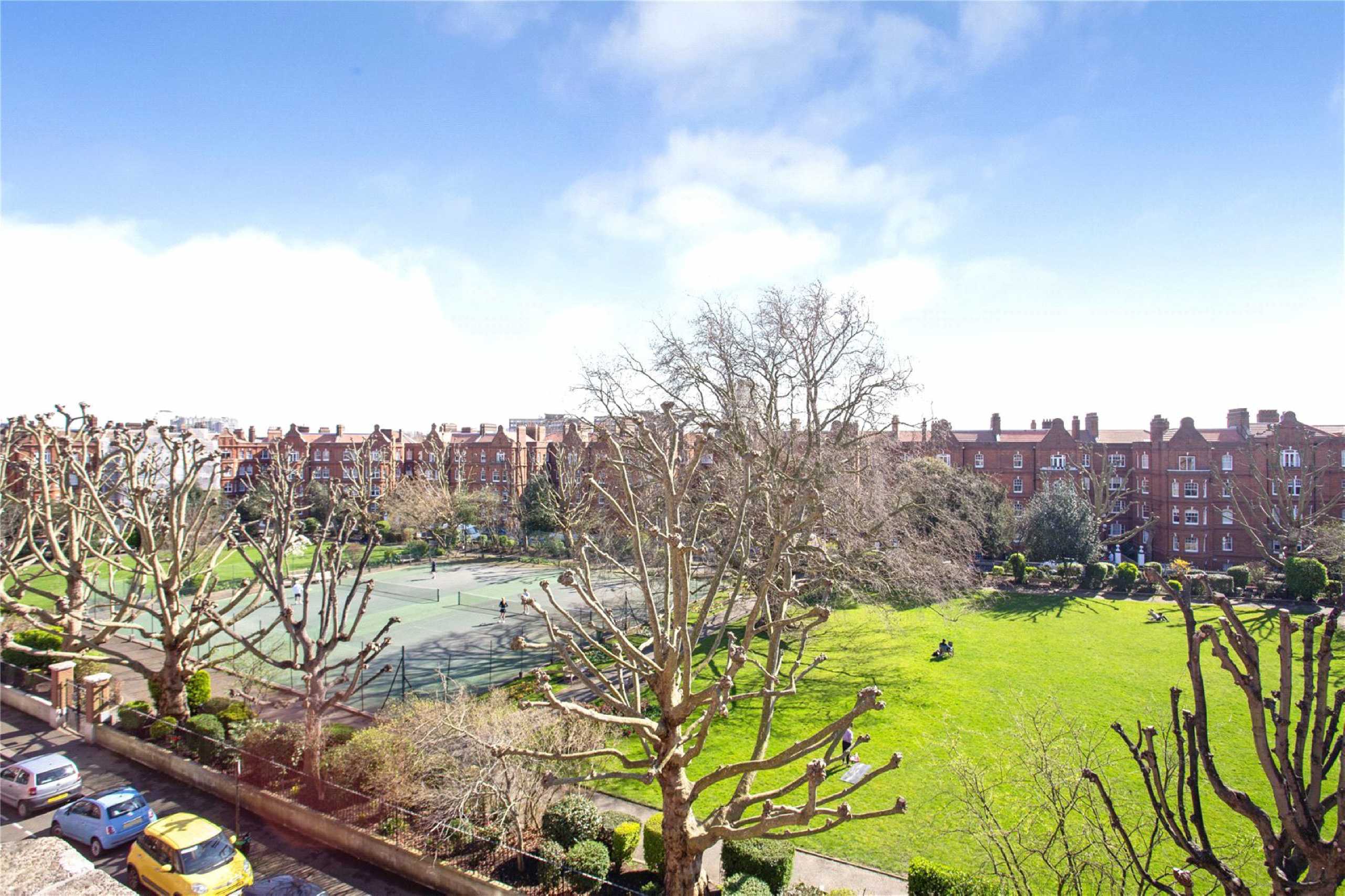 The apartment offers excellent ceiling heights and a well-balanced layout, featuring a bright reception room with an elegant triple sash bay window, an eat-in kitchen, and three comfortable bedrooms. Large windows throughout ensure excellent natural light across all principal rooms. Residents benefit from access to beautifully maintained communal gardens and private tennis courts, along with the convenience of an on-site estate office providing day-to-day management and support as part of the service charge.The location is particularly appealing, moments from the internationally renowned Queen's Club and close to the vibrant Barons Court Theatre, adding a strong sense of local community and cultural character. A selection of independent cafés, restaurants and everyday amenities are all within easy reach.