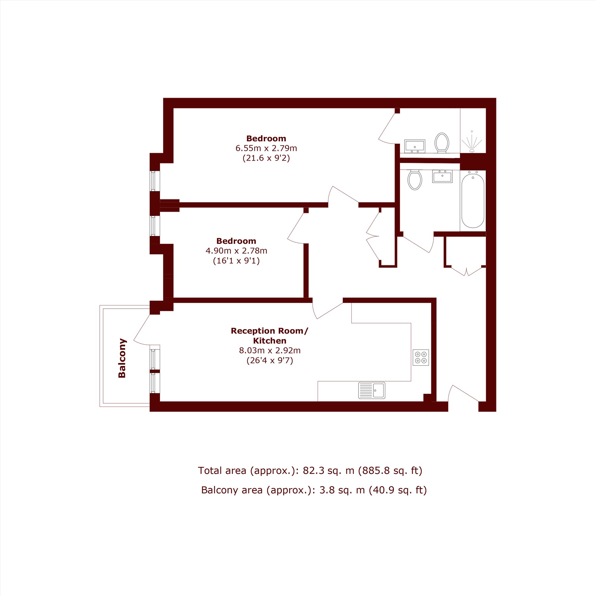 This move-in ready property features a spacious open-plan living area with access to a private balcony, a modern kitchen, and two generously sized bedrooms, including a master bedrooms with an en-suite. A second bathroom adds further convenience.