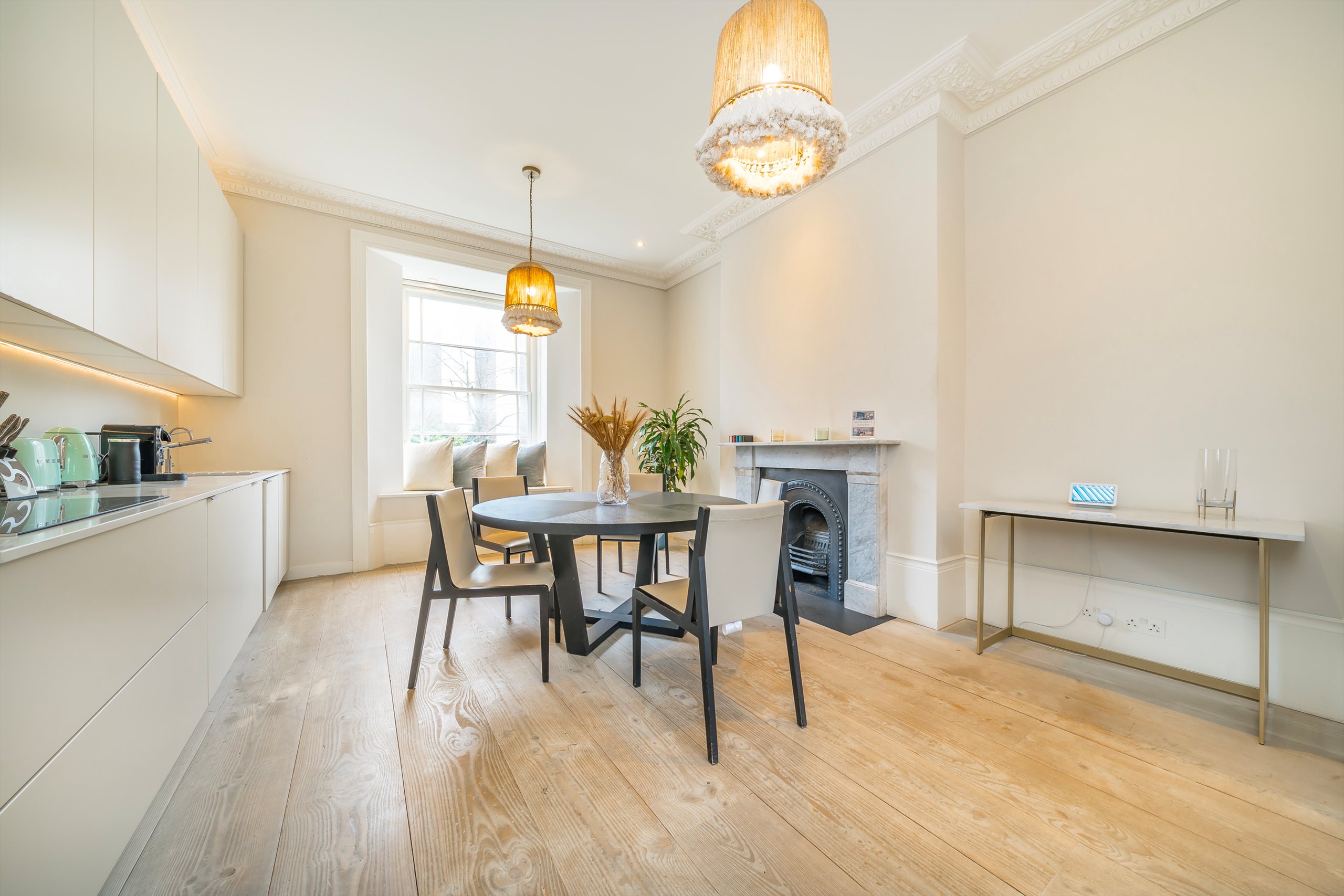 The accommodation boasts a fabulous, wide reception room with a cast-iron fireplace and french doors leading to a private balcony. To the front of the property there is a contemporary designed eat-in kitchen, providing ample dining space, as well as an additional fireplace. Furthermore, there is a generously proportioned bedroom with beautiful bay windows into a bright westerly aspect, a large walk-in wardrobe, smartly finished en suite bathroom, an additional WC and a separate utility/storage room which is demised to this apartment.