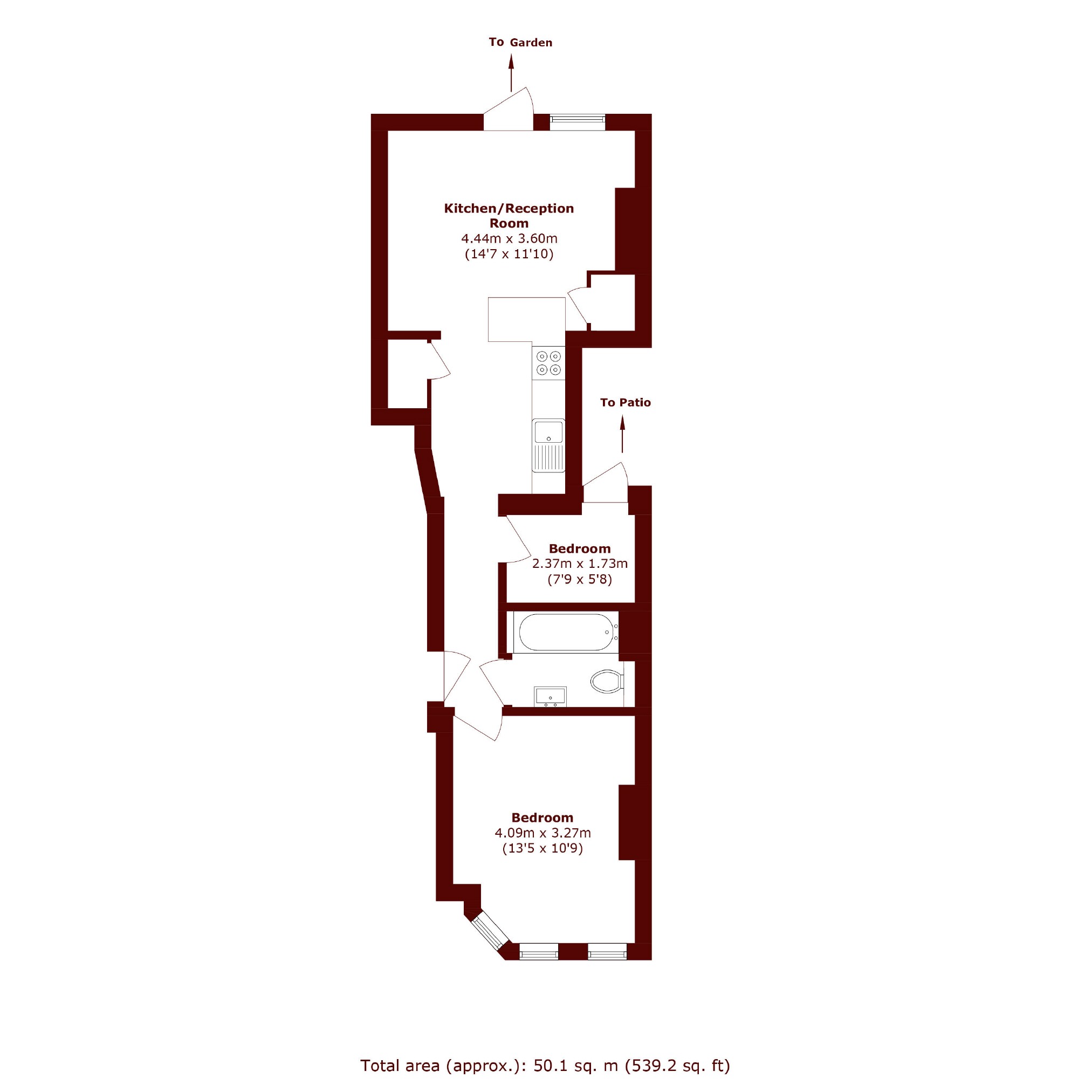 A superb, two-bedroom garden flat arranged over 539sqft, comprising a semi-open plan kitchen/reception room with direct access to a lovely private garden, principle bedroom with bay window, second bedroom which makes an ideal office or single room, and a three-piece family bathroom.