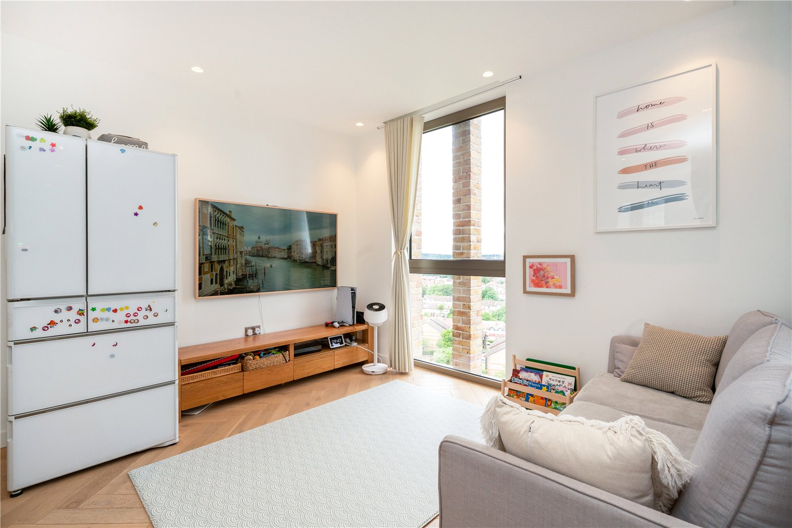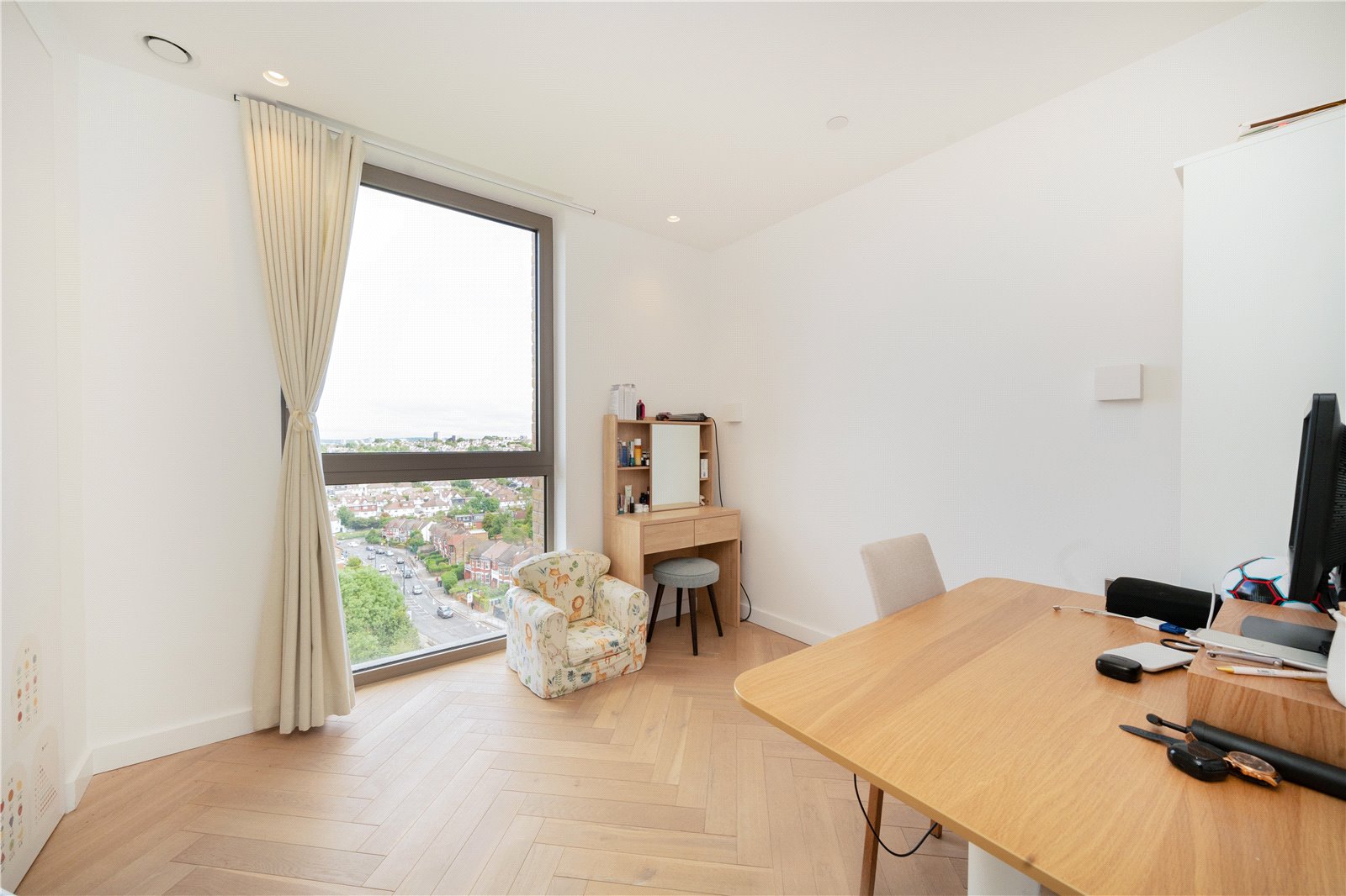 This eighth floor apartment is arranged over 994sqft and comprises a large, open-plan kitchen/living space with integrated appliances and direct access to a private balcony, three bedrooms, a three-piece family bathroom, an en suite bathroom and ample storage space. The apartment benefits from access to a swimming pool and fitness studio.
