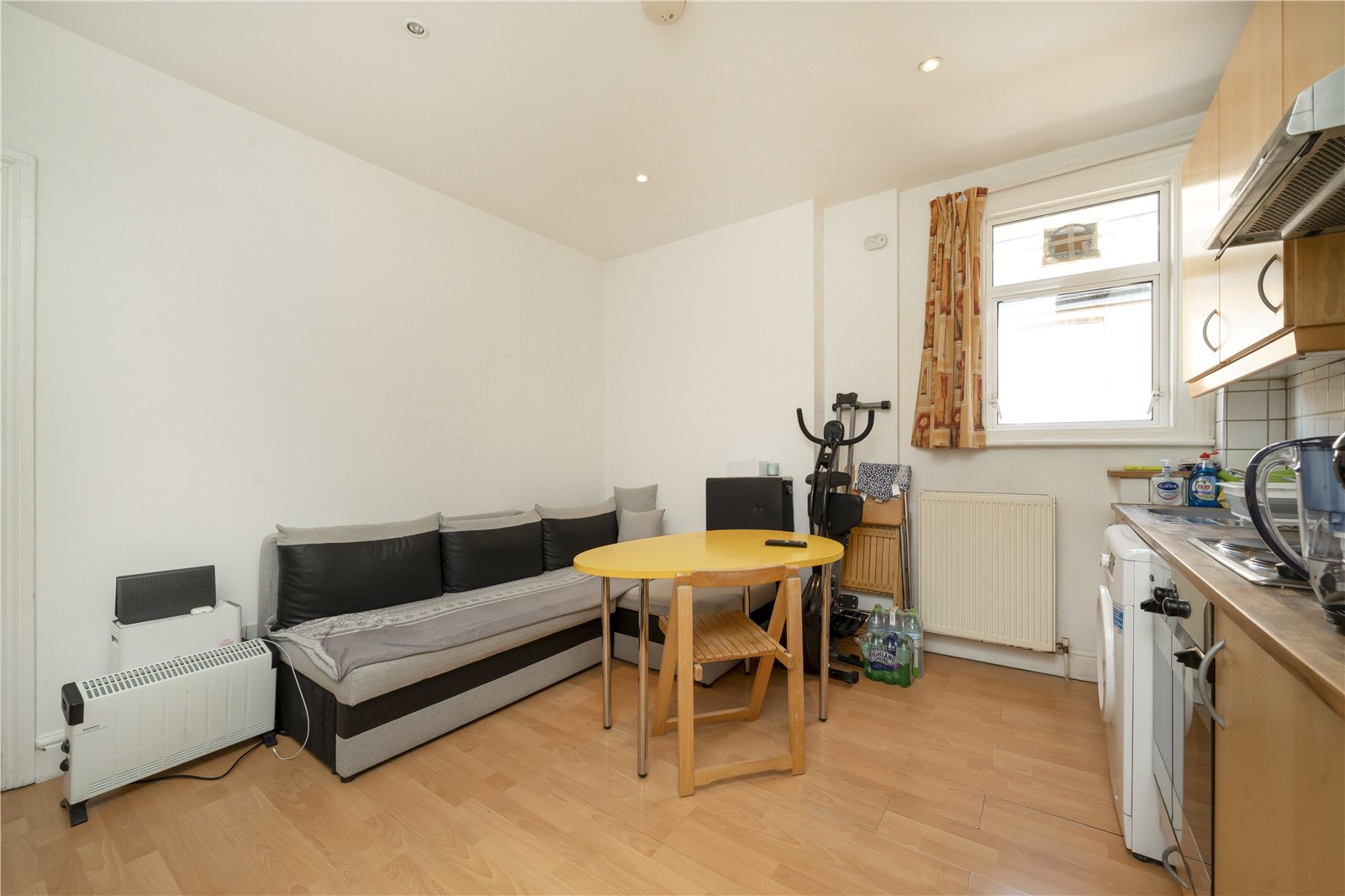 This bright, one-bedroom apartment is situated on the top floor of a period building, comprising an open plan kitchen/living room, double bedroom and three-piece bathroom with walk-in shower.
