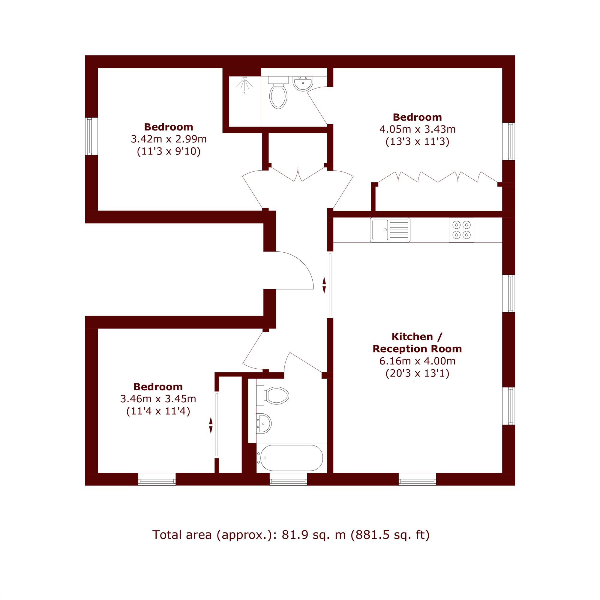 Exceptional three bedroom apartment finished to an outstanding standard, featuring wood floors, a stunning open-plan kitchen and reception, three generous double bedrooms, a stylish en-suite to the principal bedroom, and a family bathroom.