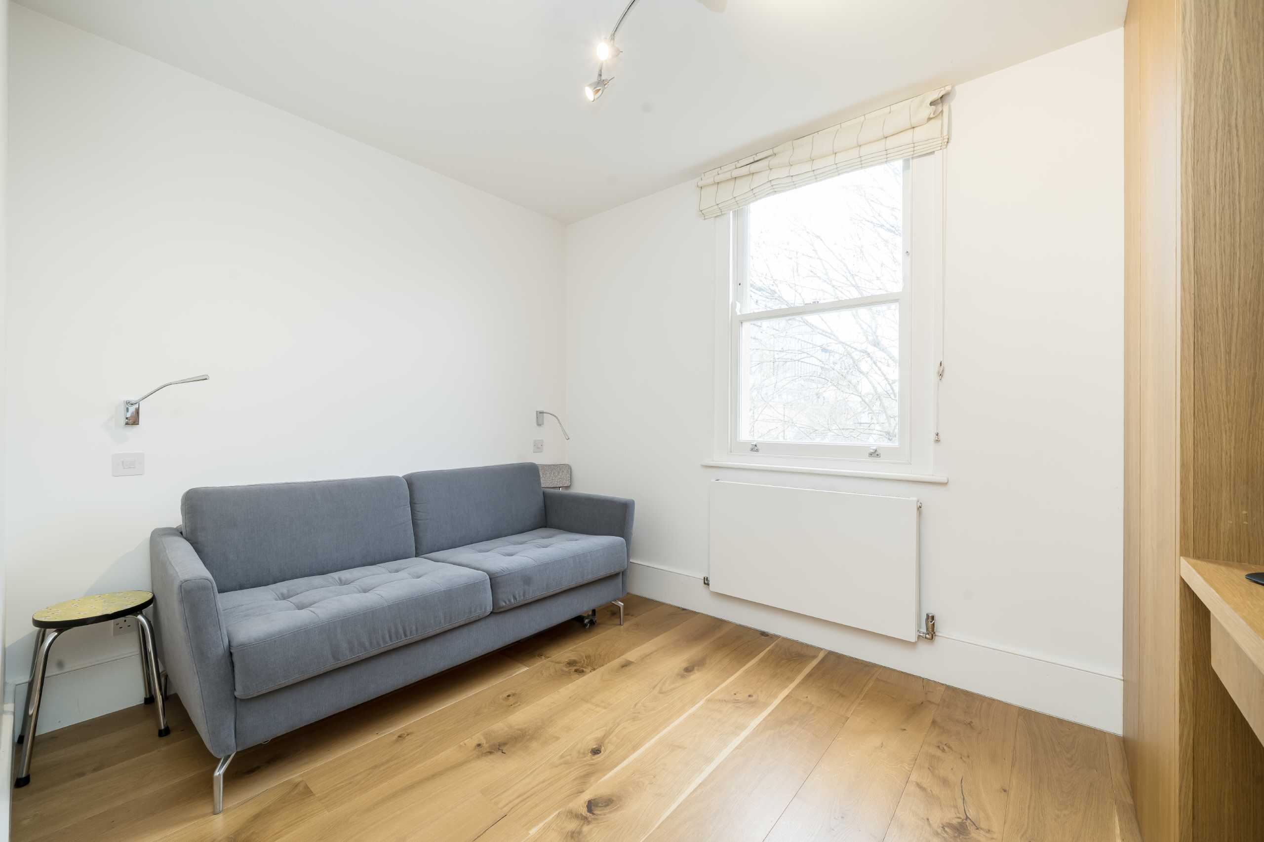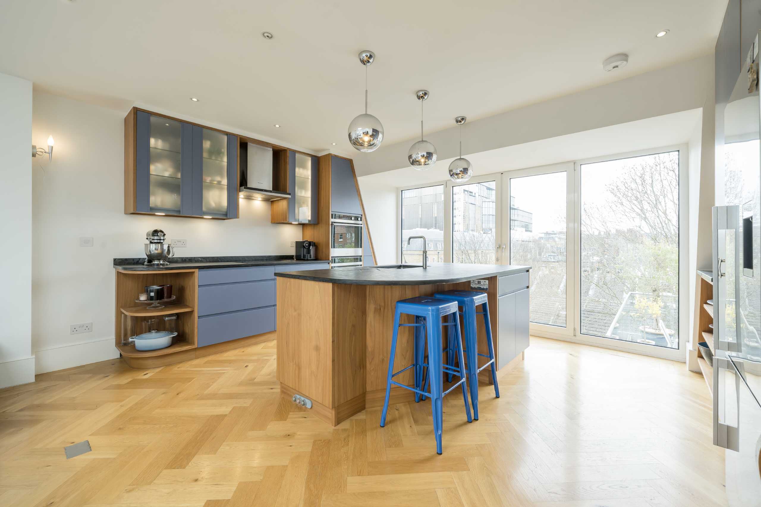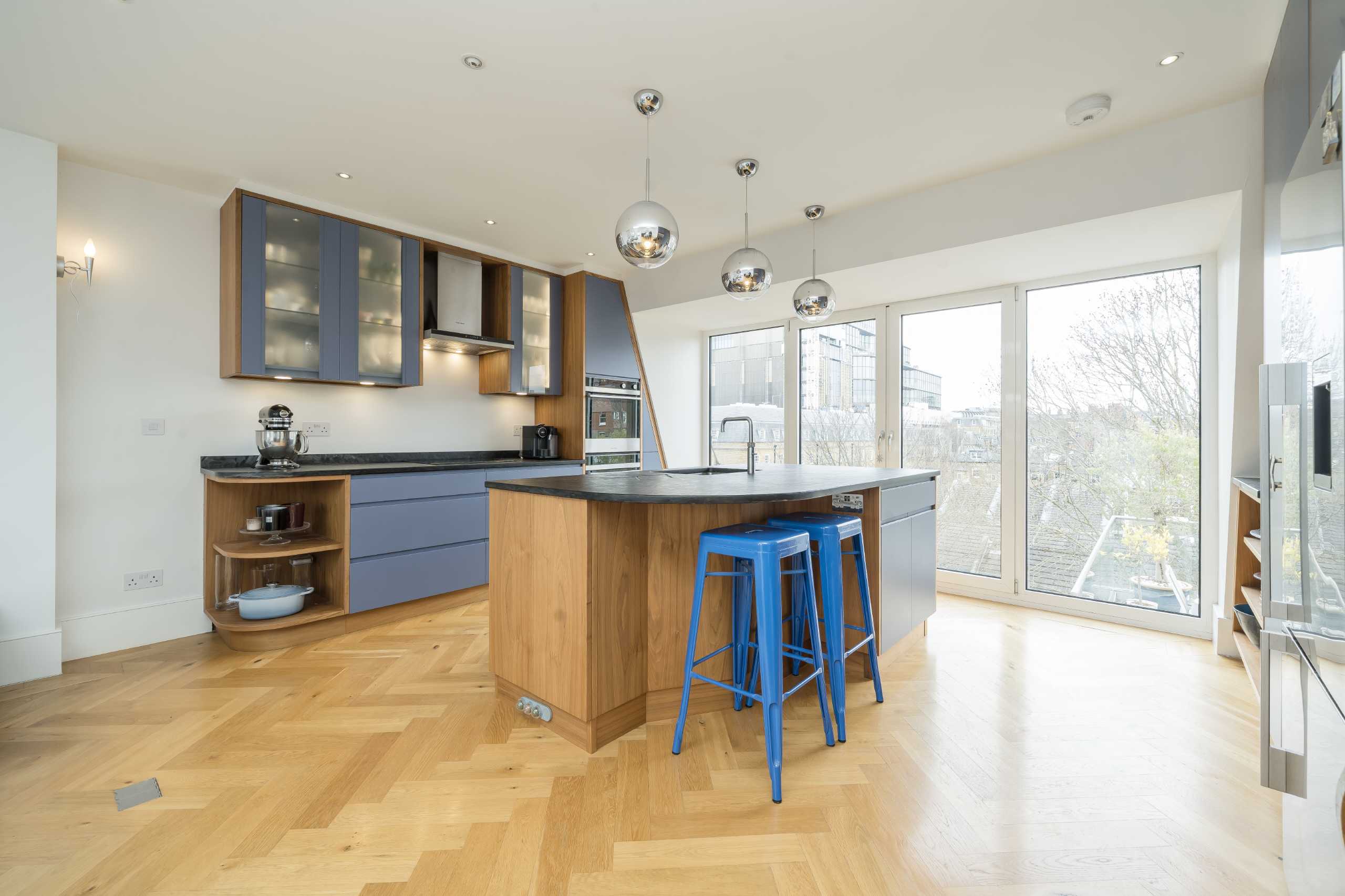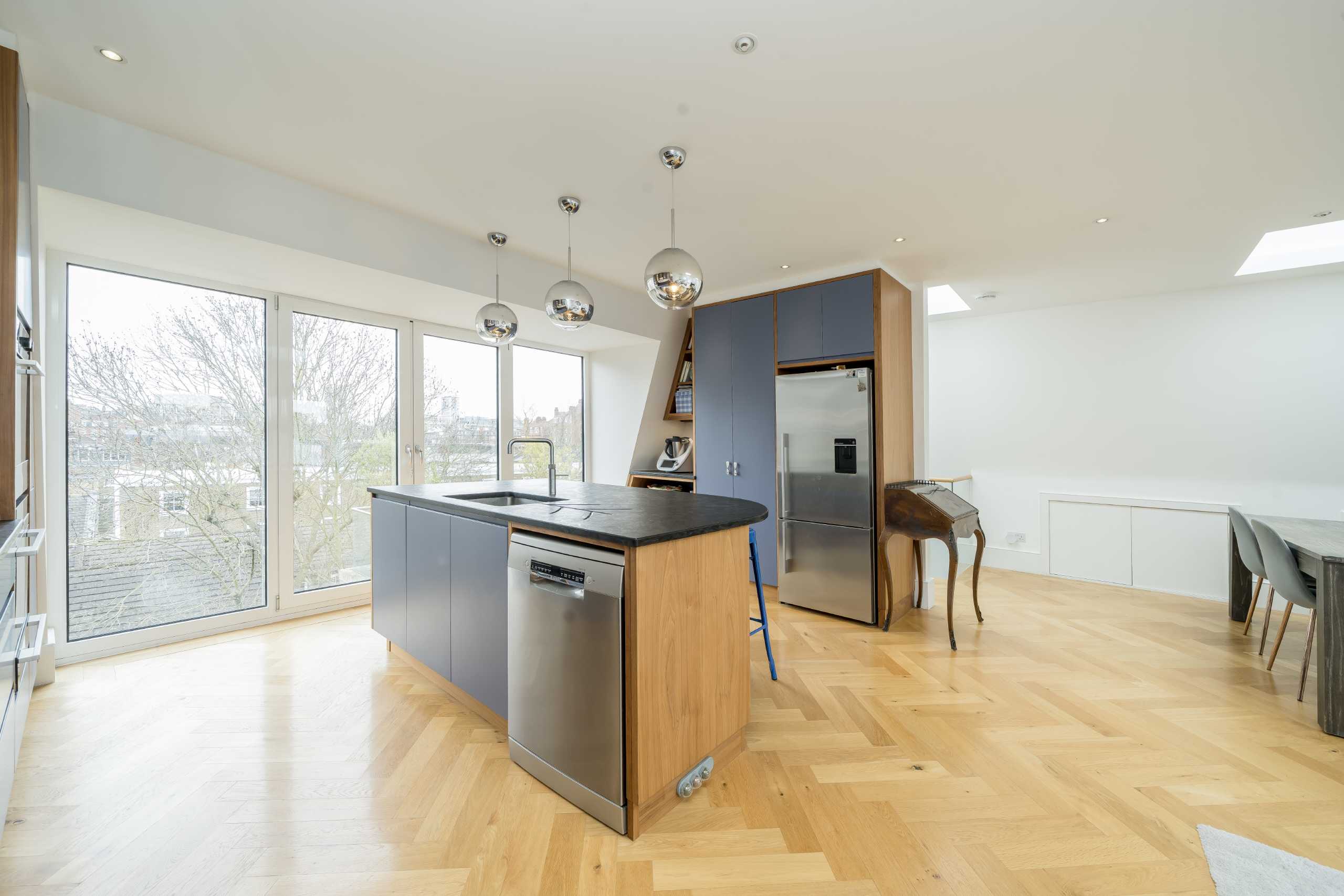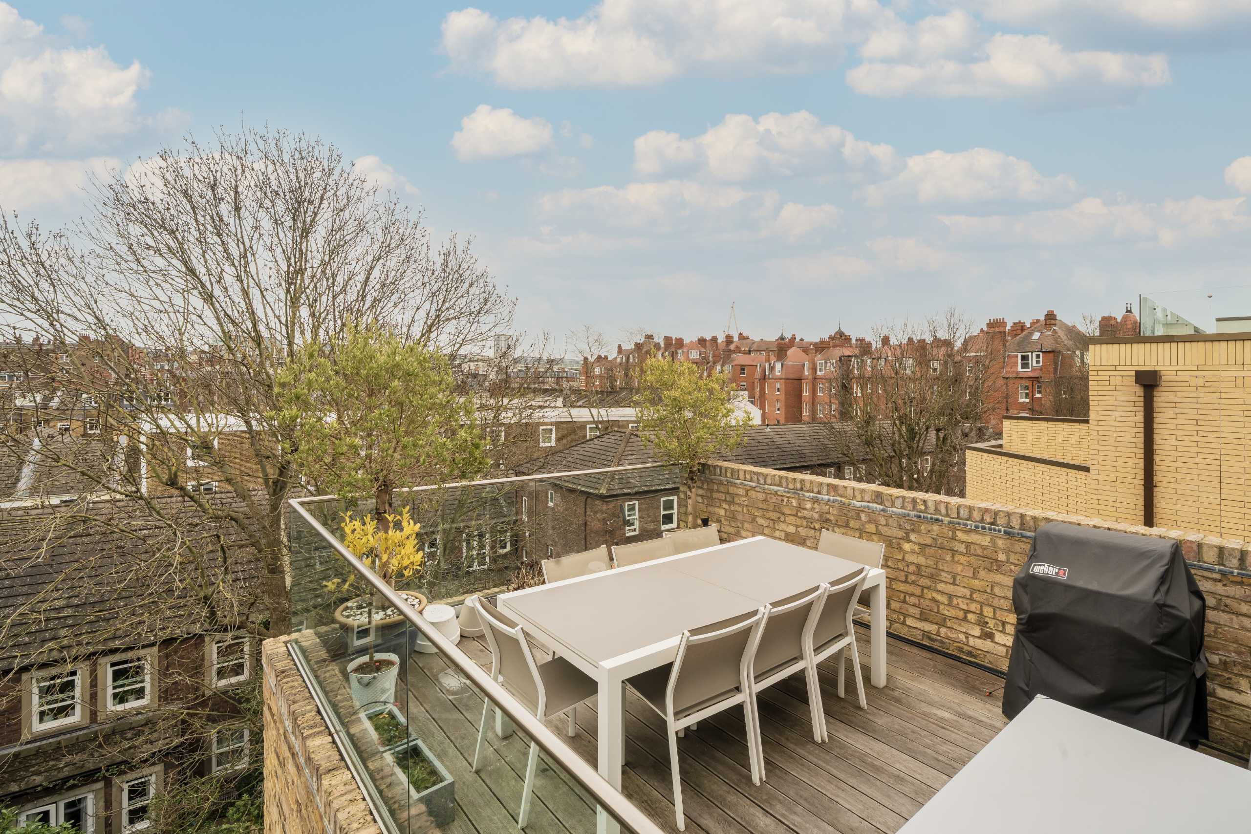 The landing between the second and third floor allows access, via a full length glass door, to a private decked terrace that has lovely views over London. On the third floor is a large lateral open plan kitchen and reception