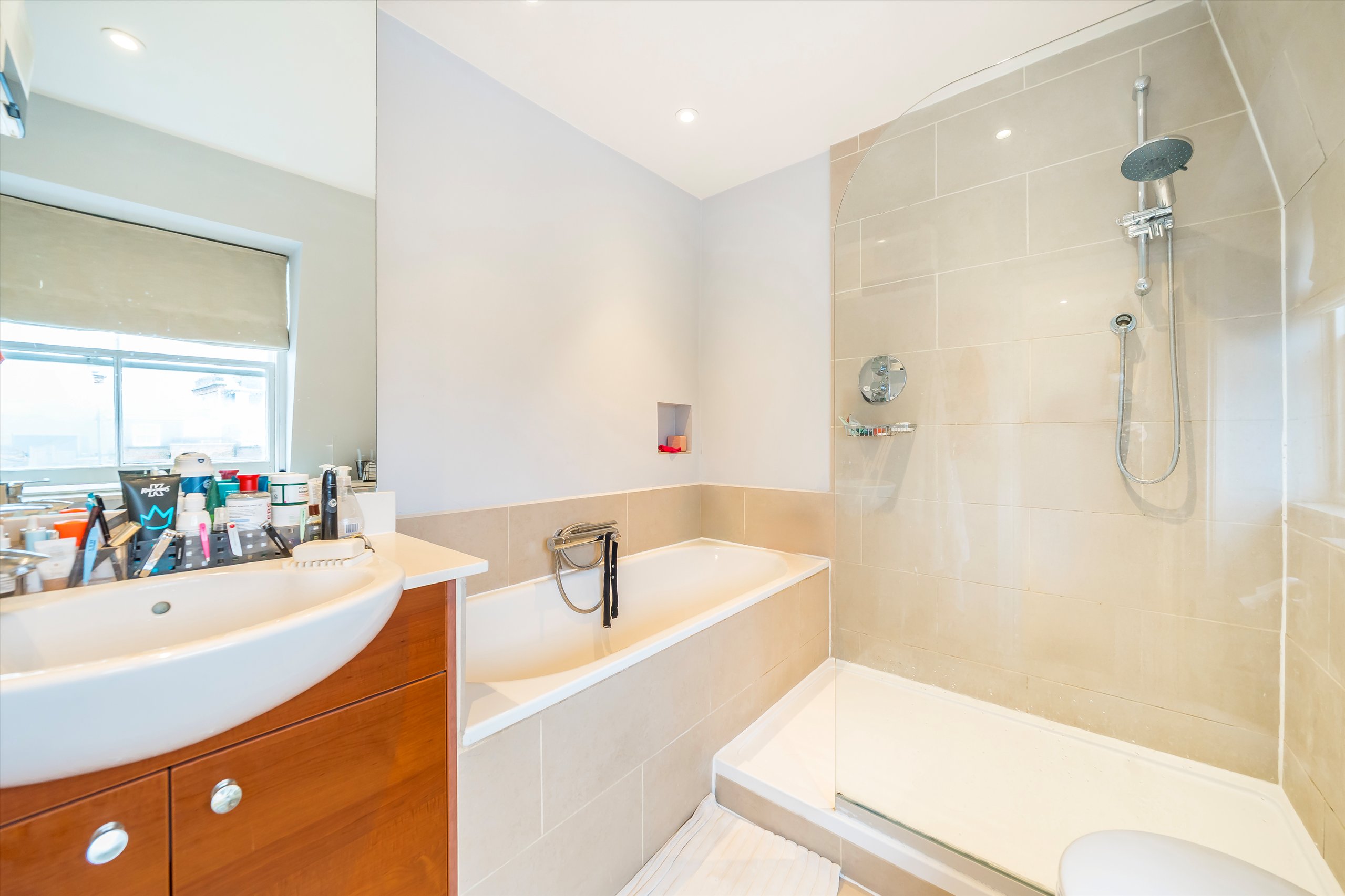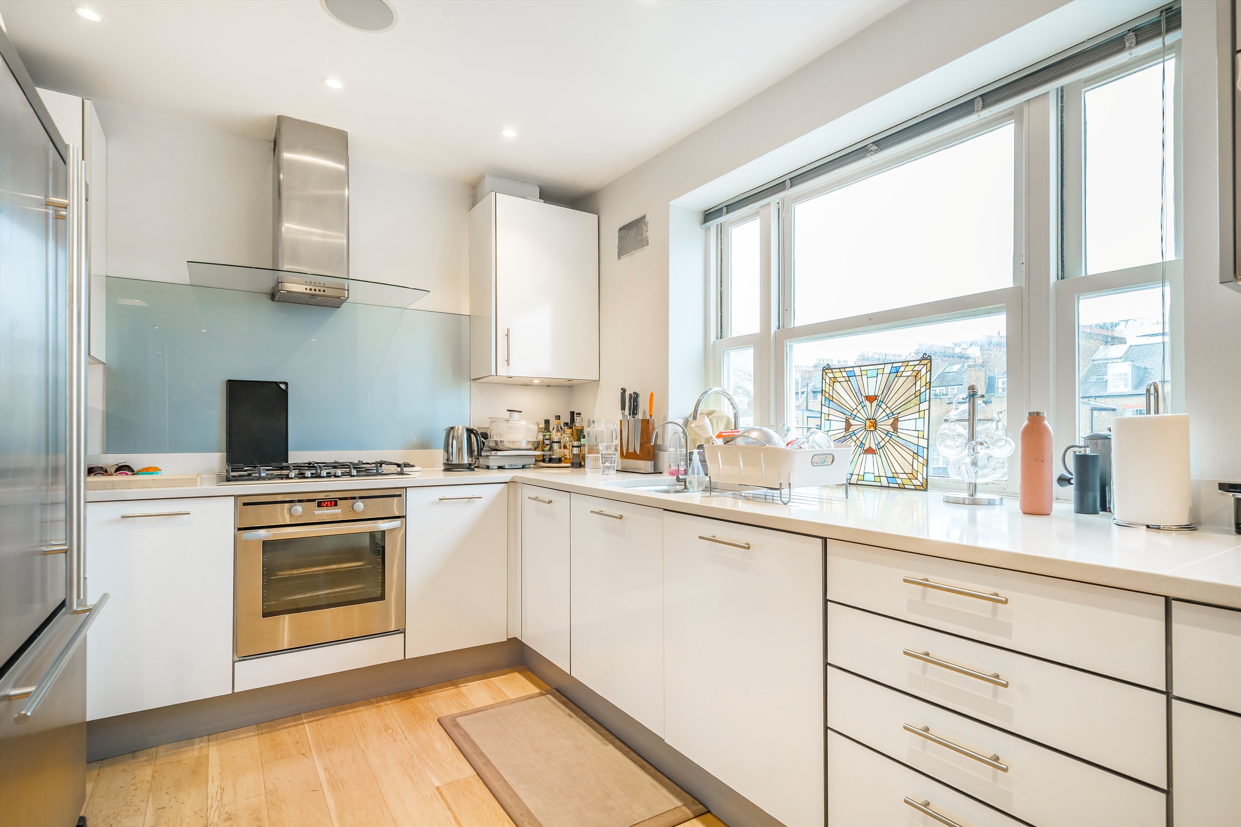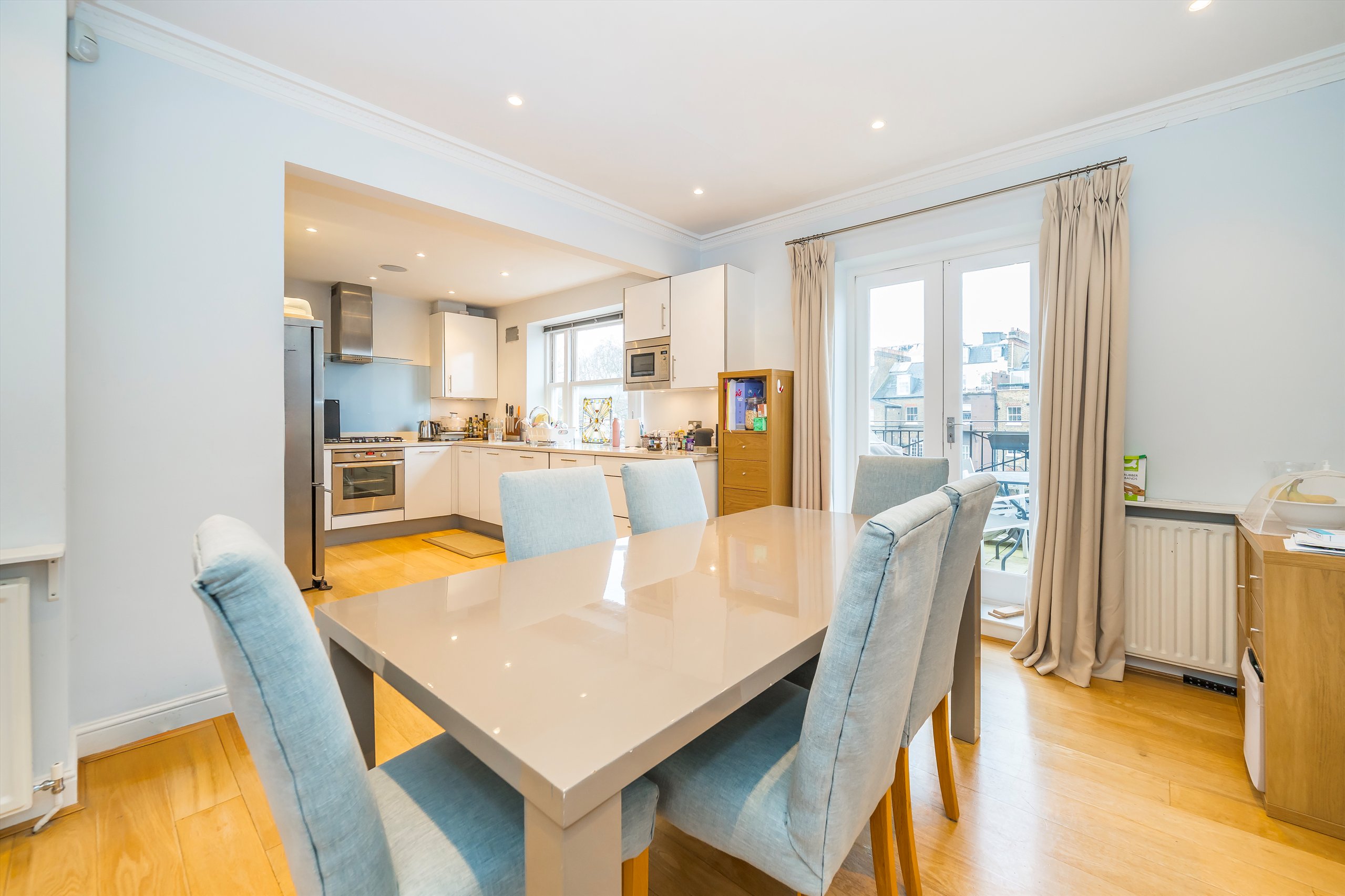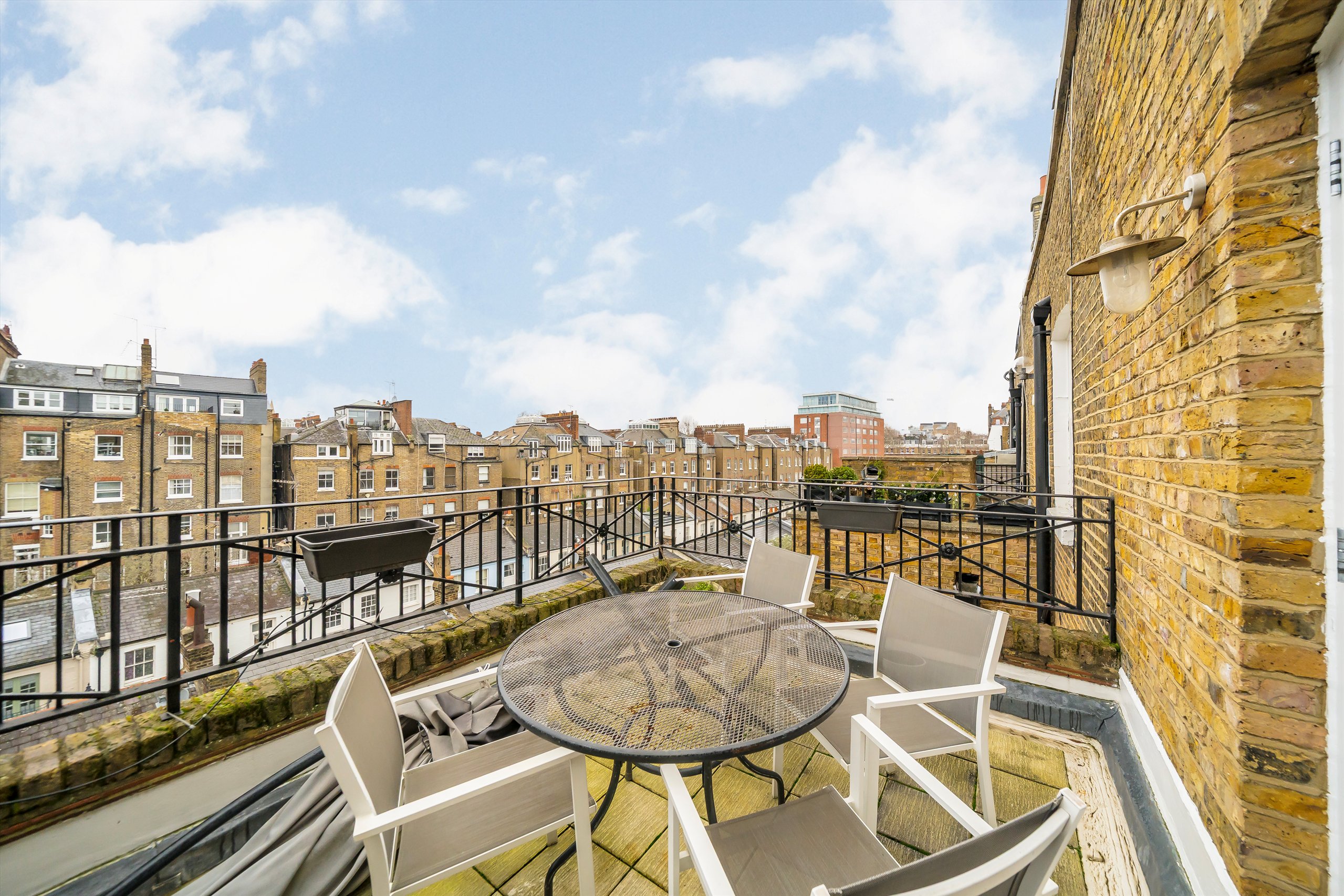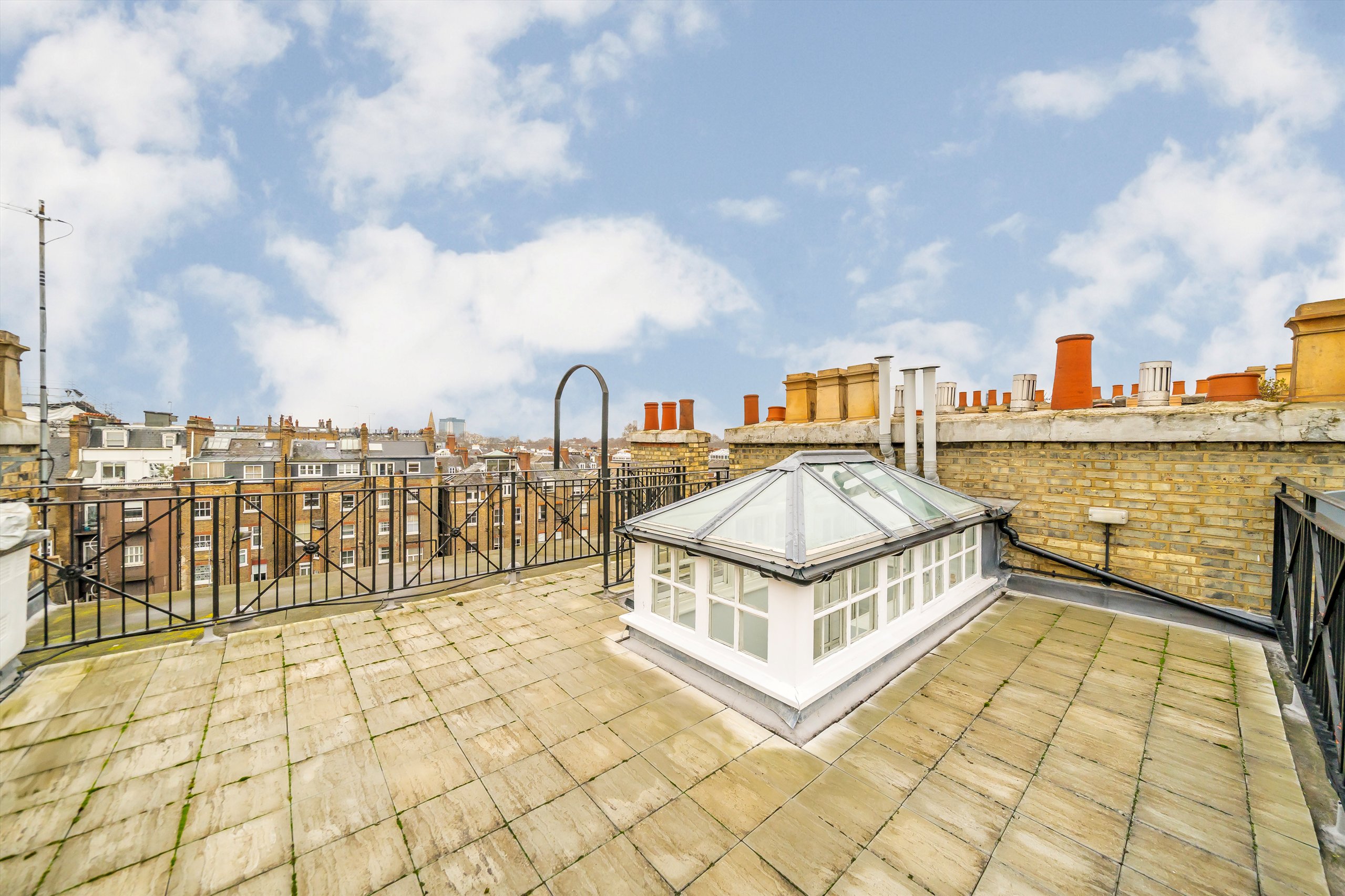 A light and spacious flat with outdoor spaces, occupying top two floors of the building, with lift. The property has a large, bright reception room with high ceilings. On the other side there is an immaculate modern, kitchen/dining room leading out on to a sunny roof terrace. Upstairs there are three bedrooms with good storage and two sleek and modern bathrooms. Stairs lead up to another spacious roof terrace with far reaching views over the rooftops of London - ideal during the summer months.