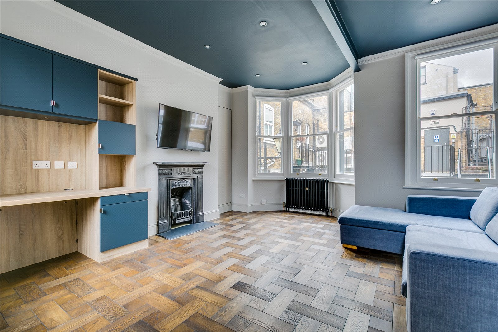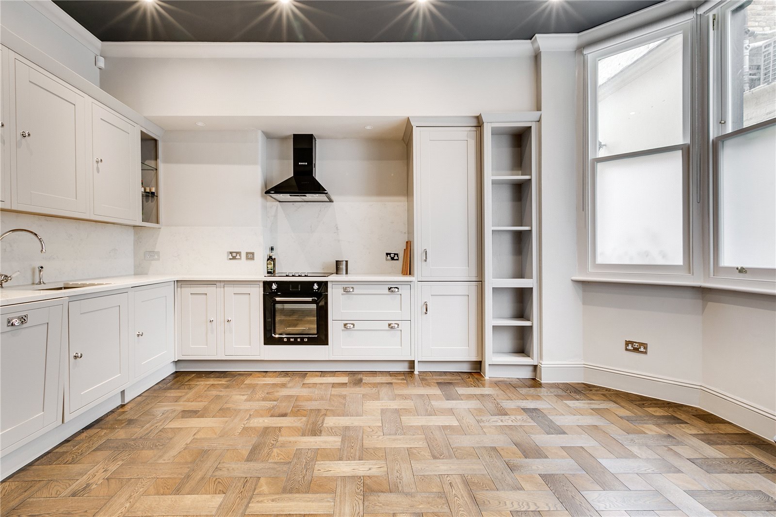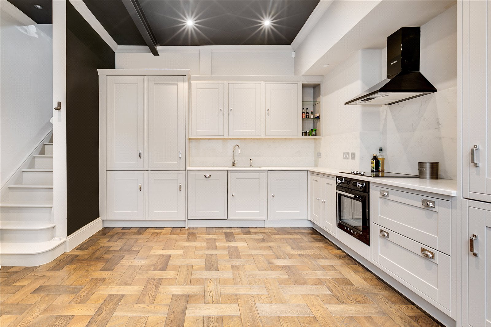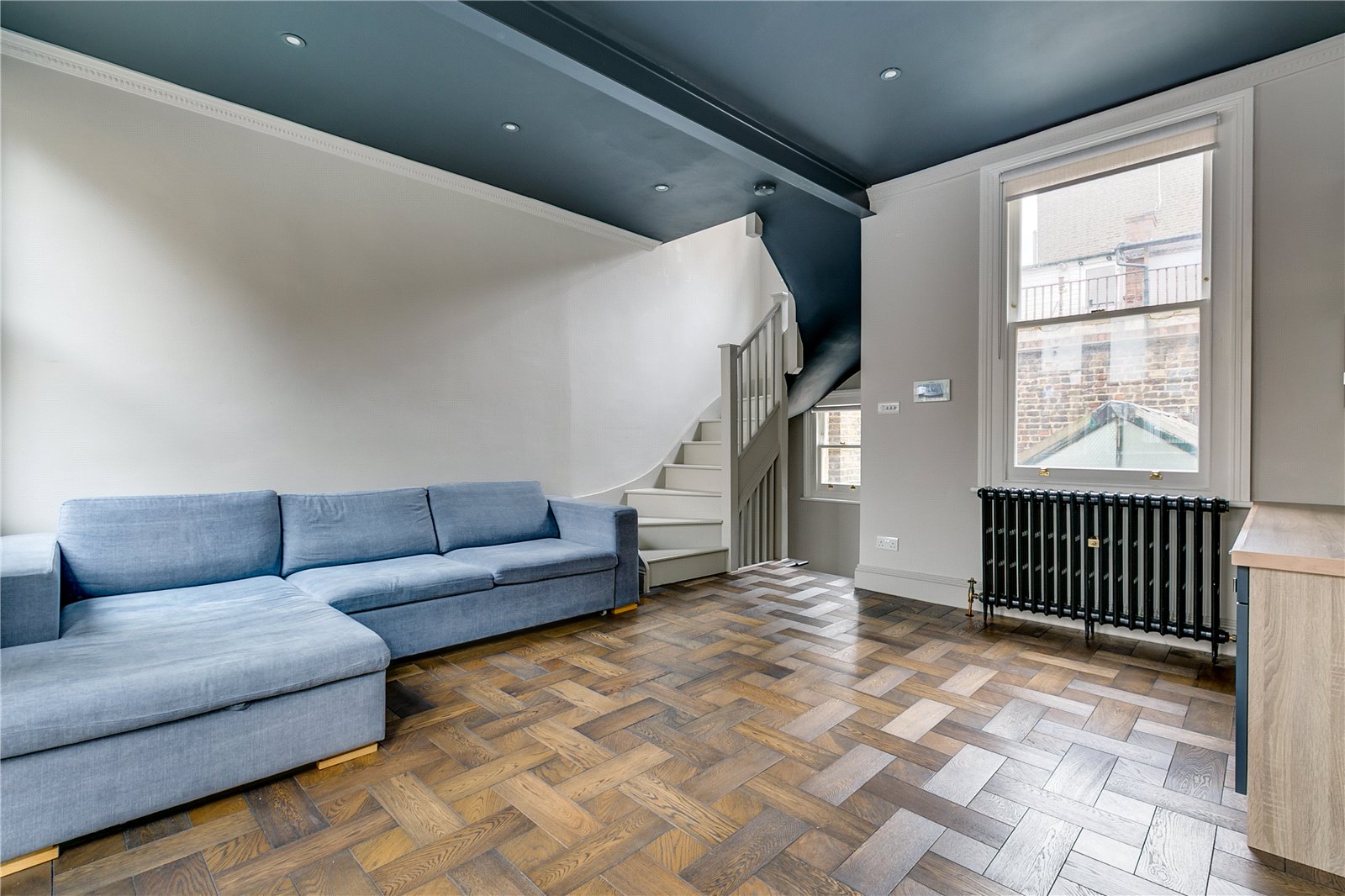 Set across three floors this one-bedroom house has been refurbished to an impeccable standard throughout. The ground floor comprises a large, country-style kitchen and dining room, complete with integrated appliances. The first floor features a dual-aspect reception room with a dedicated built-in study area. The top floor is dedicated to the master bedroom suite, with fitted storage, a private vanity/dressing area, and an en suite bathroom.