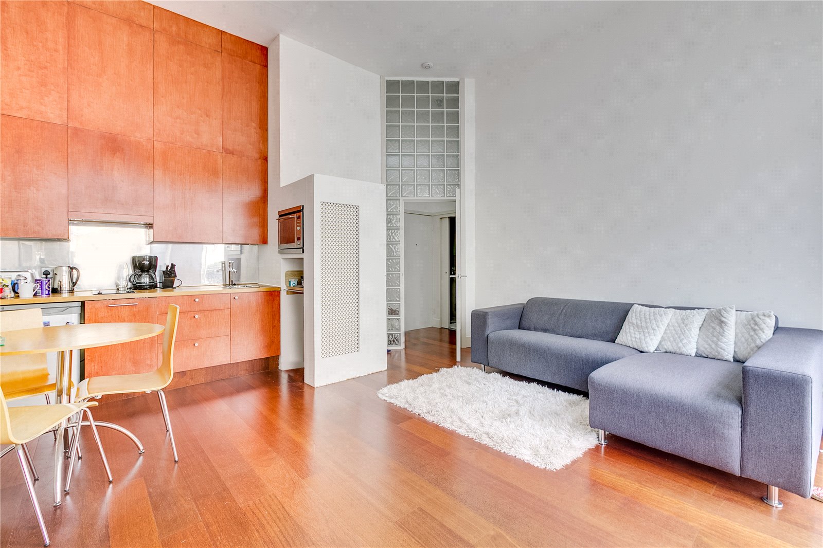 This charming first-floor property features a spacious open-plan living area with a modern, fully equipped kitchen, complete with all white goods included. French doors open onto a private balcony, creating a bright and inviting living space. The generous double bedroom benefits from built-in storage, while impressive double-height ceilings throughout enhance the sense of space and natural light.