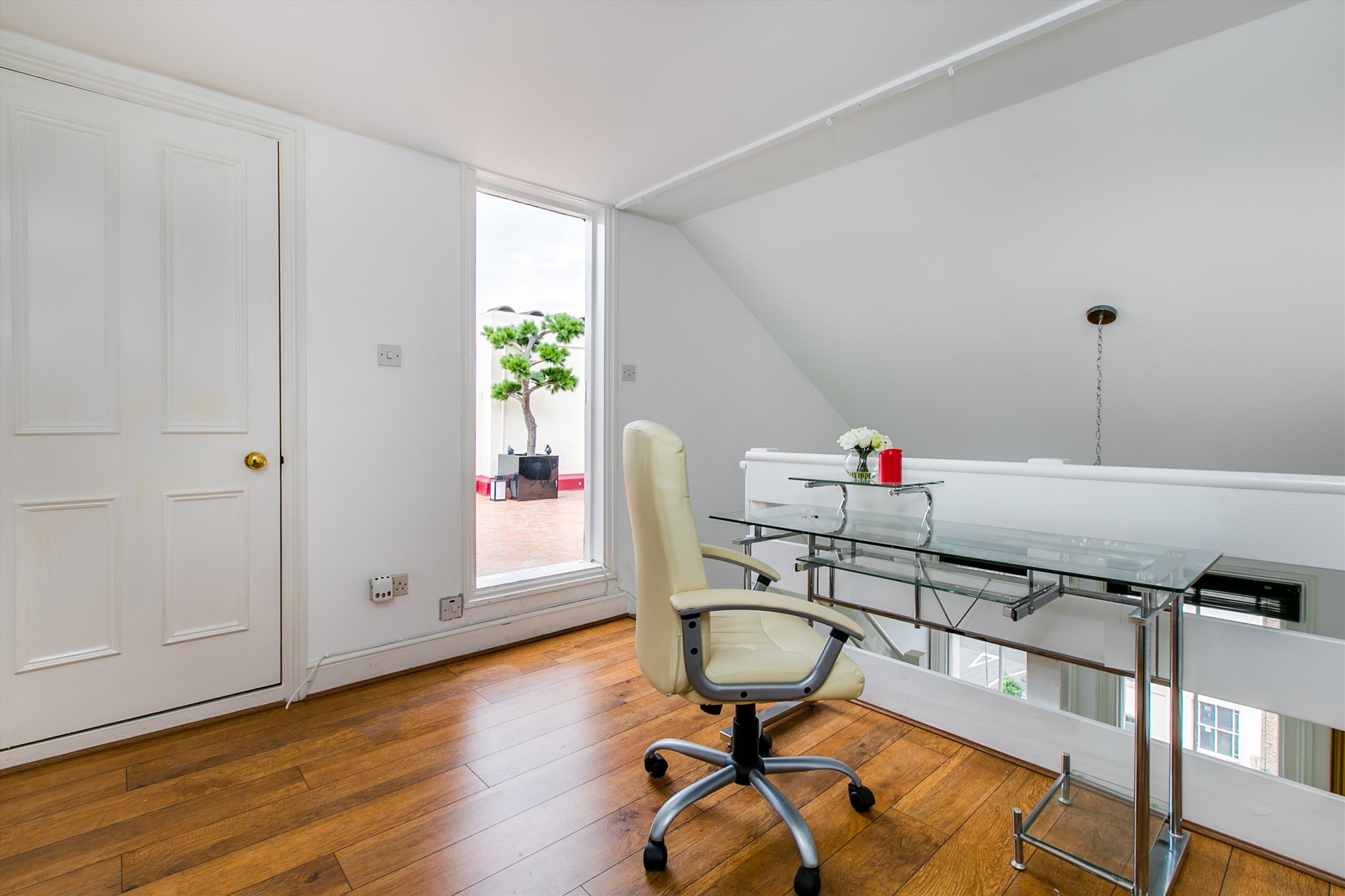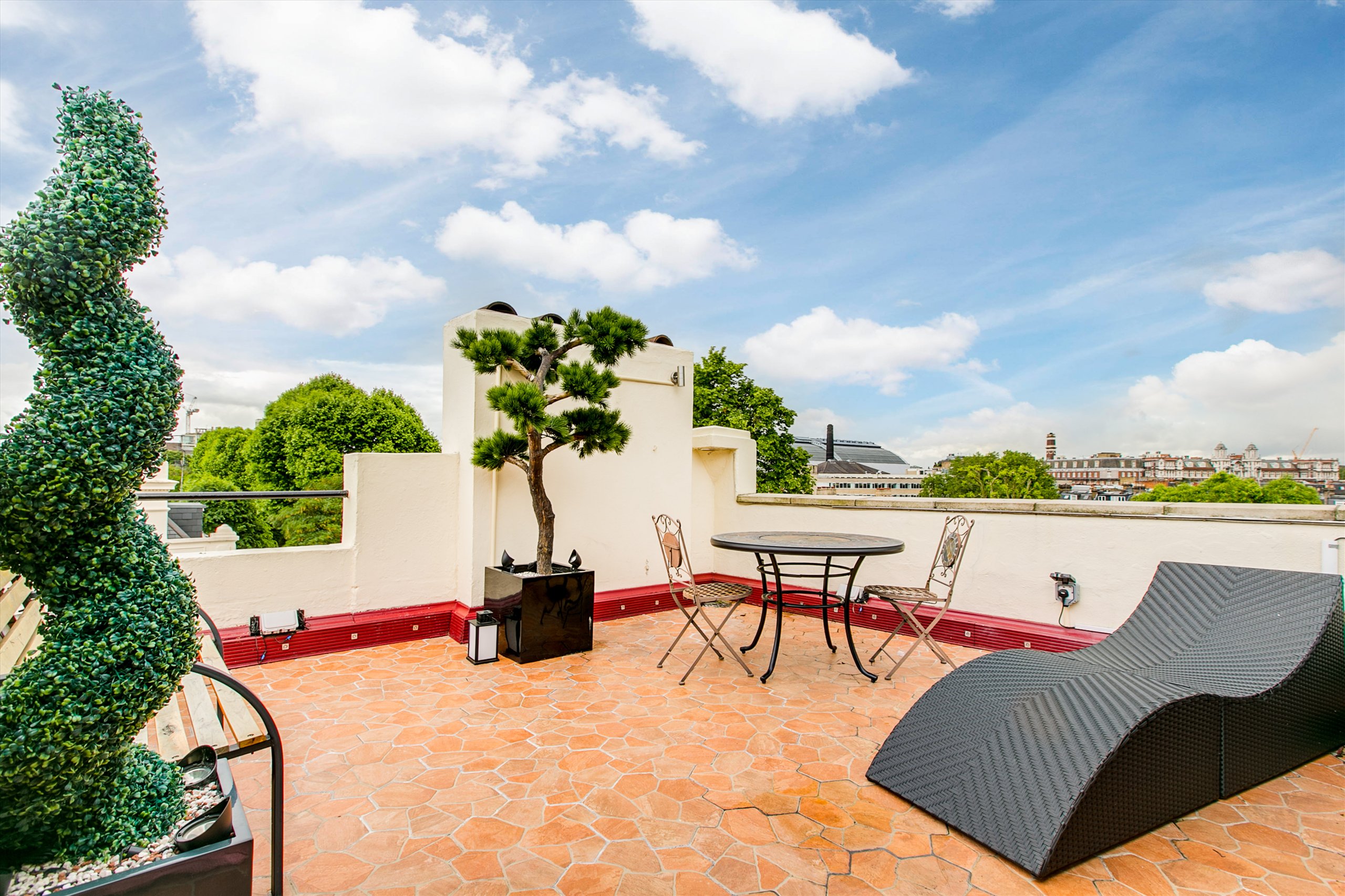 This superb one-bedroom apartment is beautifully finished throughout and features a bright reception room with lovely wooden flooring and a well-equipped separate kitchen. There is a spacious master bedroom with excellent storage, a guest sleeping area or place for study, a modern bathroom and an impressive tiled roof terrace with stunning views across London.