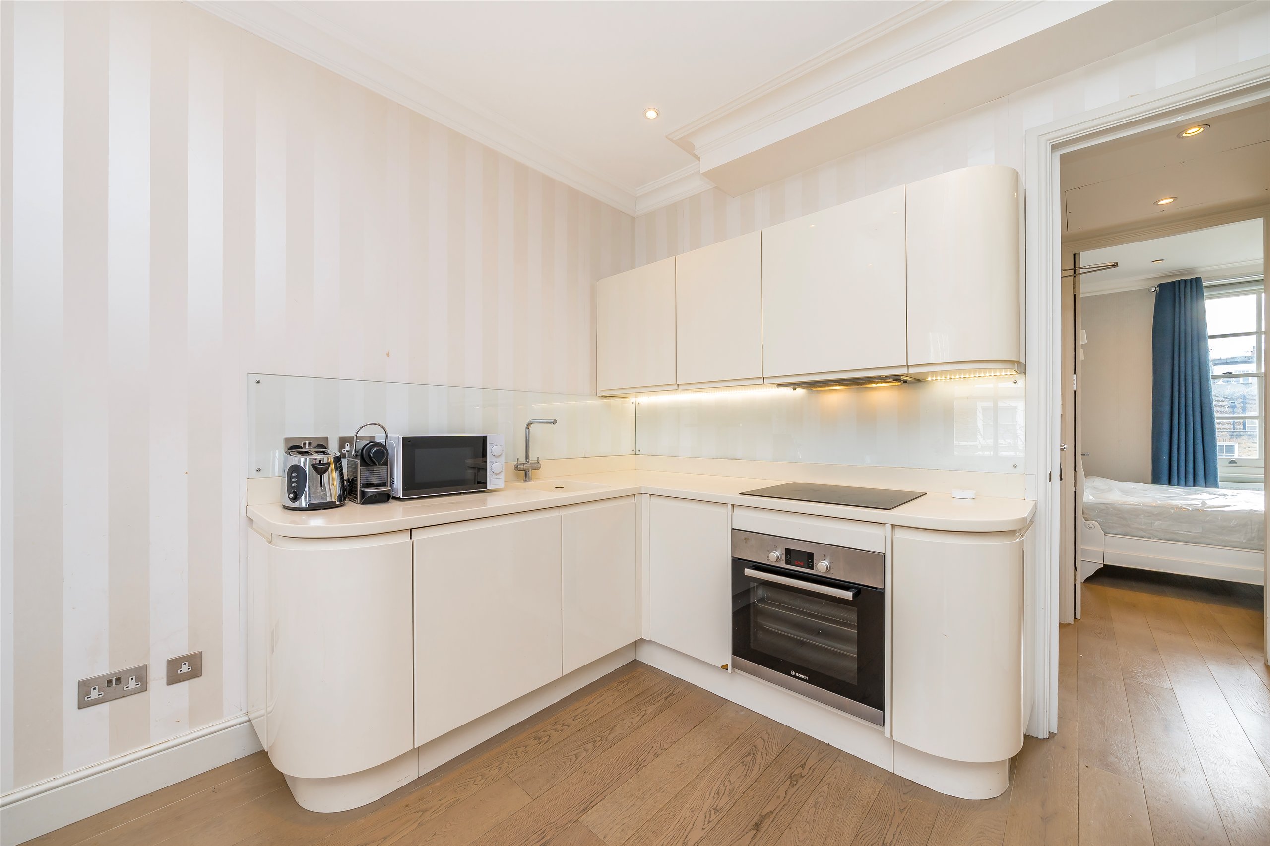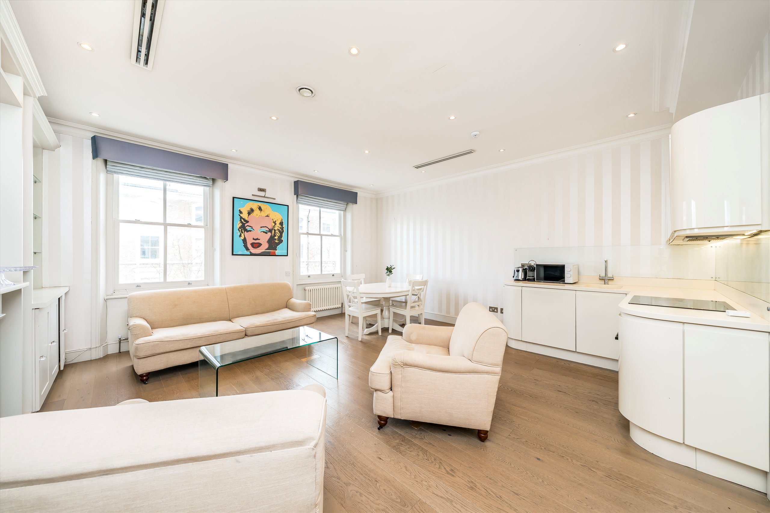 This stunning, newly refurbished one-bedroom apartment is situated on the second floor of an elegant period building on Cathcart Road in Chelsea. The property features a contemporary open-plan living area with high ceilings, expansive floor-to-ceiling windows, and a private balcony, allowing for an abundance of natural light and a bright, spacious feel. Finished to an exceptional standard throughout, it is ideally suited to a professional or couple seeking both comfort and sophistication.