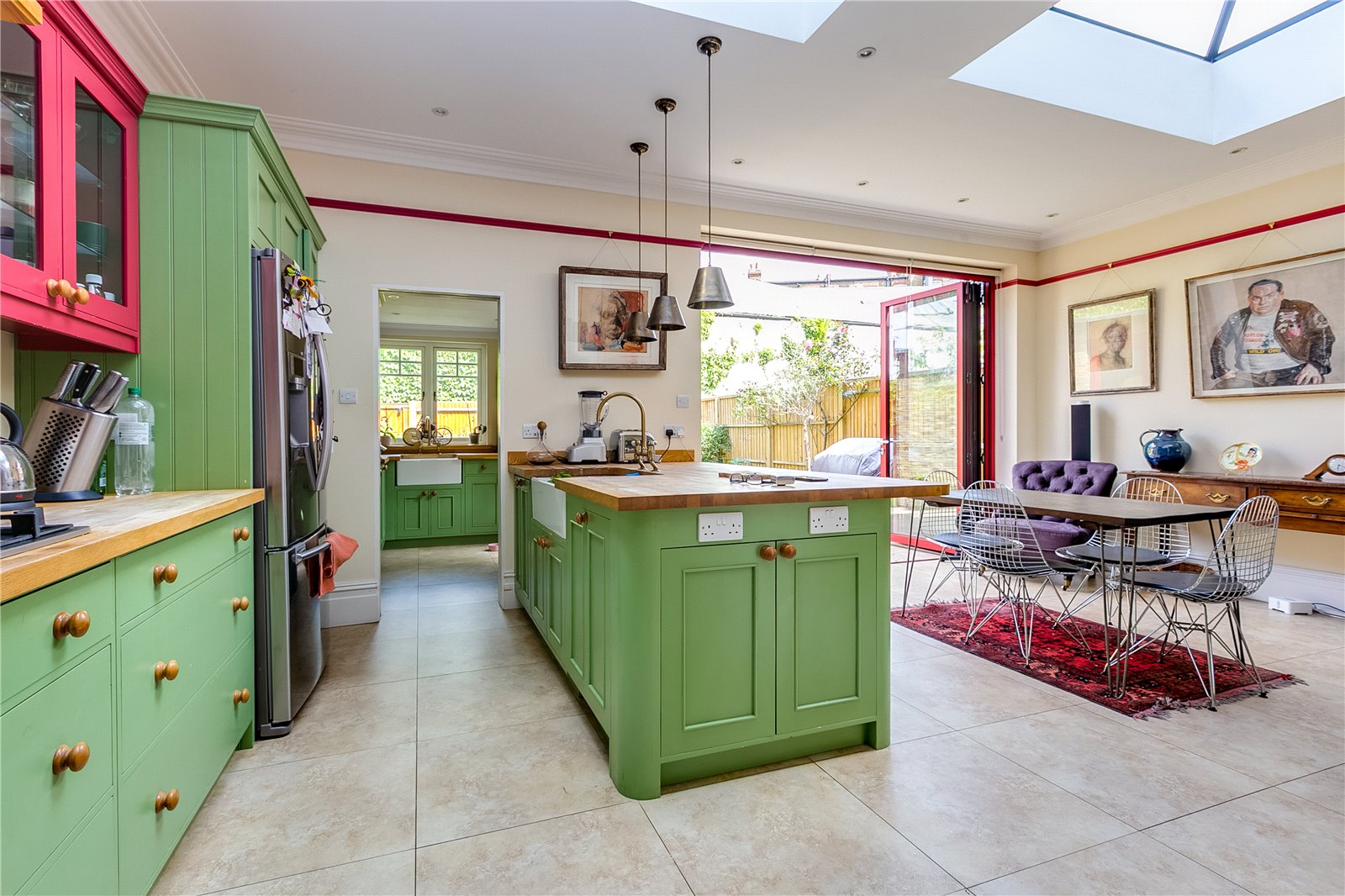 The spacious entrance hallway leads through to a bright double reception room with high ceilings, period detailing and fireplaces. Full height double doors lead on to an expansive open-plan bespoke kitchen and dining room with bi-fold doors to landscaped garden. There is a separate utility room with butler sink and guest WC. Over the top two floors are four double bedrooms, two of which benefit from excellent built-in wardrobes and modern en suite bathrooms. The master comprises a walk-in wardrobe and wet room, whilst the other suite benefits from a luxurious en suite bathroom with original roll top bath and walk-in shower. There is a further family bathroom and additional storage room.
