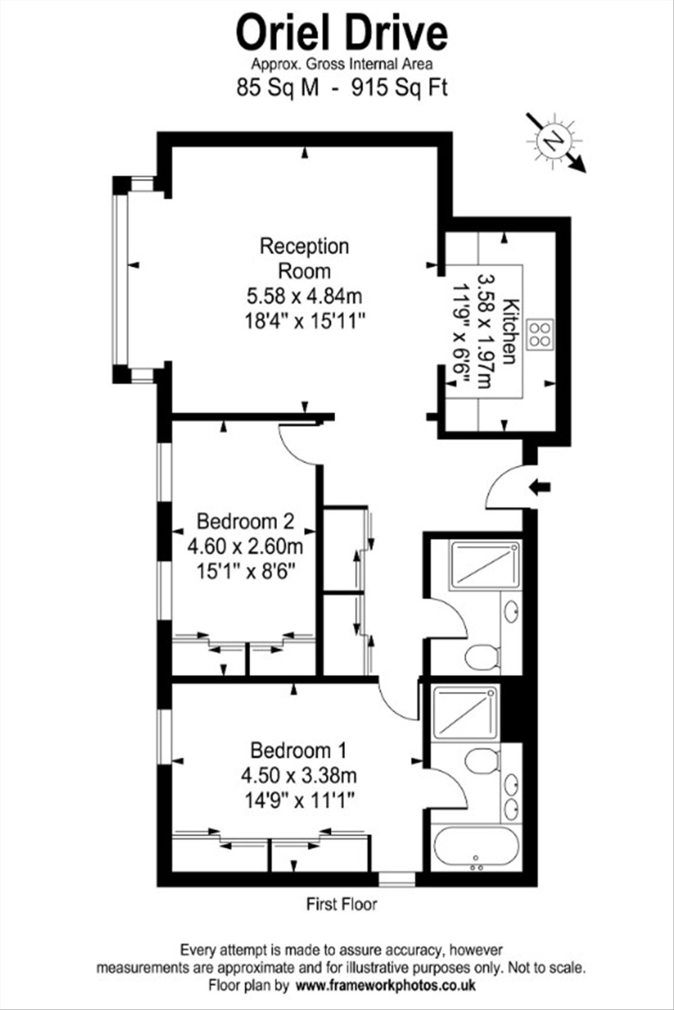 The property boasts a large, bright reception room, separate fully-fitted modern kitchen, two double bedrooms with built-in wardrobes, one of which benefits from an en suite bathroom with bath and separate shower, and an additional family bathroom.