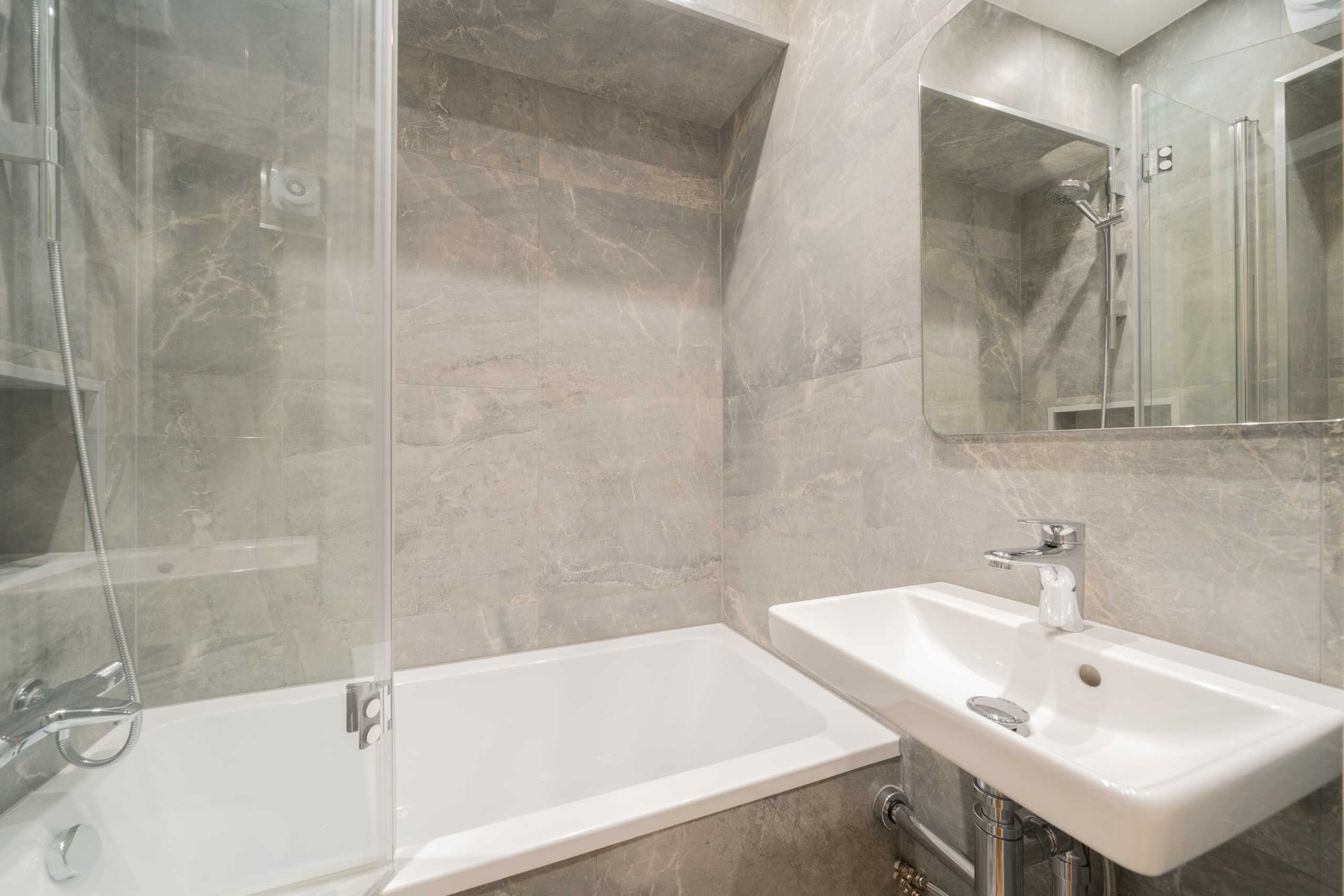 A bright studio on the upper floor of a traditional mansion block with wooden floors and lots of natural light. There is a large reception room, separate kitchen and a modern bathroom with a bath tub.