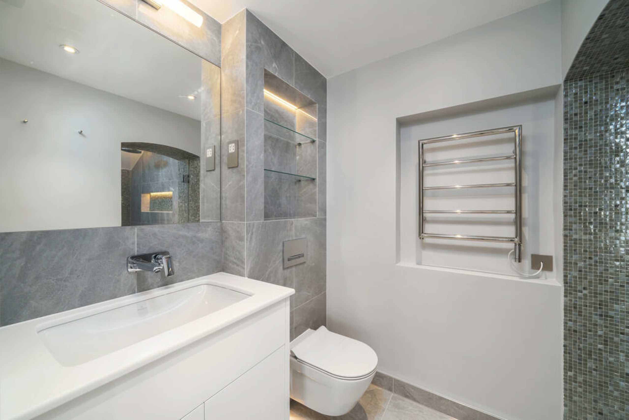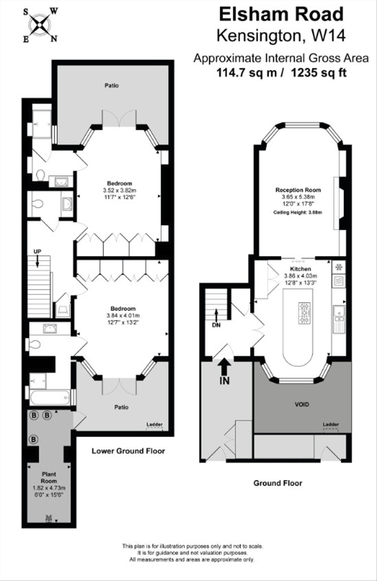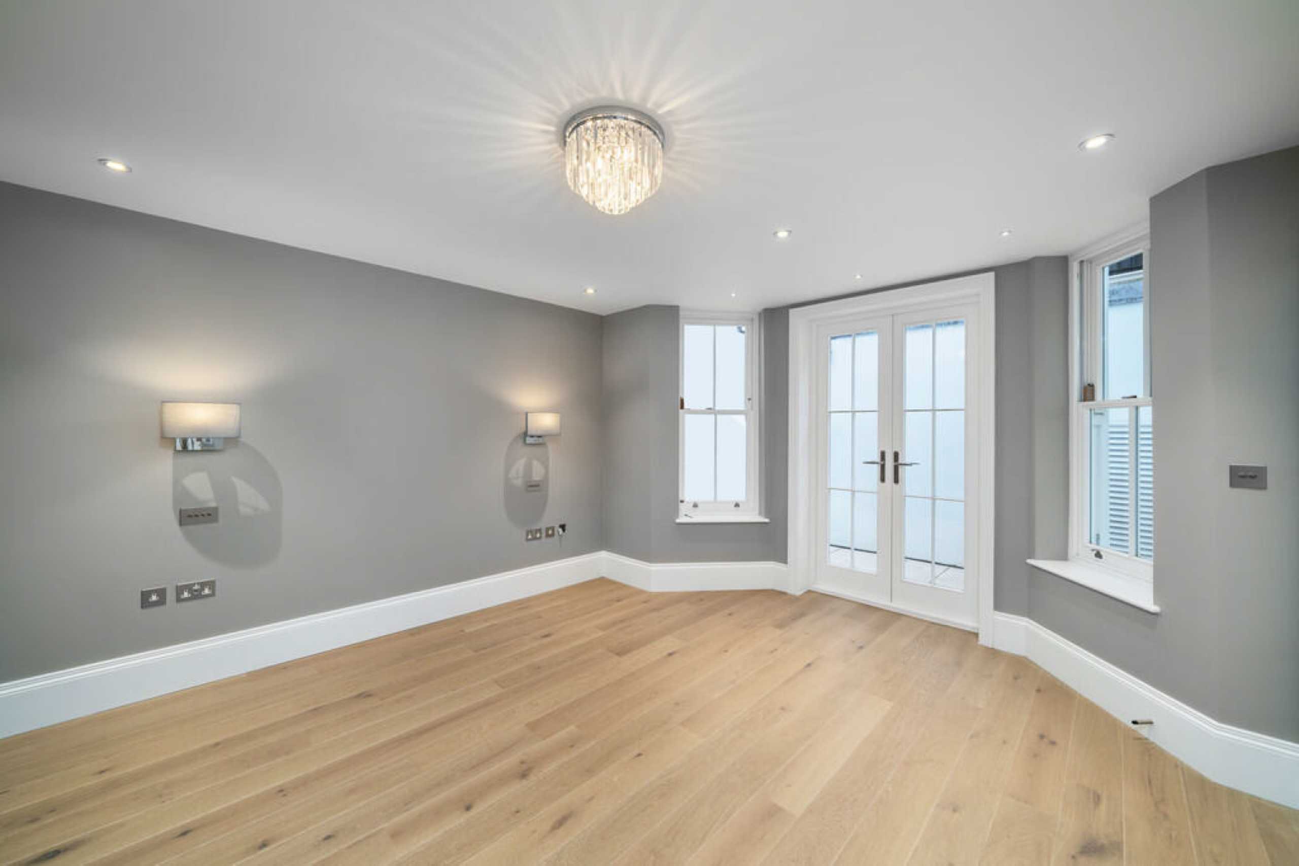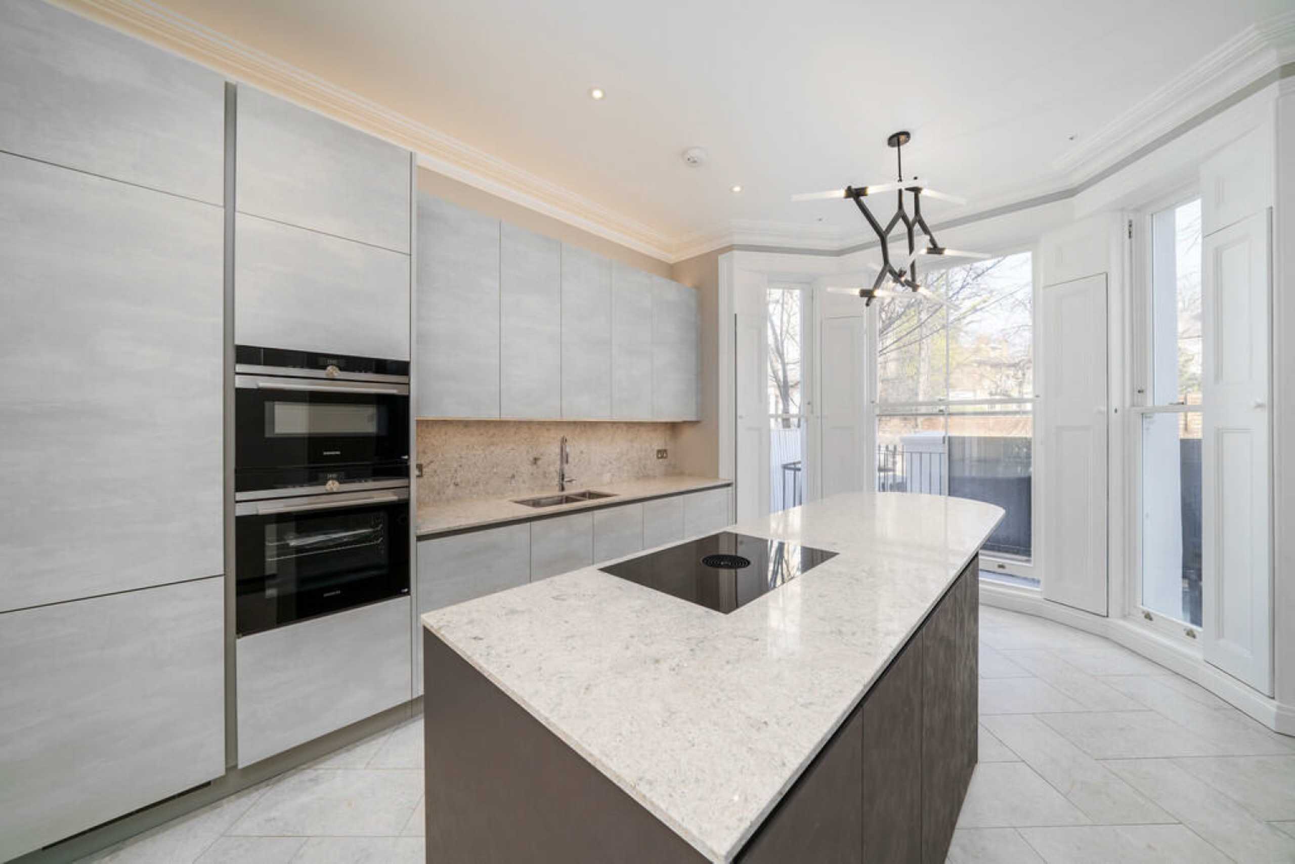 A large fully refurbished two double bedroom split-level property finished to an exceptional standard. Featuring a private entrance, the raised ground floor offers a bright west-facing reception room and a bespoke marble kitchen with integrated appliances. The lower level comprises a guest WC and two spacious bedrooms, both with built-in storage, en-suite bathrooms, and access to small patios. Further benefits include hardwood flooring, period features, air conditioning, and underfloor heating throughout.