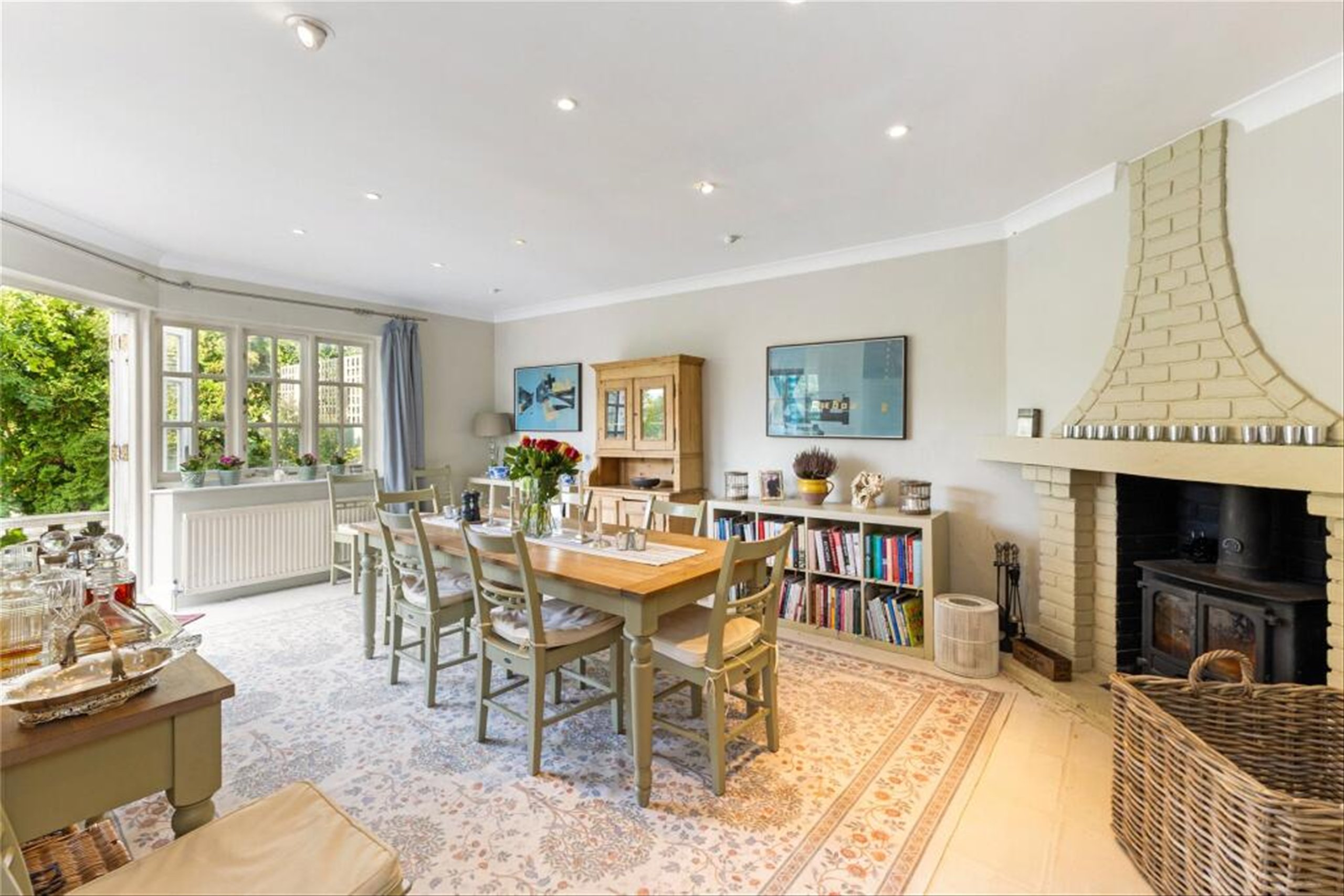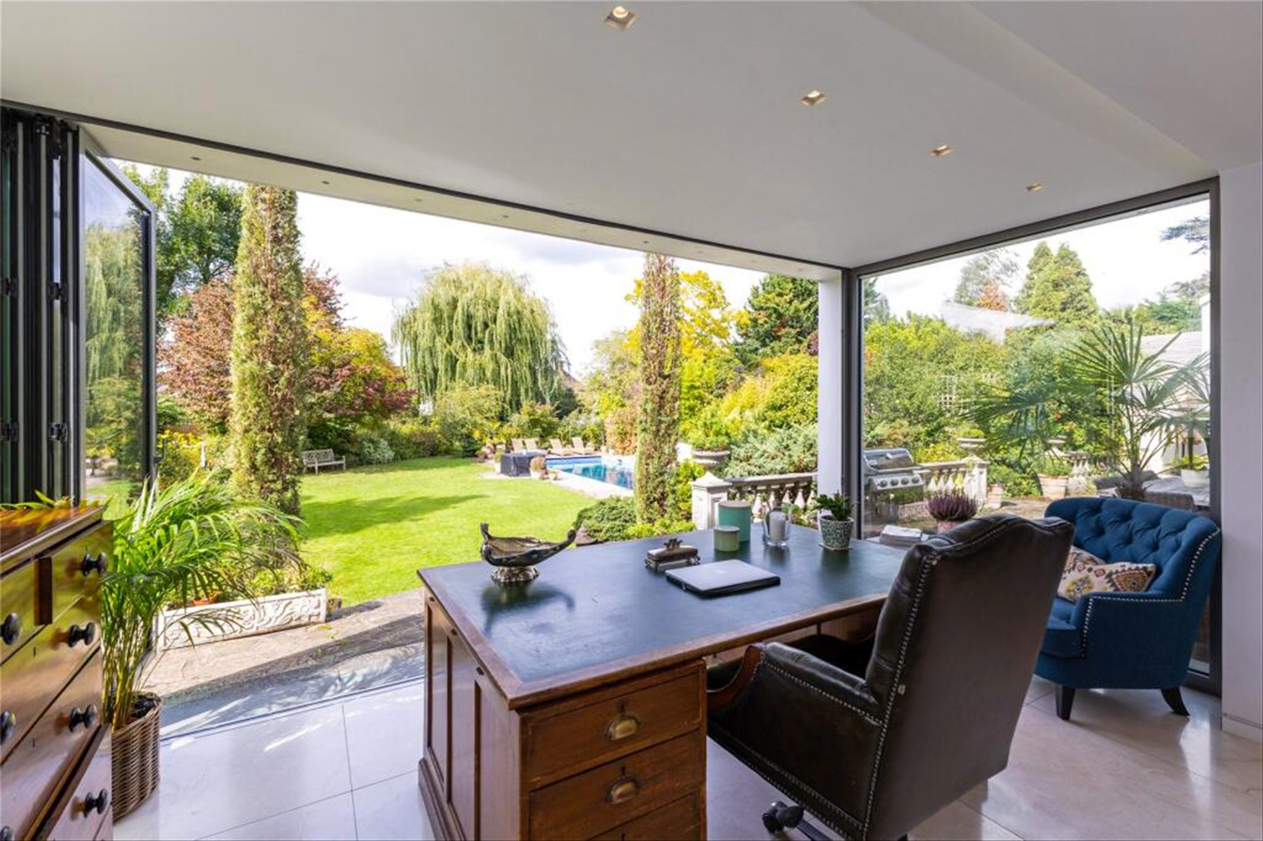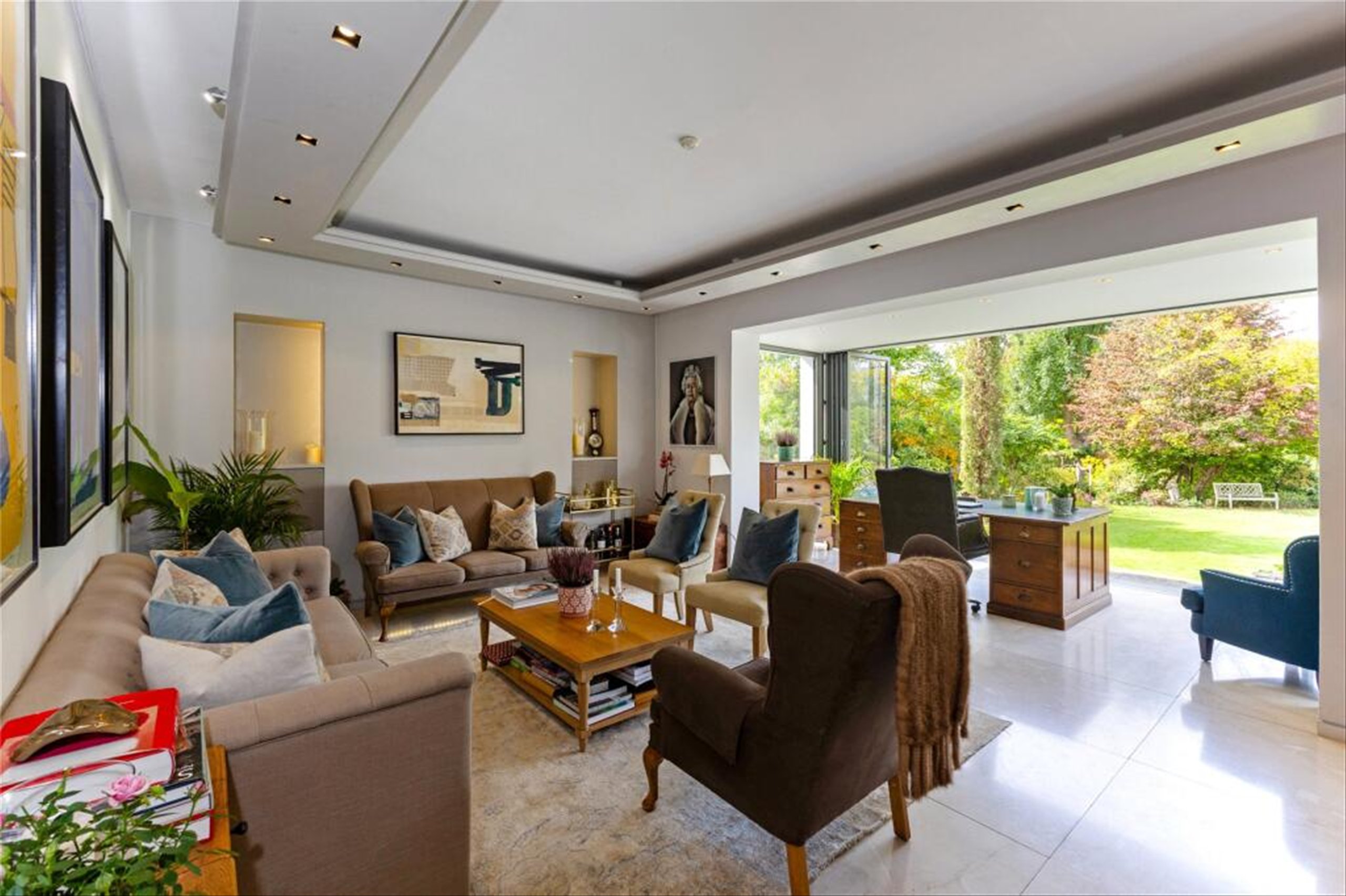 The property boasts a striking facade and a private driveway, opening into a grand reception hallway. Inside, multiple reception rooms provide both formal and informal living options, including a beautifully appointed drawing room, a versatile study with garden views, and a cosy family/media room. The heart of the home is the contemporary open-plan kitchen and dining space, featuring a central island, bespoke cabinetry, and direct access to the terrace and garden is ideal for entertaining.