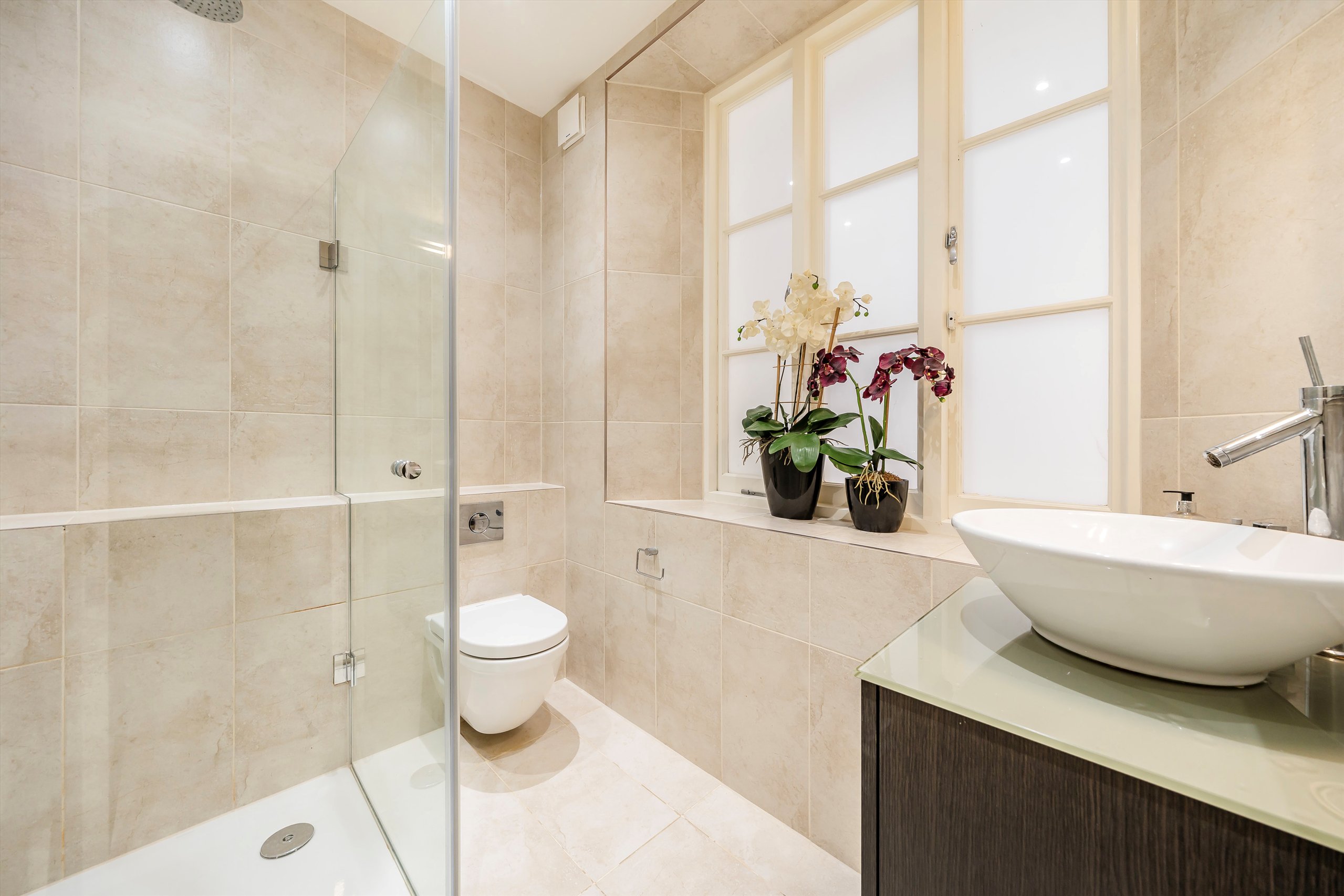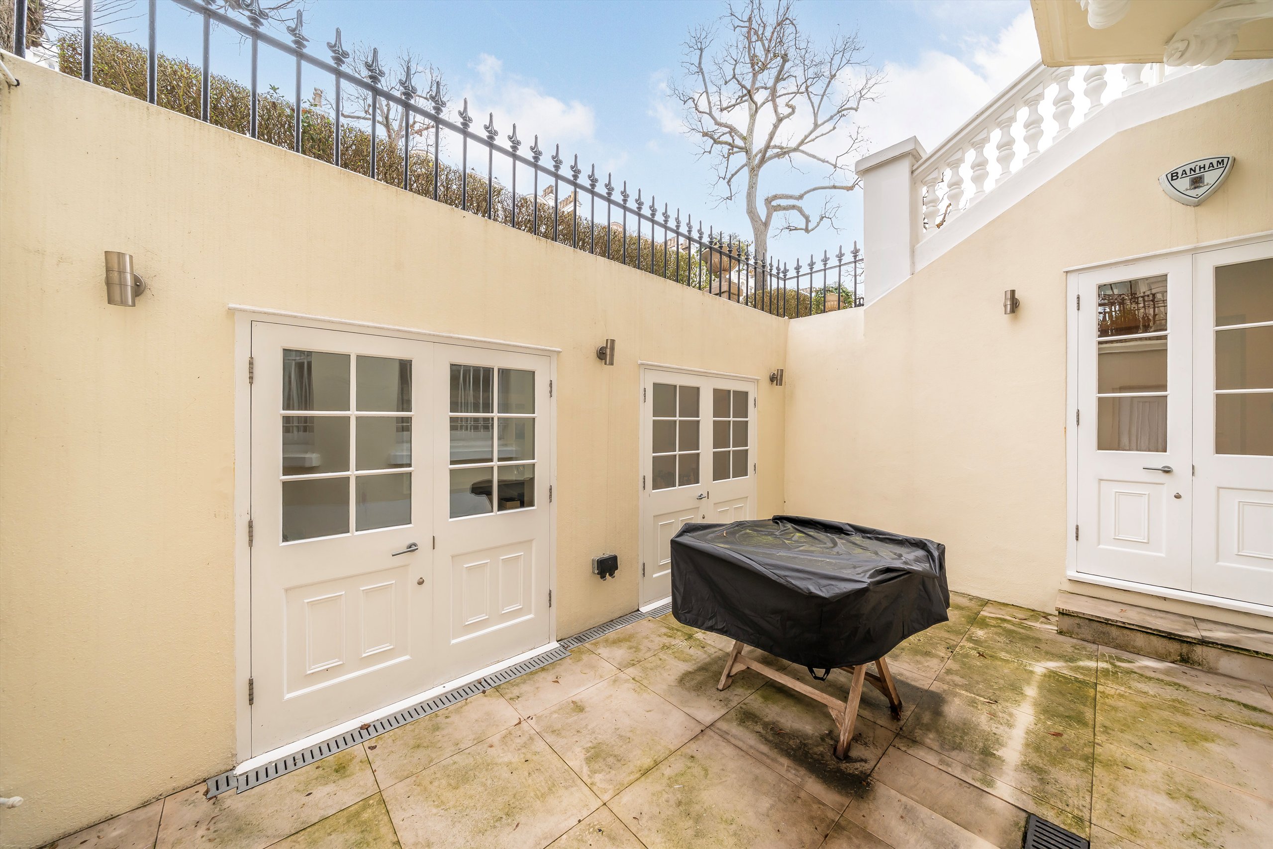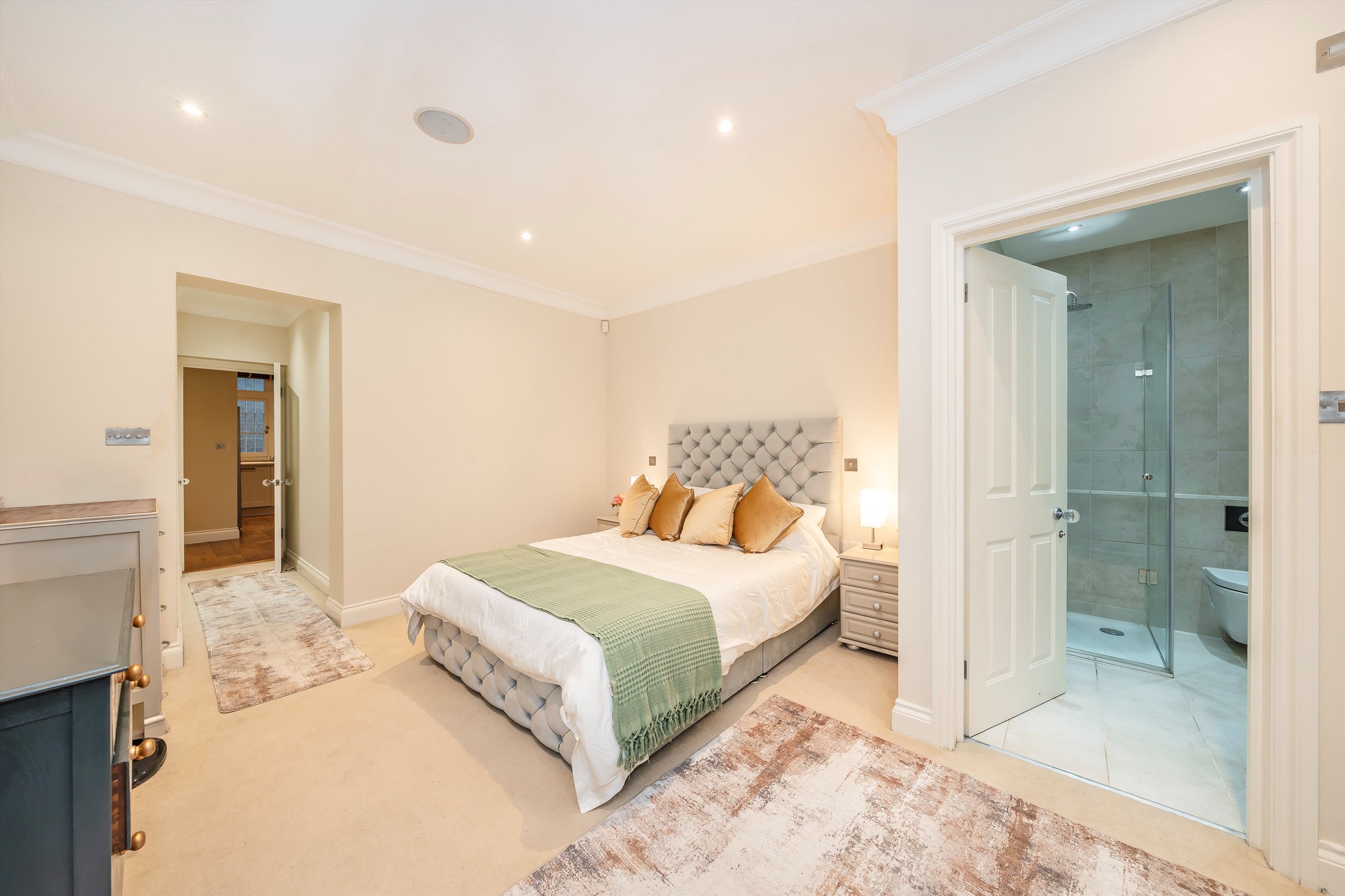 The principal bedroom is finished with extensive built-in wardrobes and leads to a contemporary en suite bathroom. Arranged with a further well-proportioned bedroom and a separate shower room, the property also benefits from a second patio and integrated storage throughout. Set moments from the green space of Holland Park, it offers a quiet setting within easy reach of the local high street.