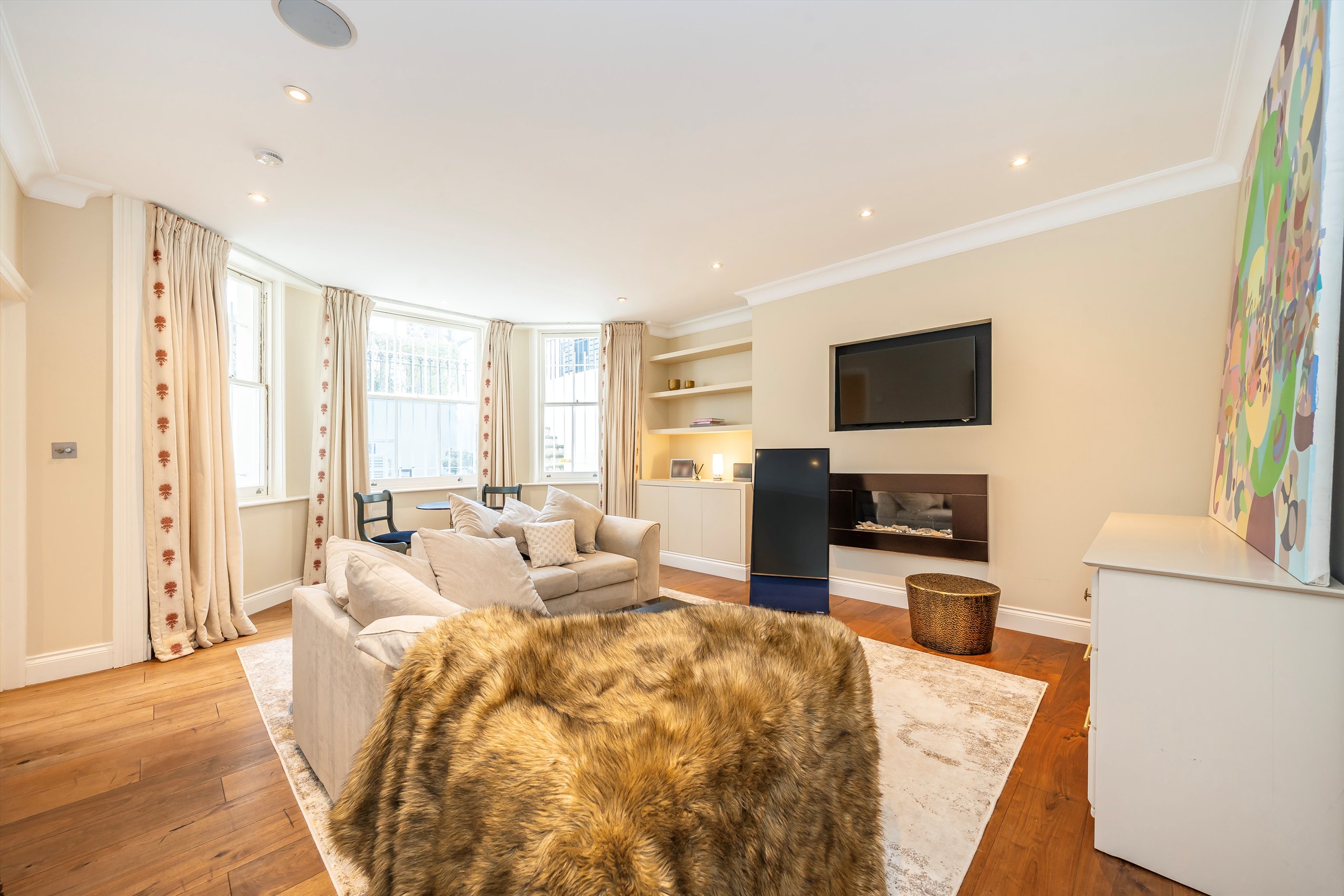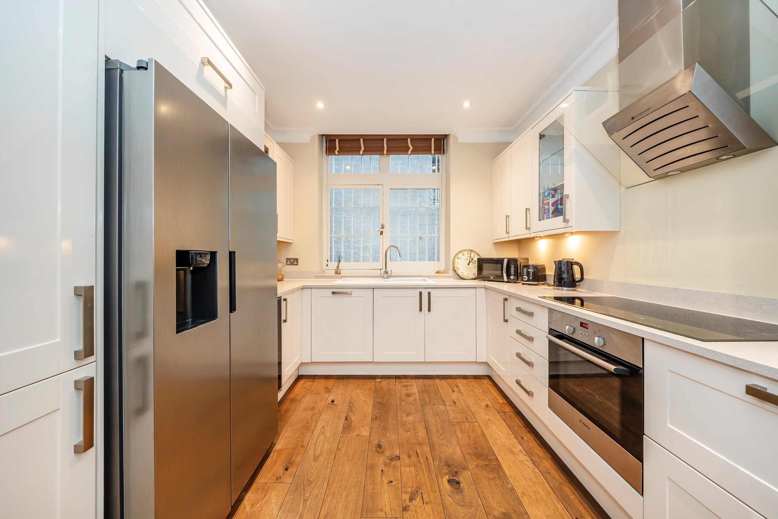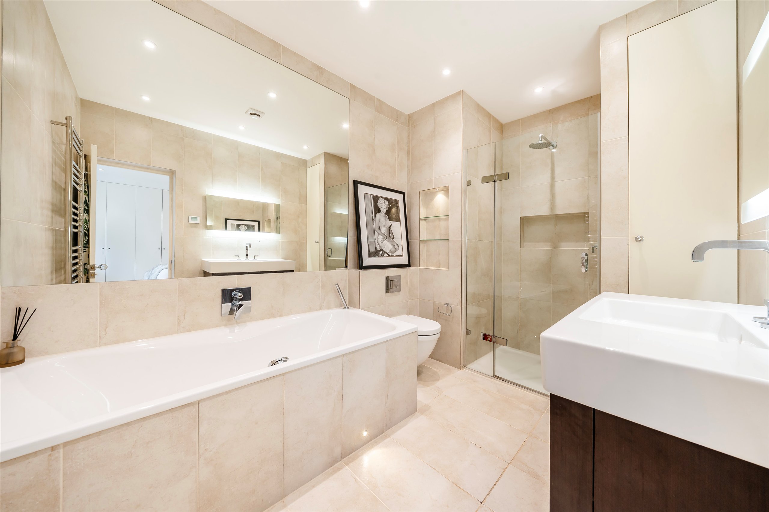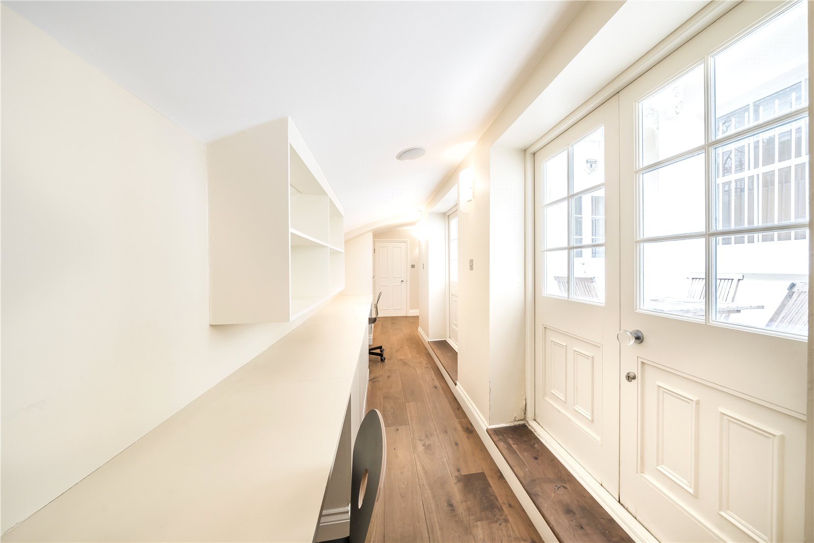 The principal bedroom is finished with extensive built-in wardrobes and leads to a contemporary en suite bathroom. Arranged with a further well-proportioned bedroom and a separate shower room, the property also benefits from a second patio and integrated storage throughout. Set moments from the green space of Holland Park, it offers a quiet setting within easy reach of the local high street.
