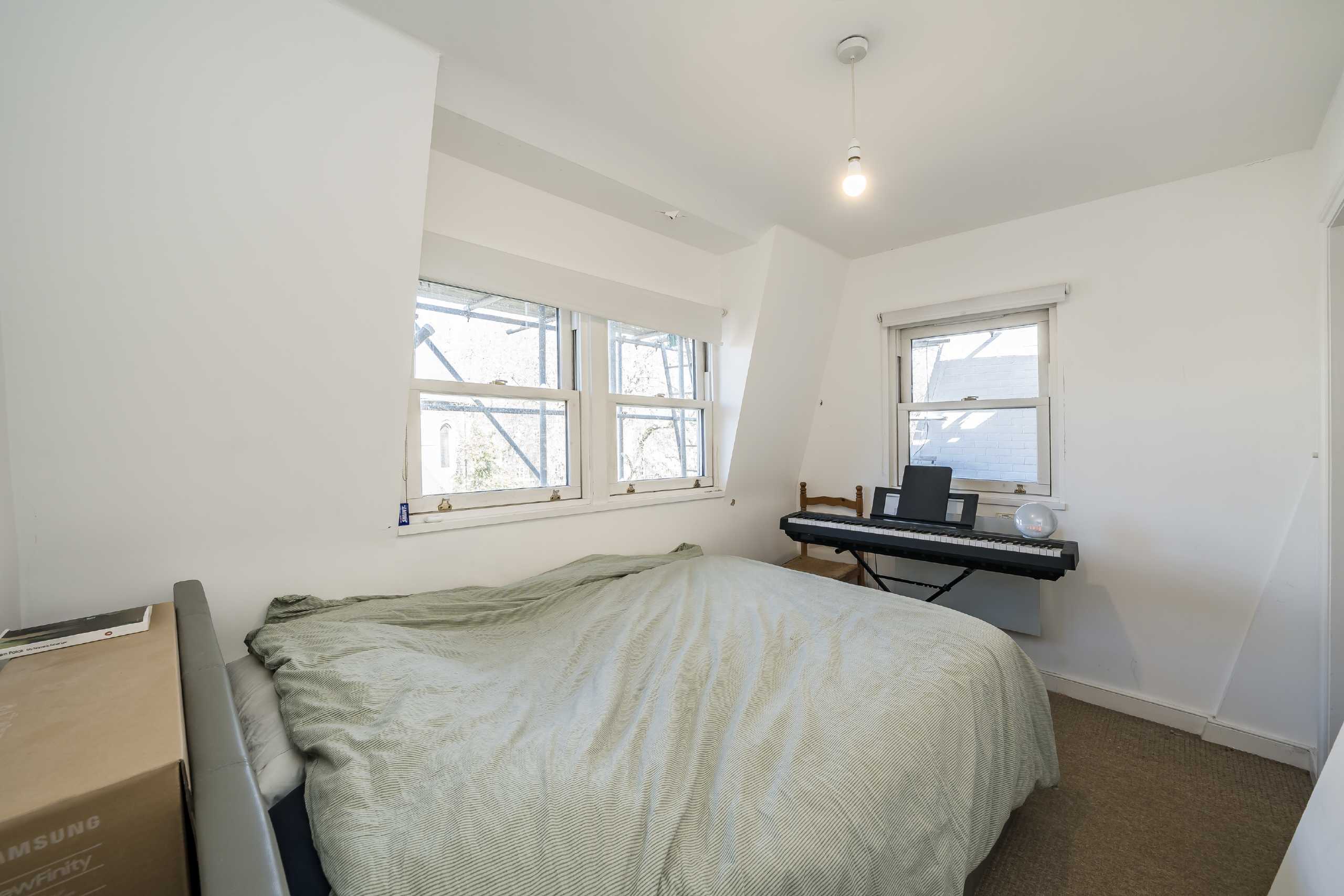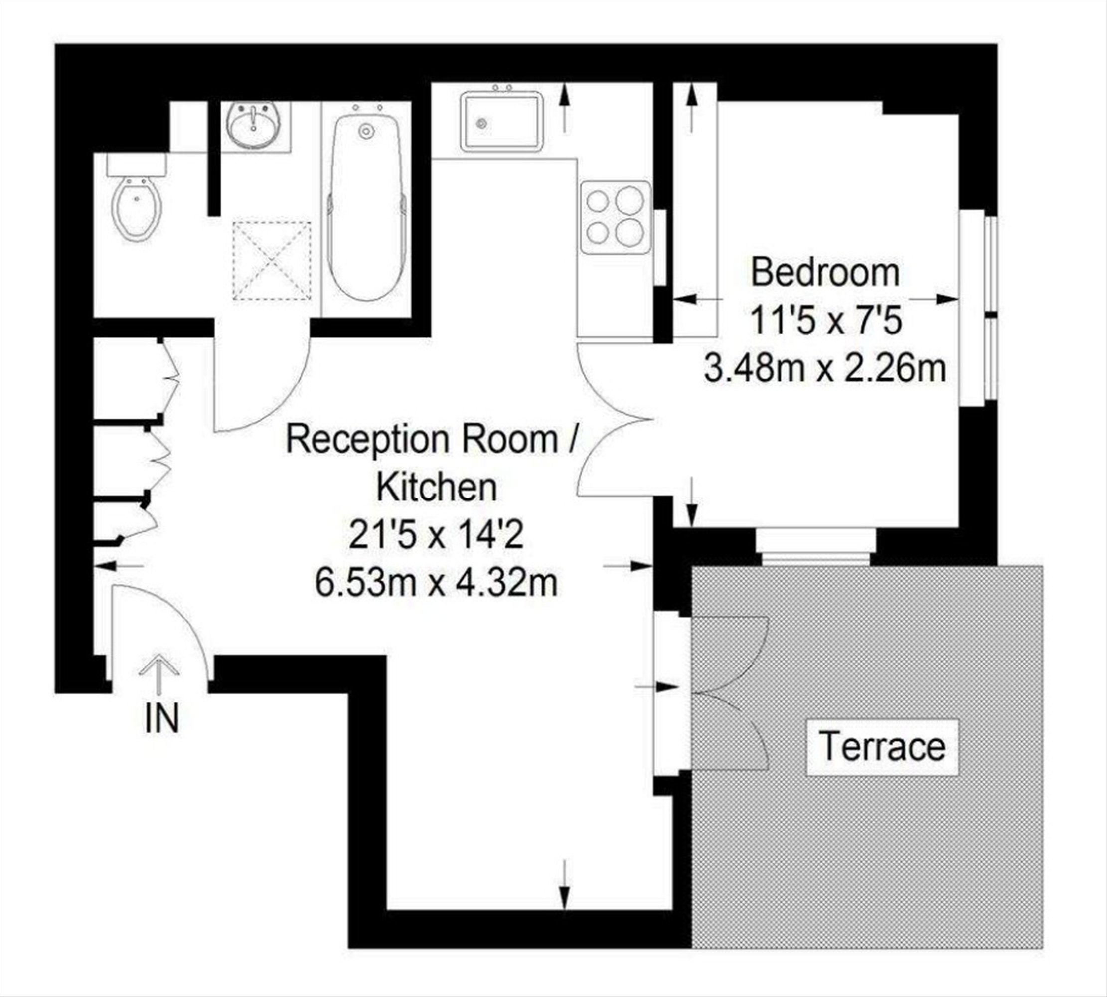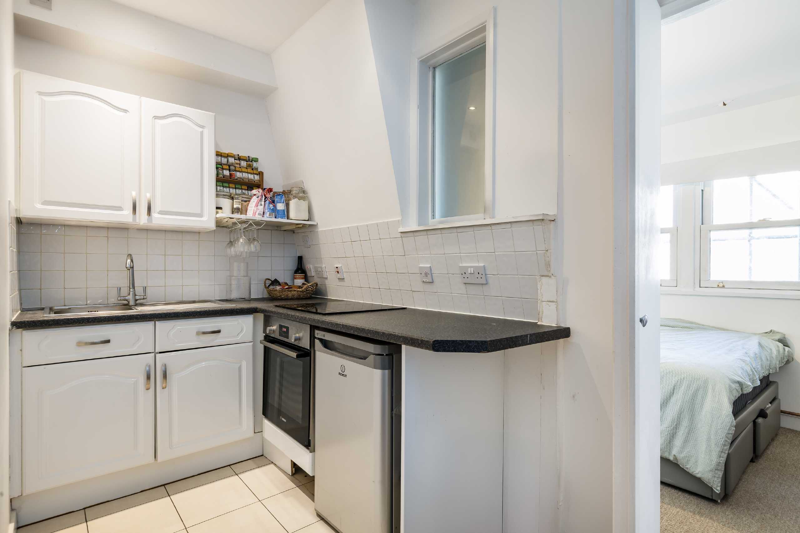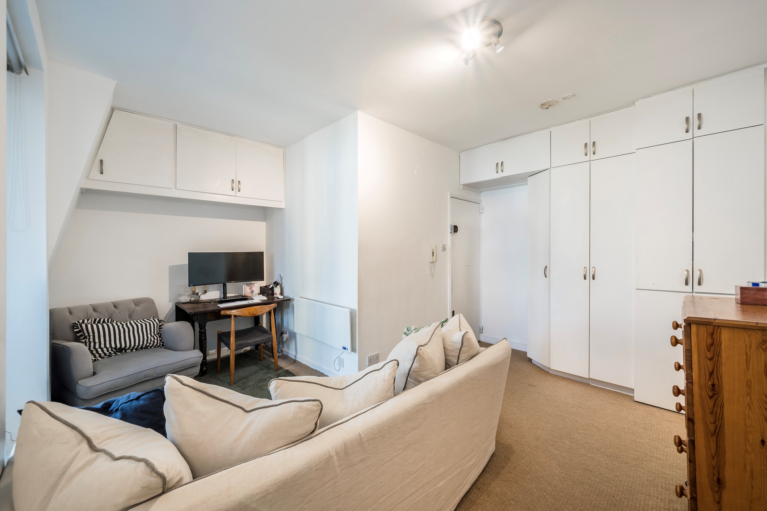 Set on the top floor, this bright apartment features an open plan reception room that opens onto a private roof terrace with views over the communal gardens which are accessed directly from the building. The layout includes a double bedroom with built-in storage and a kitchen with integrated appliances.