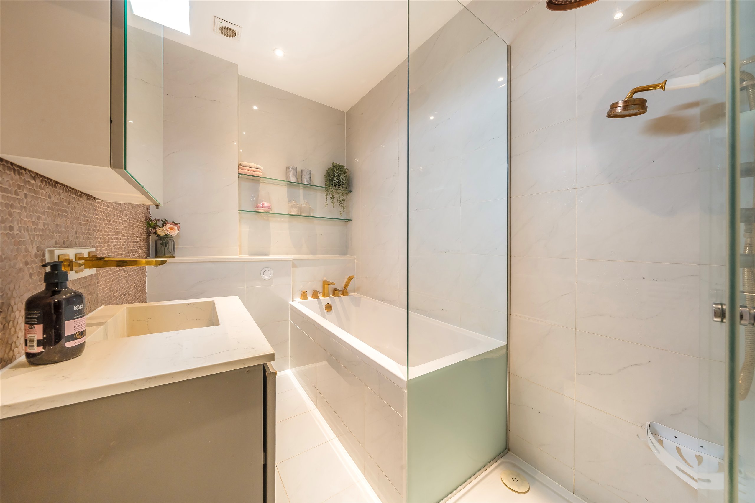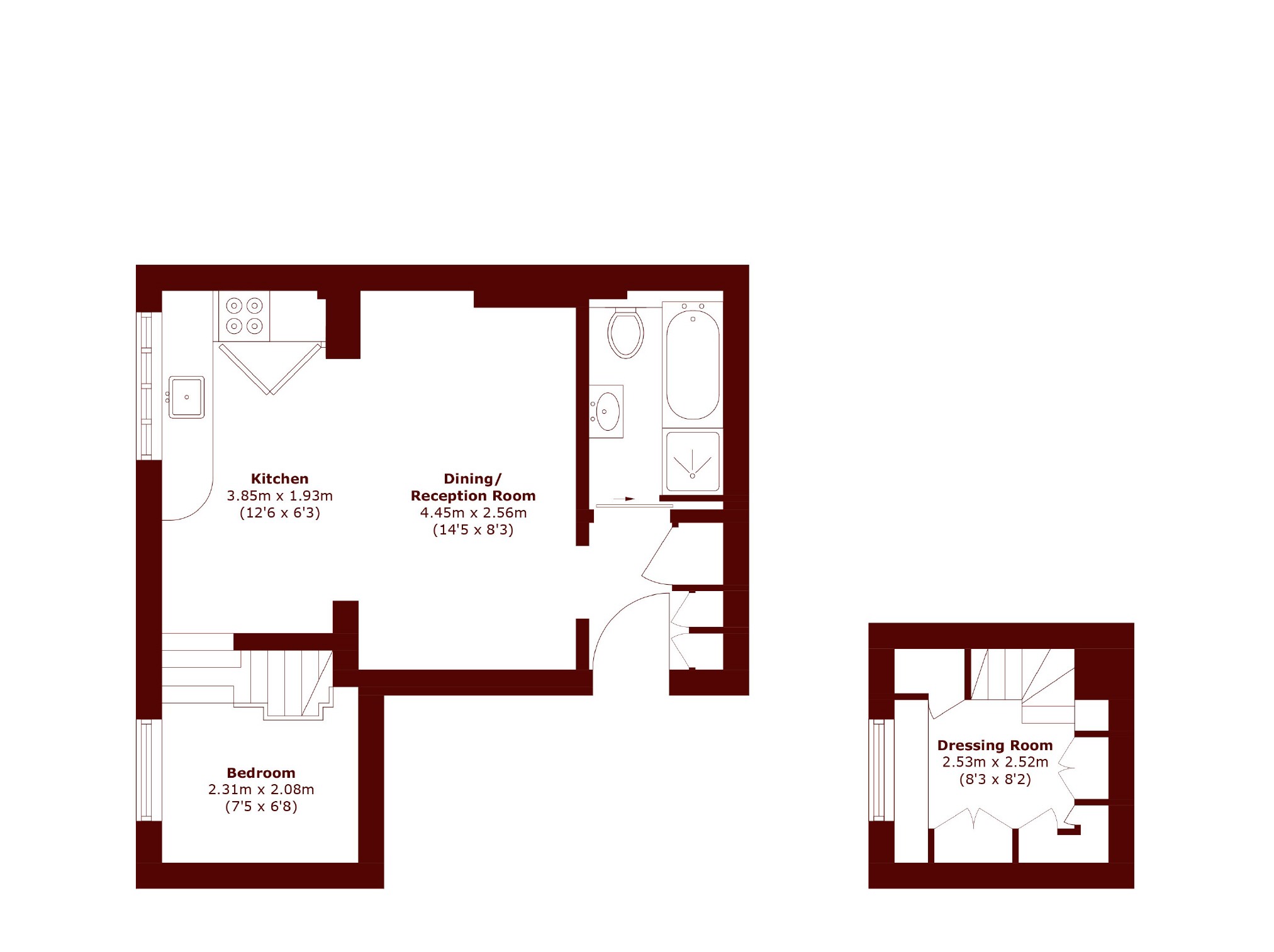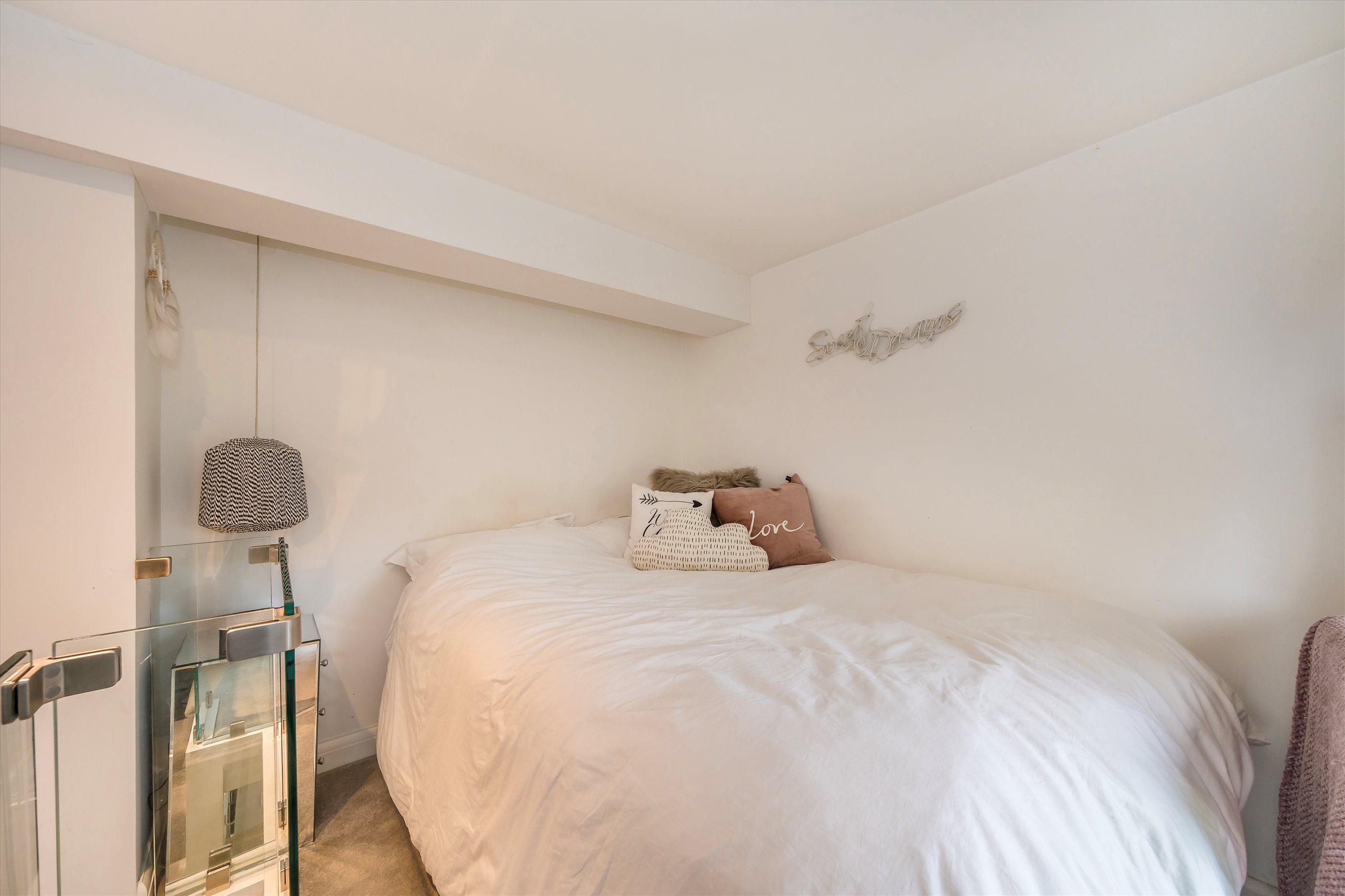 A stylish one bedroom apartment featuring a bright open plan reception with a modern fitted kitchen. The beautifully designed bathroom includes both a tub and shower. The bedroom sits on a well designed mezzanine level overlooking a generous dressing room or home office, creating a versatile and attractive living space.