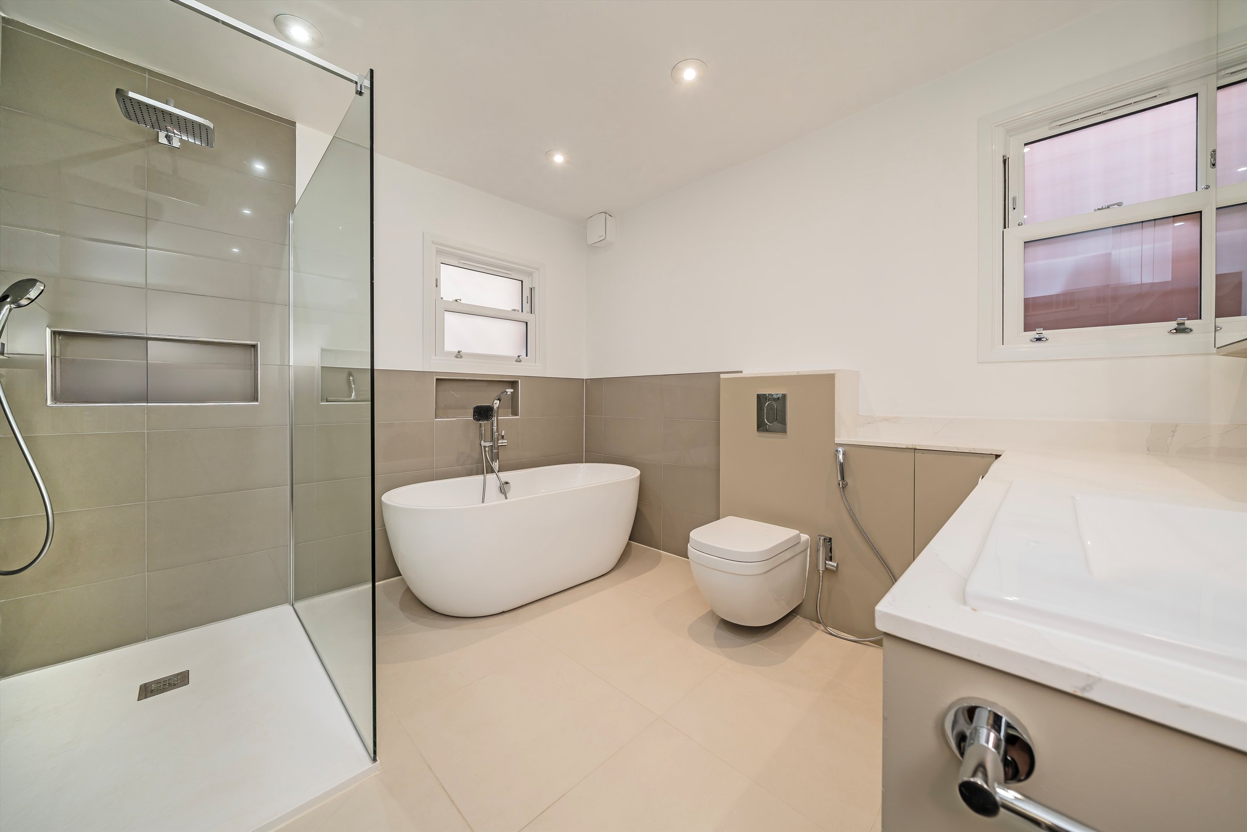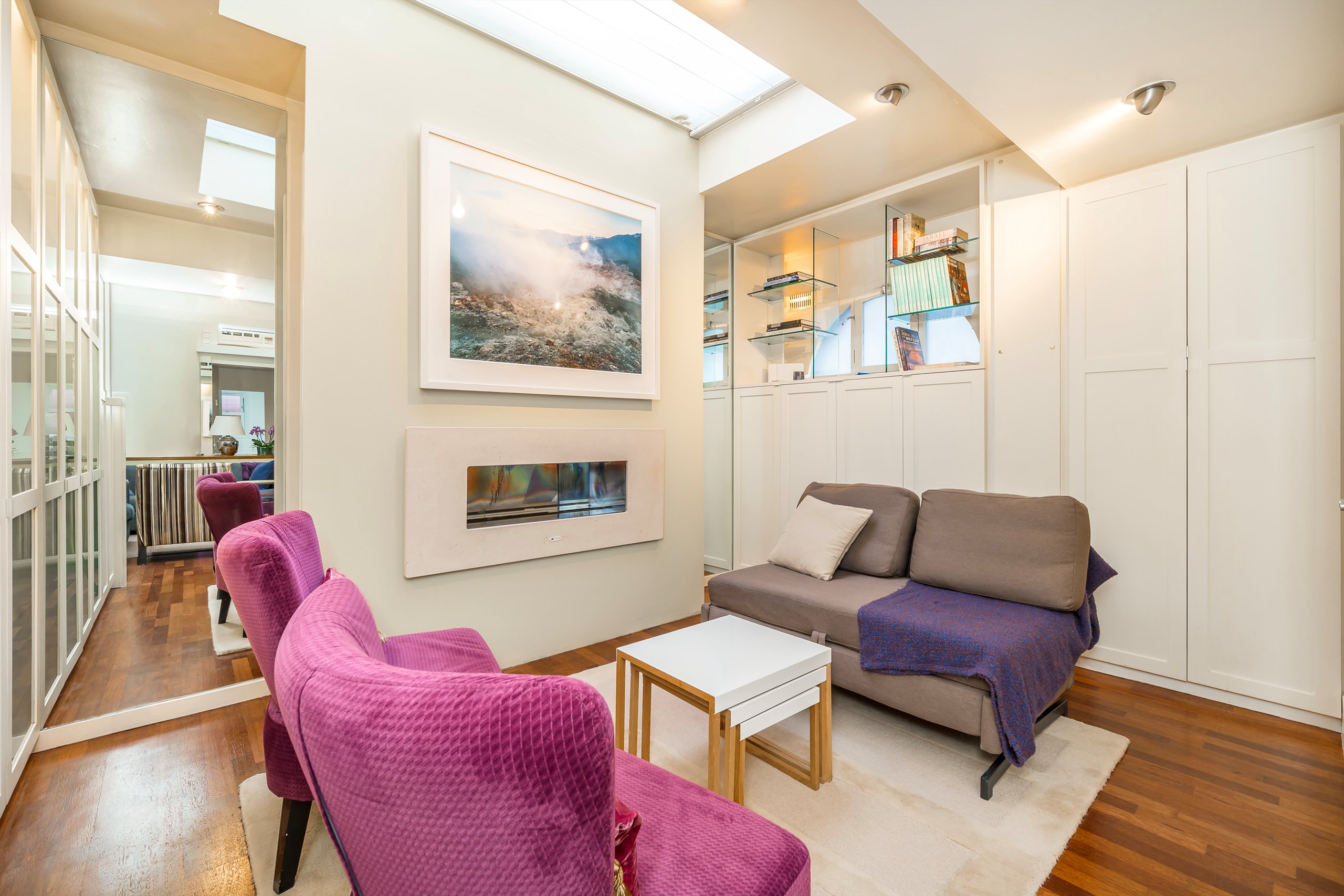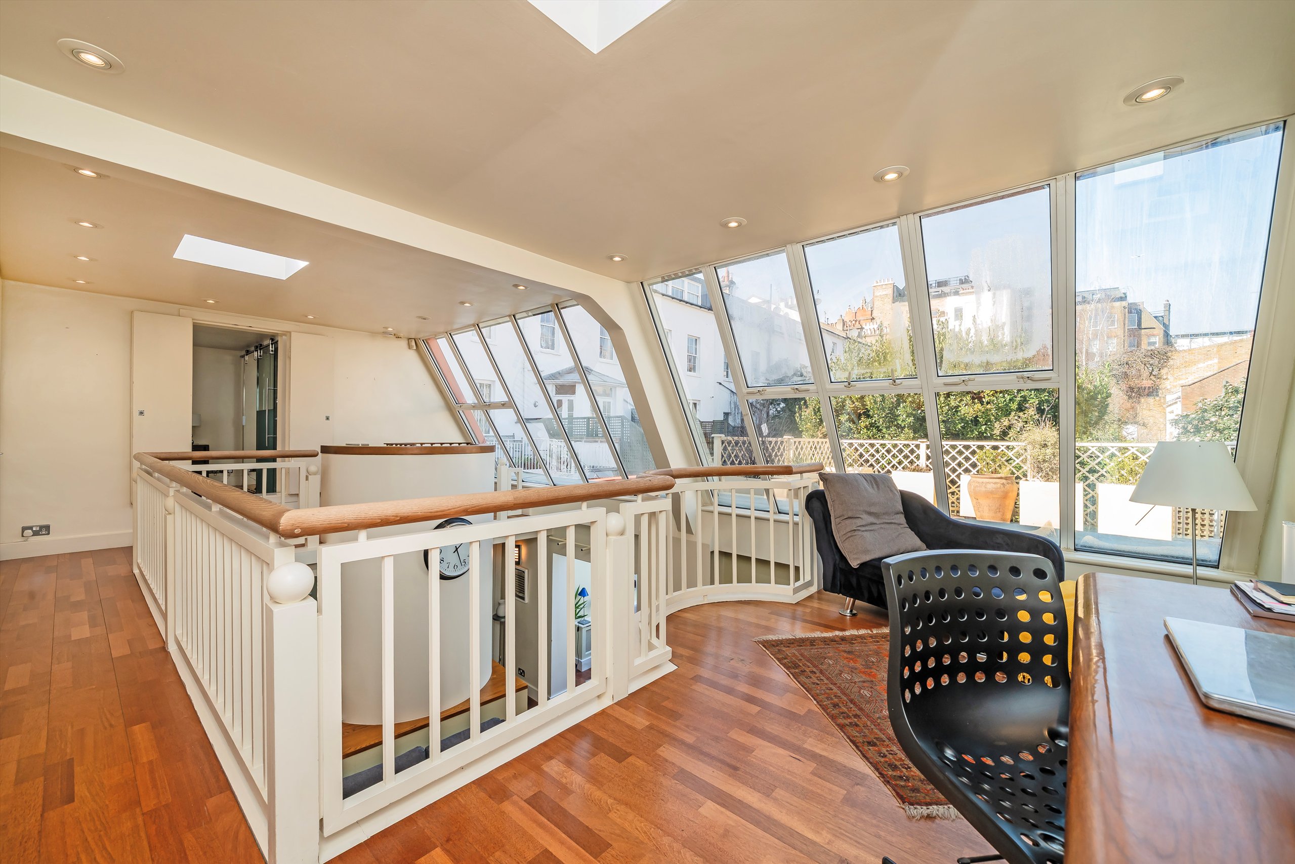 The house is split over two floors and benefits from a spacious, semi open plan, living space, with double height ceilings, dining room leading out onto a private patio, library, two double bedrooms both with excellent storage, two bathrooms and a study leading out to a beautiful roof terrace.