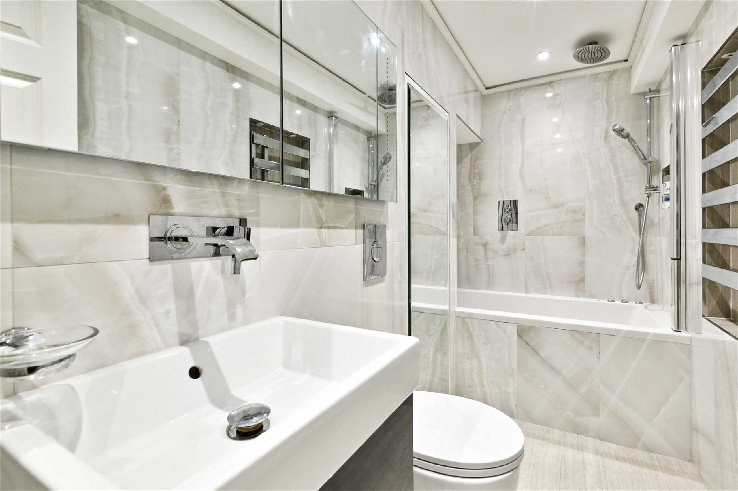 Downstairs in the property, the lower ground floor comprises a spacious master bedroom, with built-in wardrobes, an en suite with a walk-in shower, as well as a modern family bathroom and second double bedroom with views and access to the central courtyard with artificial greenery. The apartment benefits from wood flooring throughout, and underfloor heating on the lower ground level.