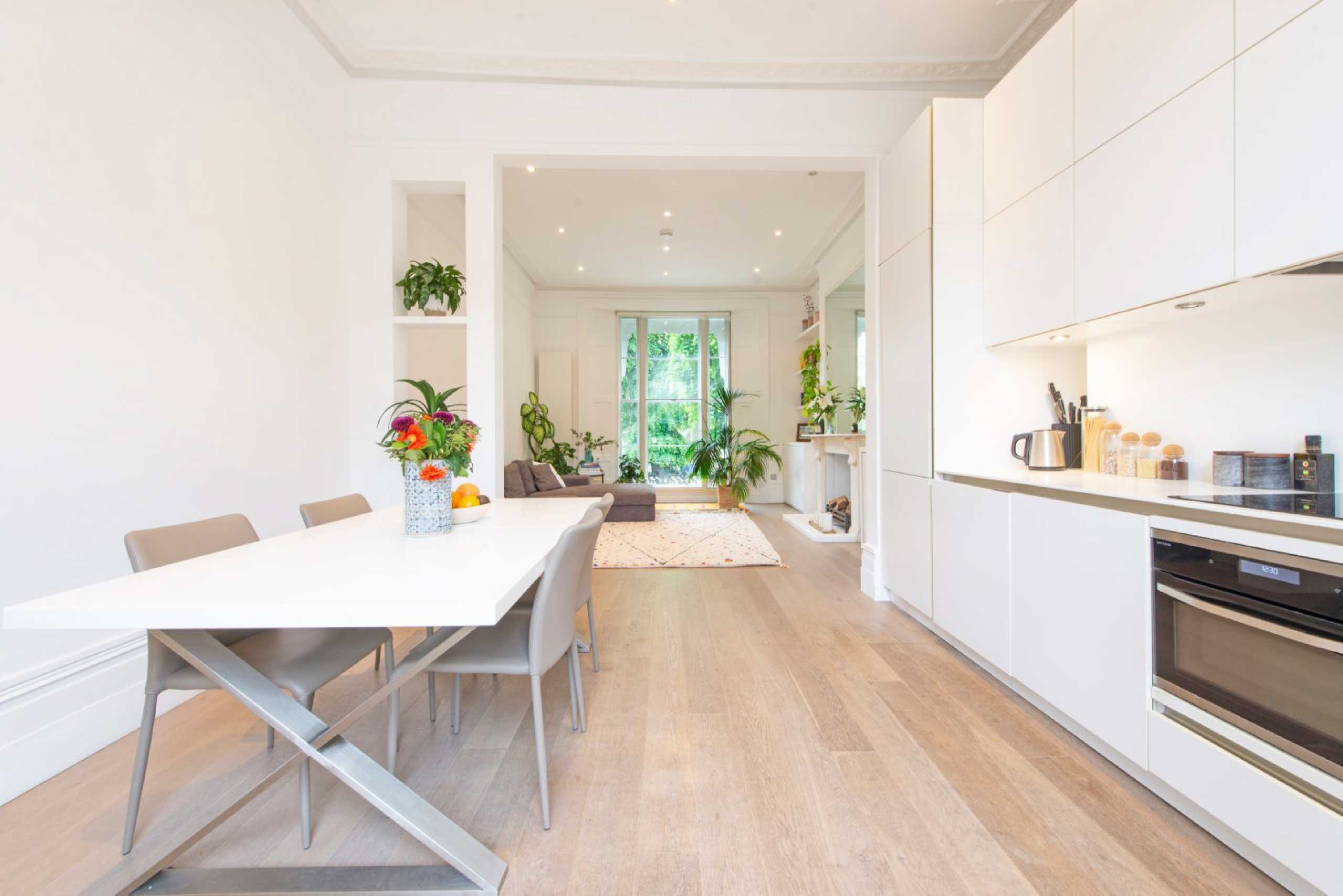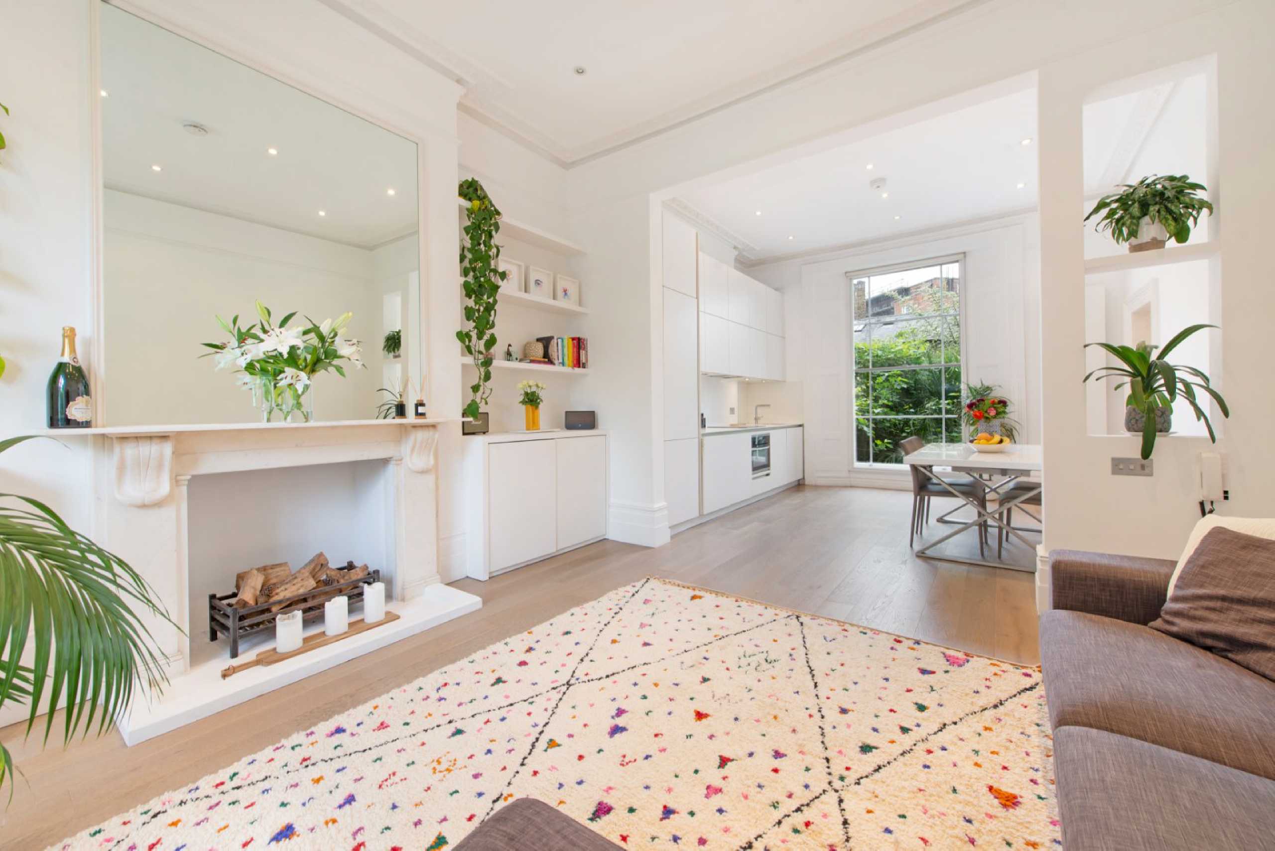 Spanning the whole width of an imposing stucco-fronted villa in the heart of Notting Hill, this wonderful apartment has been recently refurbished to an exacting standard throughout and comprises a huge open-plan kitchen/living room with integrated appliances, a large dining area and a period fireplace, two generous double bedrooms with ample built-in storage and a contemporary bathroom. The property further benefits from hard wooden flooring, high ceilings and an abundance of natural light.