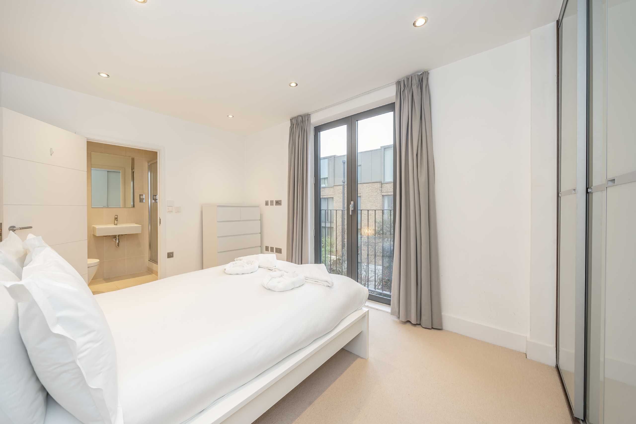 A turnkey two bedroom apartment set within a modern building, offering an open plan kitchen and reception room with floor-to-ceiling windows, a private balcony and external storage.