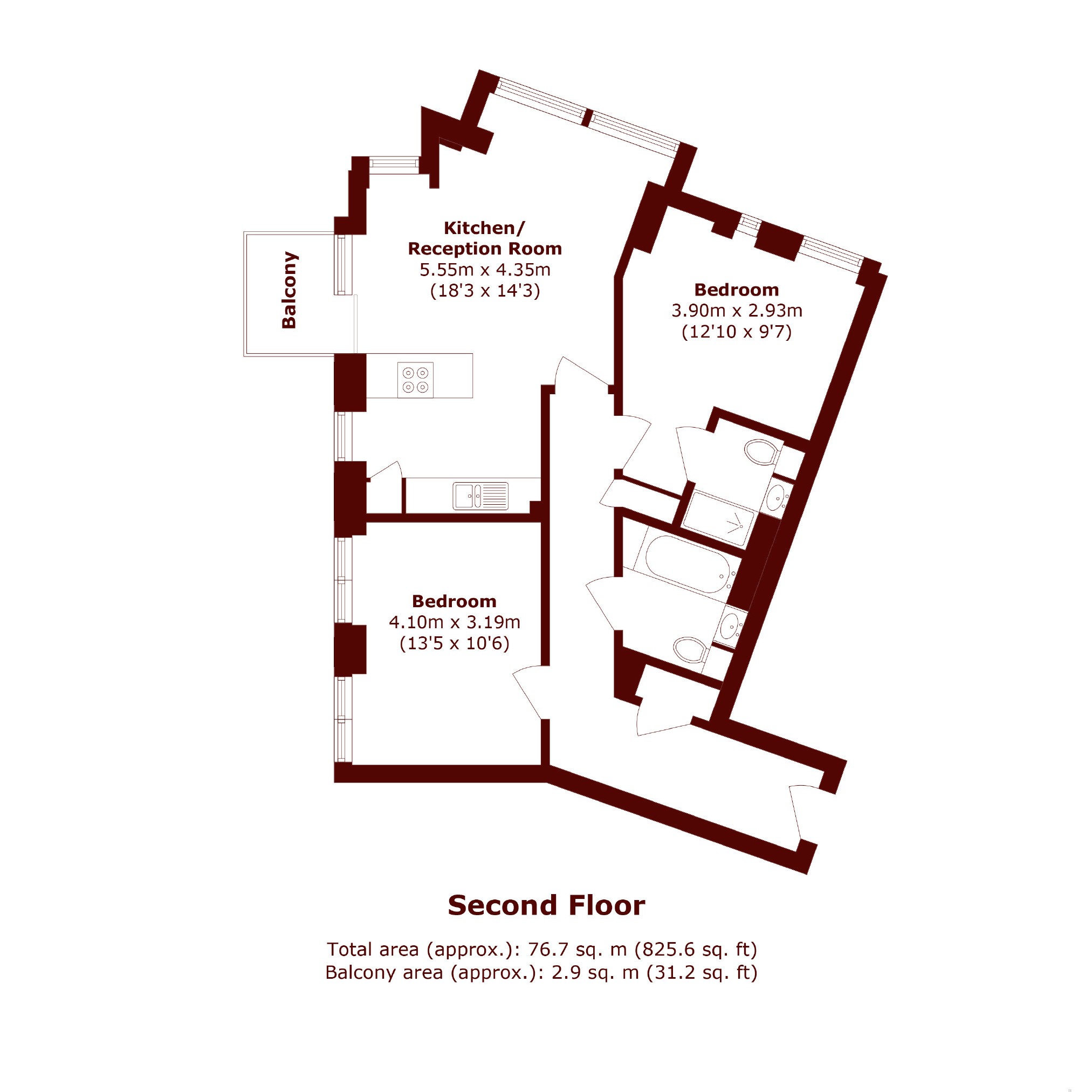 The property is presented in excellent condition throughout and comprises modern open plan kitchen and reception room with access to a balcony, two generous double bedrooms, one ensuite shower room and separate bathroom.