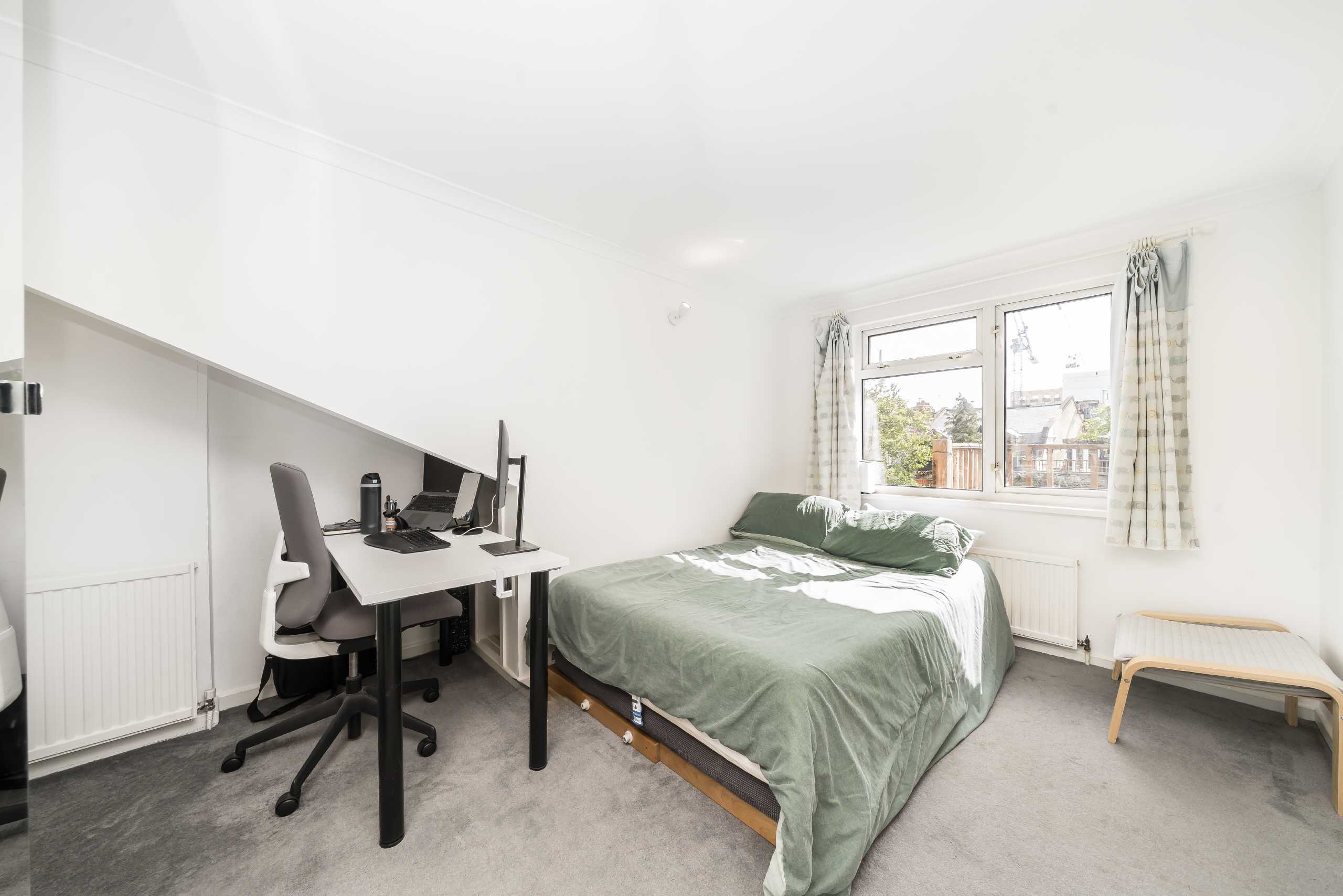 A gorgeous two double bed apartment with a roof terrace set on the top floor of a period conversion in the heart of Queens Park. This incredibly spacious flat is set laterally and comprises of two double bedrooms, a family bathroom featuring a freestanding roll top bath-tub and an open plan kitchen/reception with lots of room for dining and entertaining. Benefits include the south-facing roof terrace with lovely views and lots of built-in storage throughout.