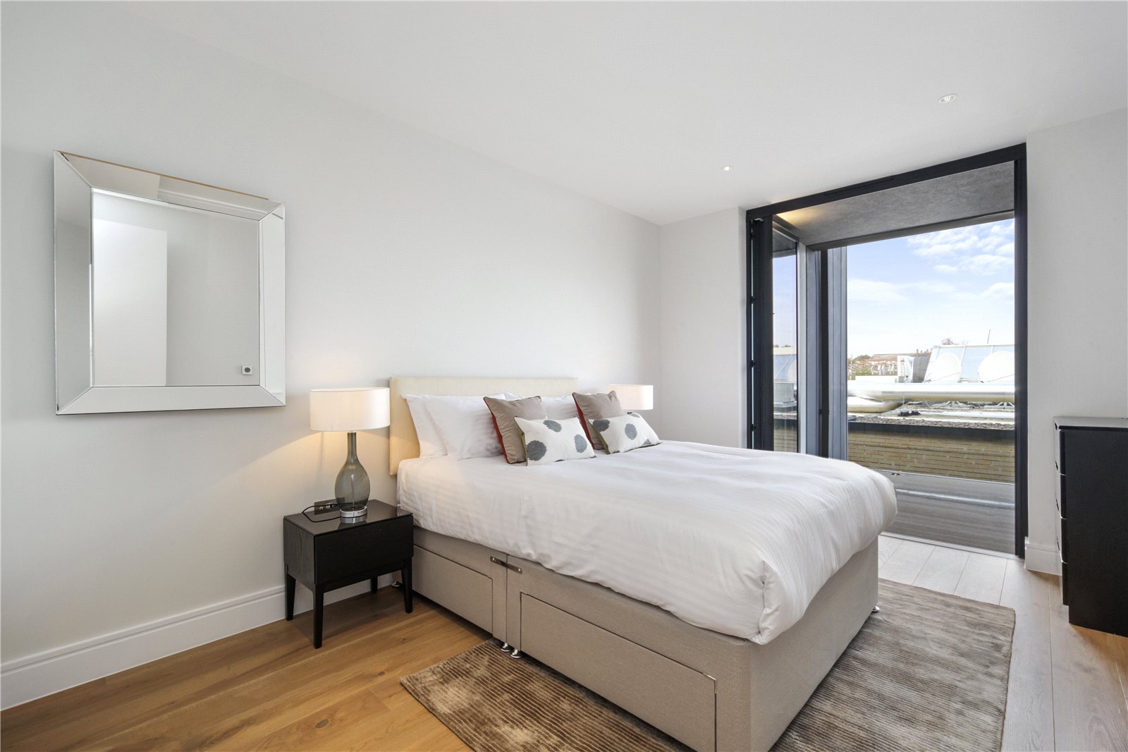 A modern one bedroom apartment on the third floor of a new build development. Layout includes a spacious open-plan living room with hard wood flooring, a full length private terrace and a large bedroom with fitted storage.