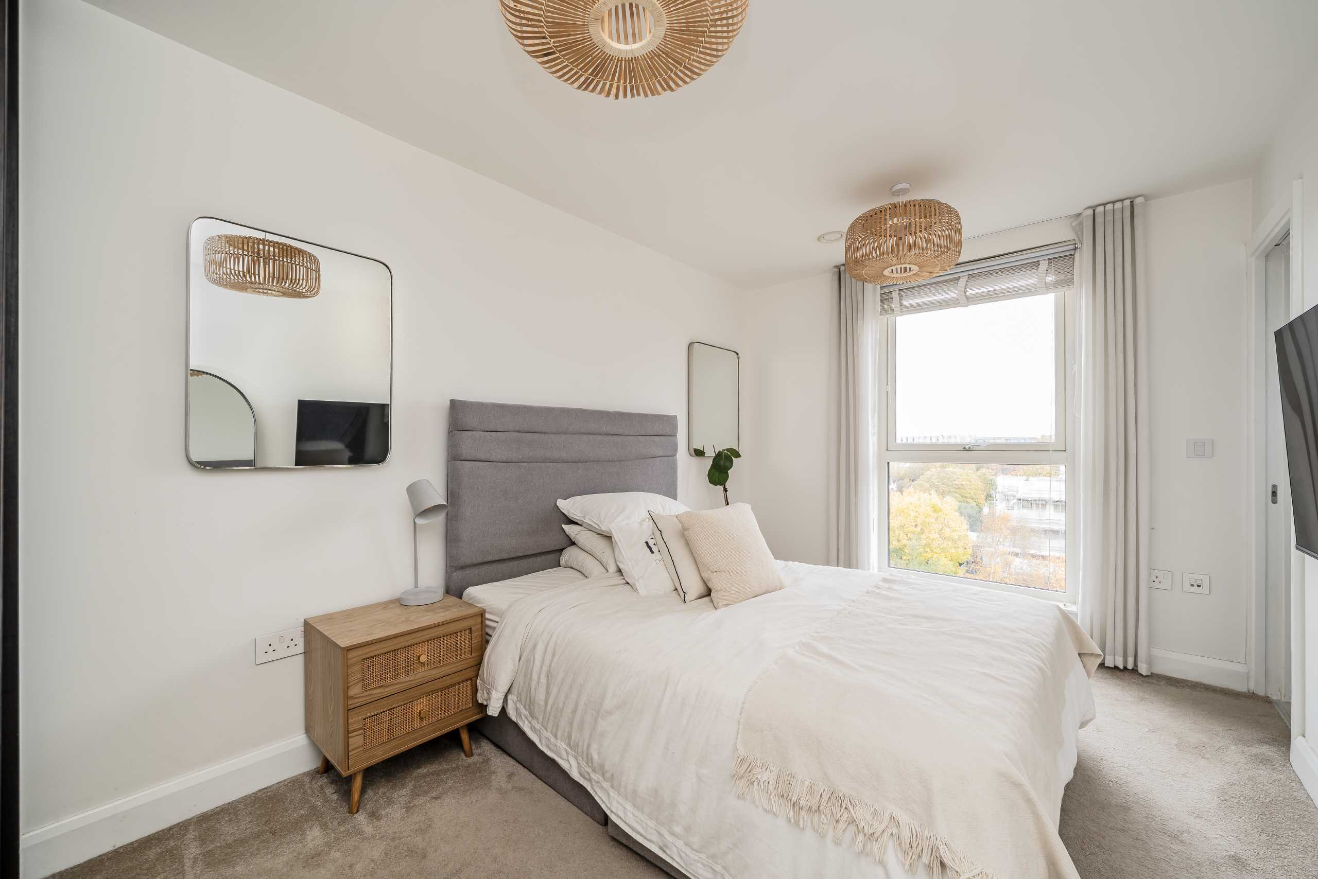 Situated on the fifth floor, this two bedroom apartment offers bright, modern living with floor-to-ceiling windows, underfloor heating, and a sleek integrated kitchen. The open-plan living space leads to a private balcony, with two spacious bedrooms.