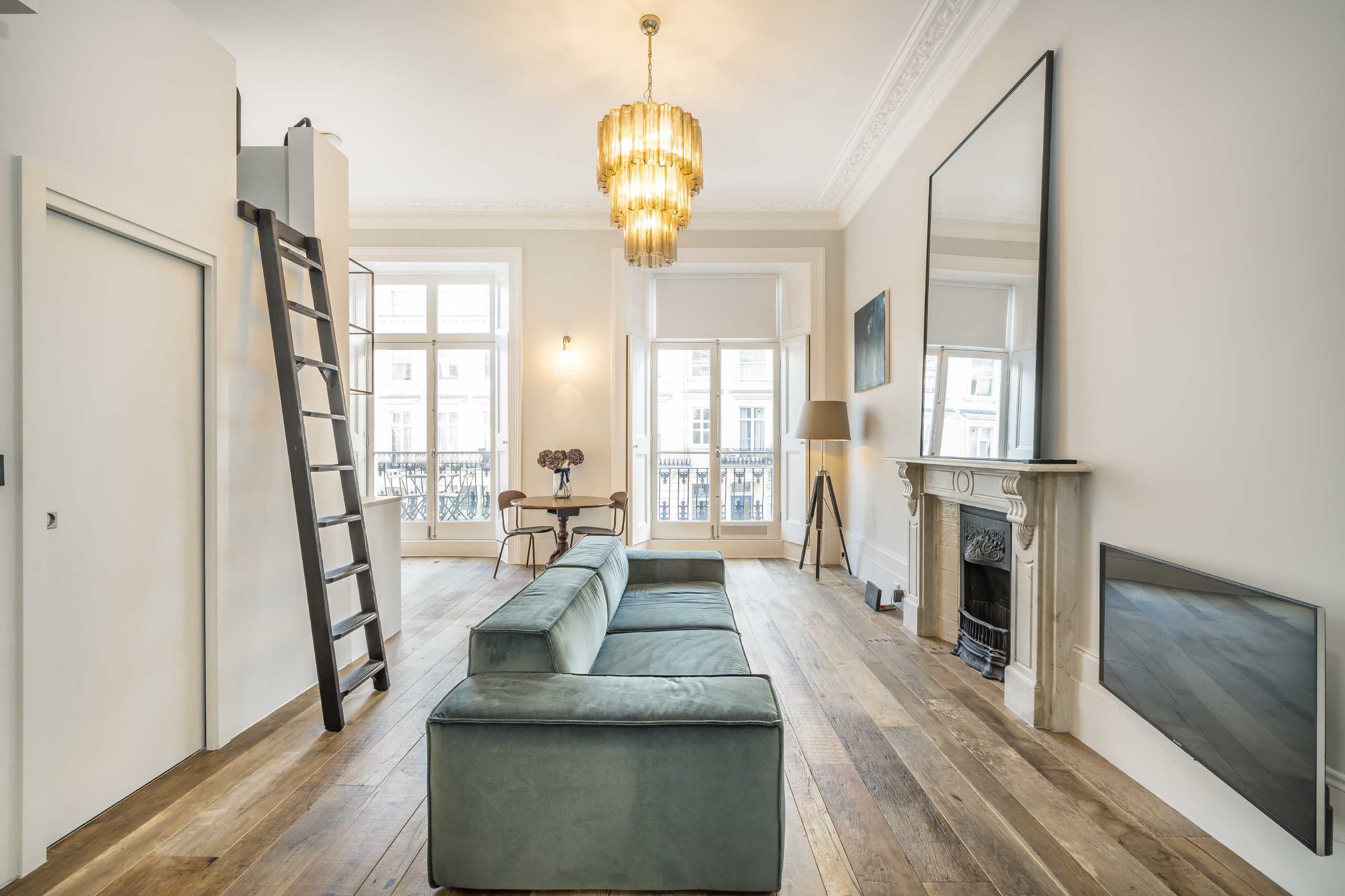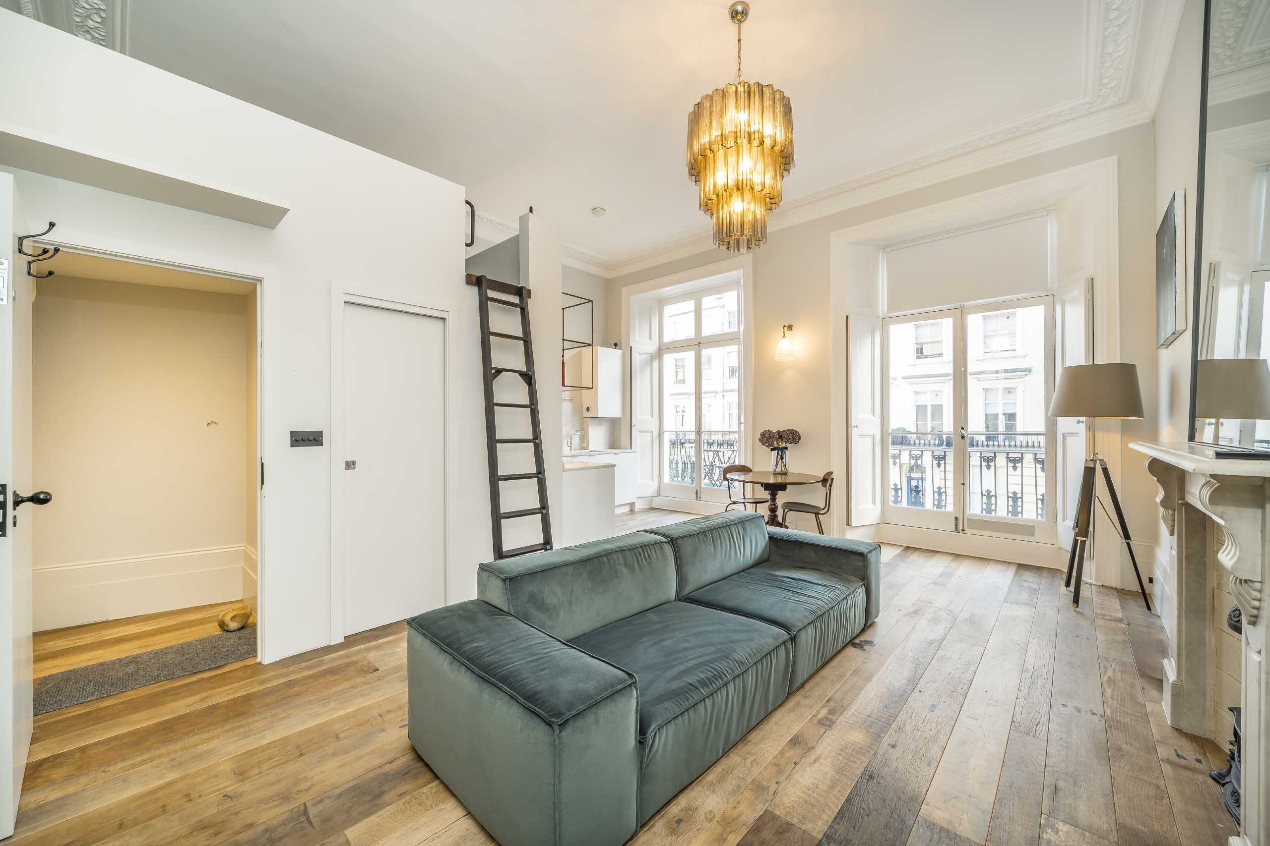 Simply stunning one bedroom first floor apartment located in this striking period villa with high ceilings and a private balcony. The apartment has been completely renovated throughout to an excellent standard and is finished to the highest quality including solid wood floors and a high spec kitchen and bathroom. The principal bedroom is a fantastic size and has an elegant feature fireplace, the reception room is well laid out with an open plan kitchen, feature fire place, access to a convenient mezzanine area that can double as a study or sleeping area, and opens directly onto a private balcony. There is also a separate storage room accessed via the half landing.