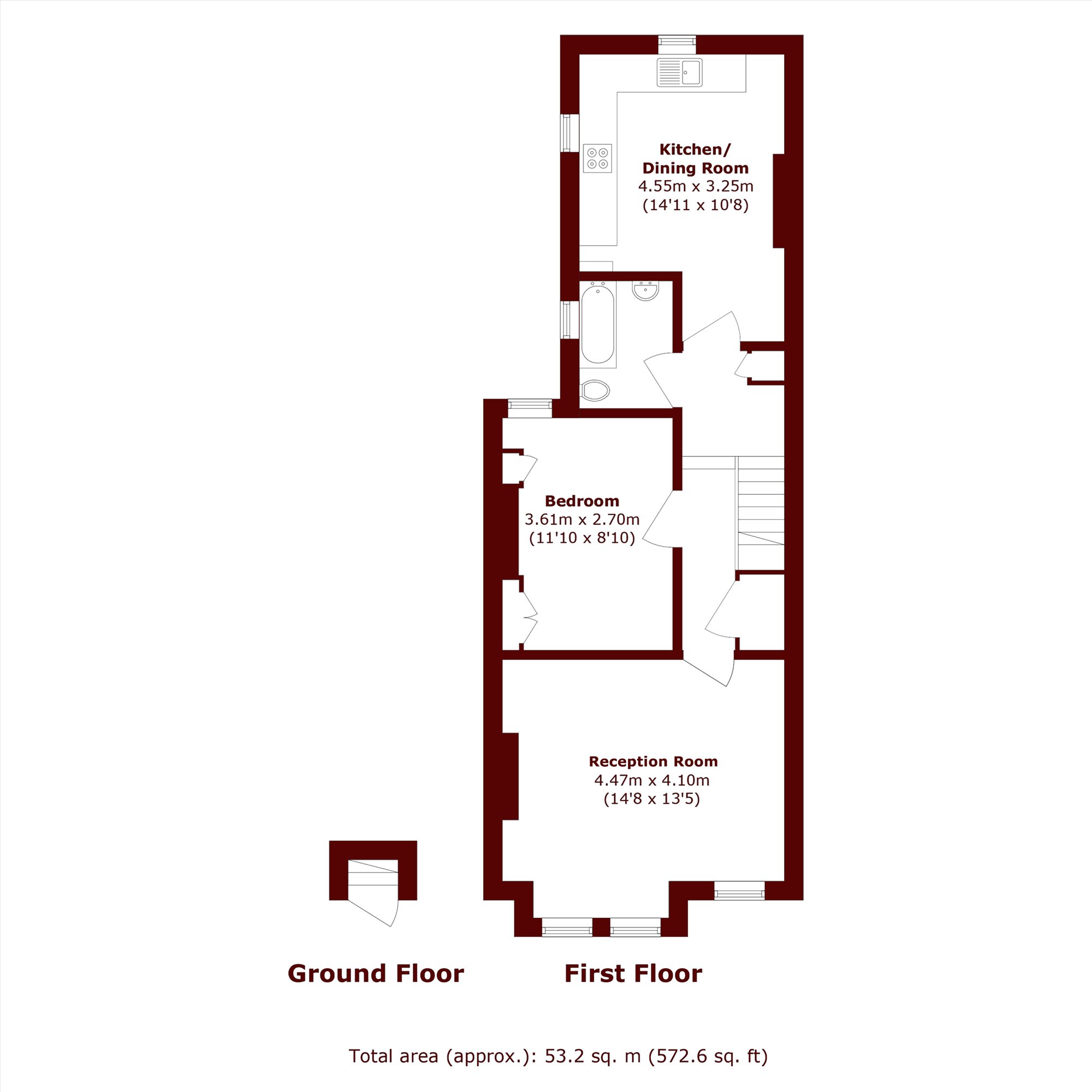 A first floor one bedroom conversion flat offers a spacious living room, a separate eat-in kitchen, a double bedroom and a family bathroom.