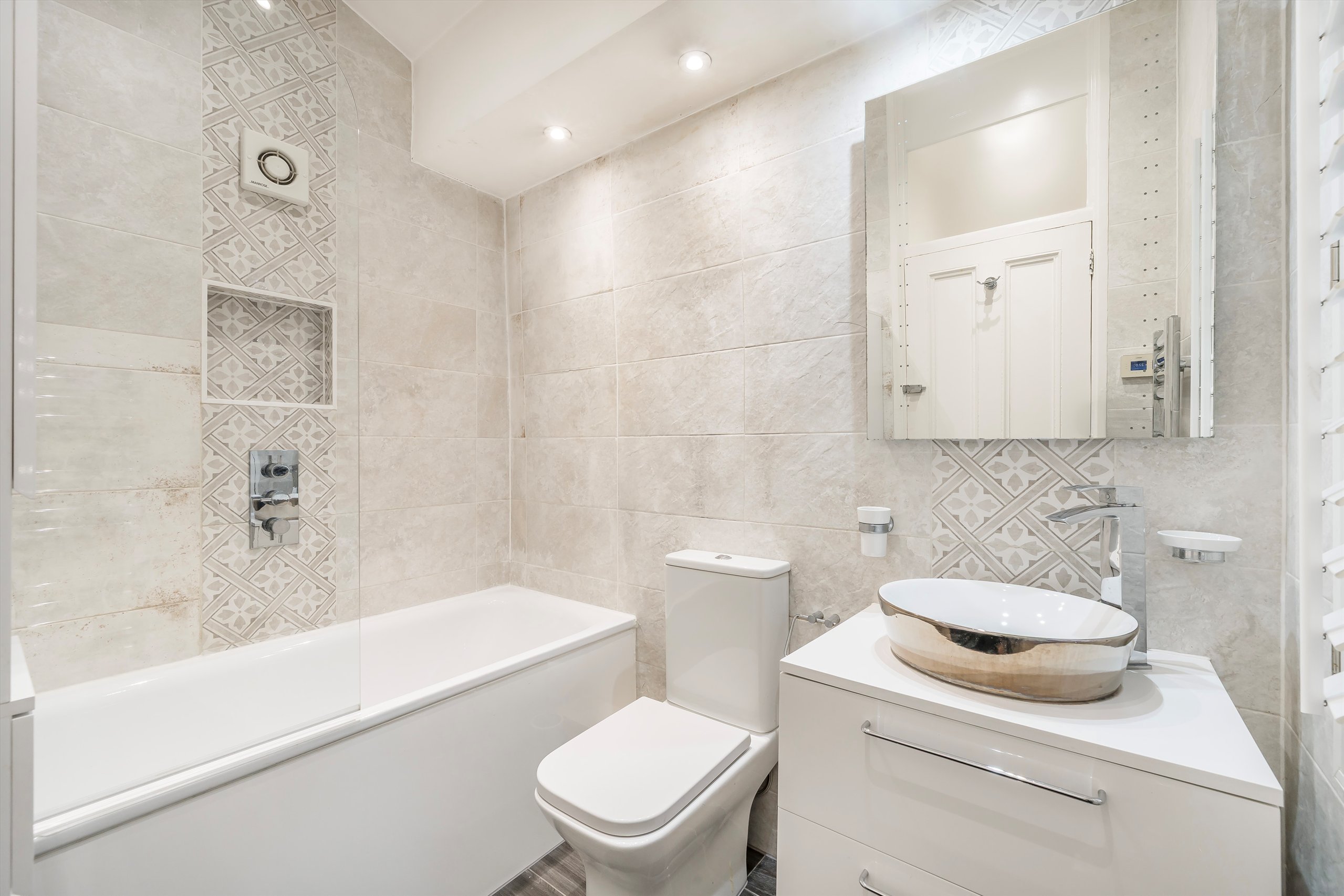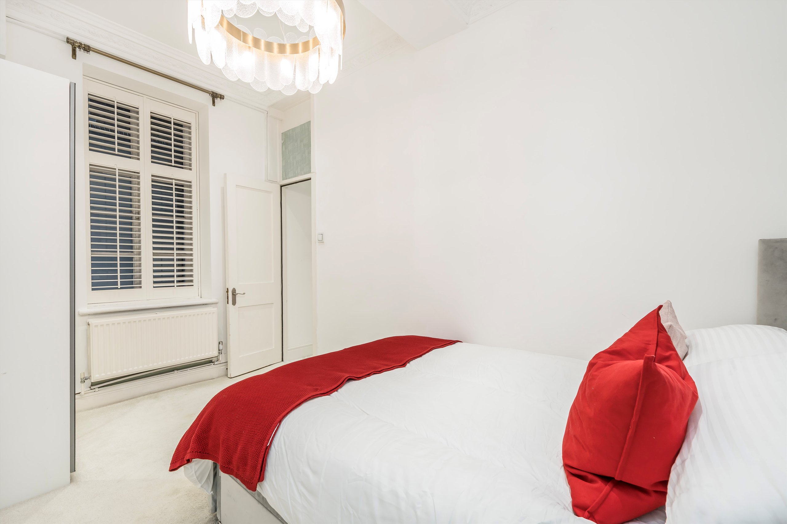 A two bedroom, two bathroom flat with spacious kitchen and living room, high ceilings and sash windows.