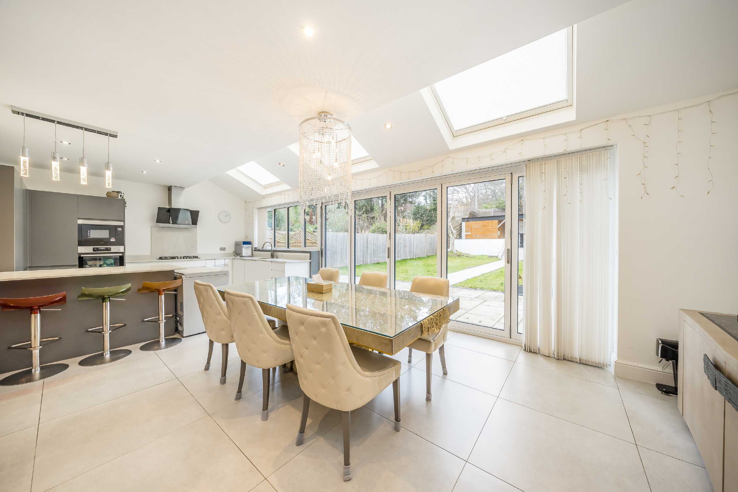 A spacious and luxurious detached house, offering over 2,830 sq ft of living space with a large garden. This property benefits from high specification throughout with a large marble tiled double reception and a large open plan kitchen/dining room with tri-folding doors and bright skylights. The property offers five bedrooms, three bathrooms, large garden and off-street parking for two cars.