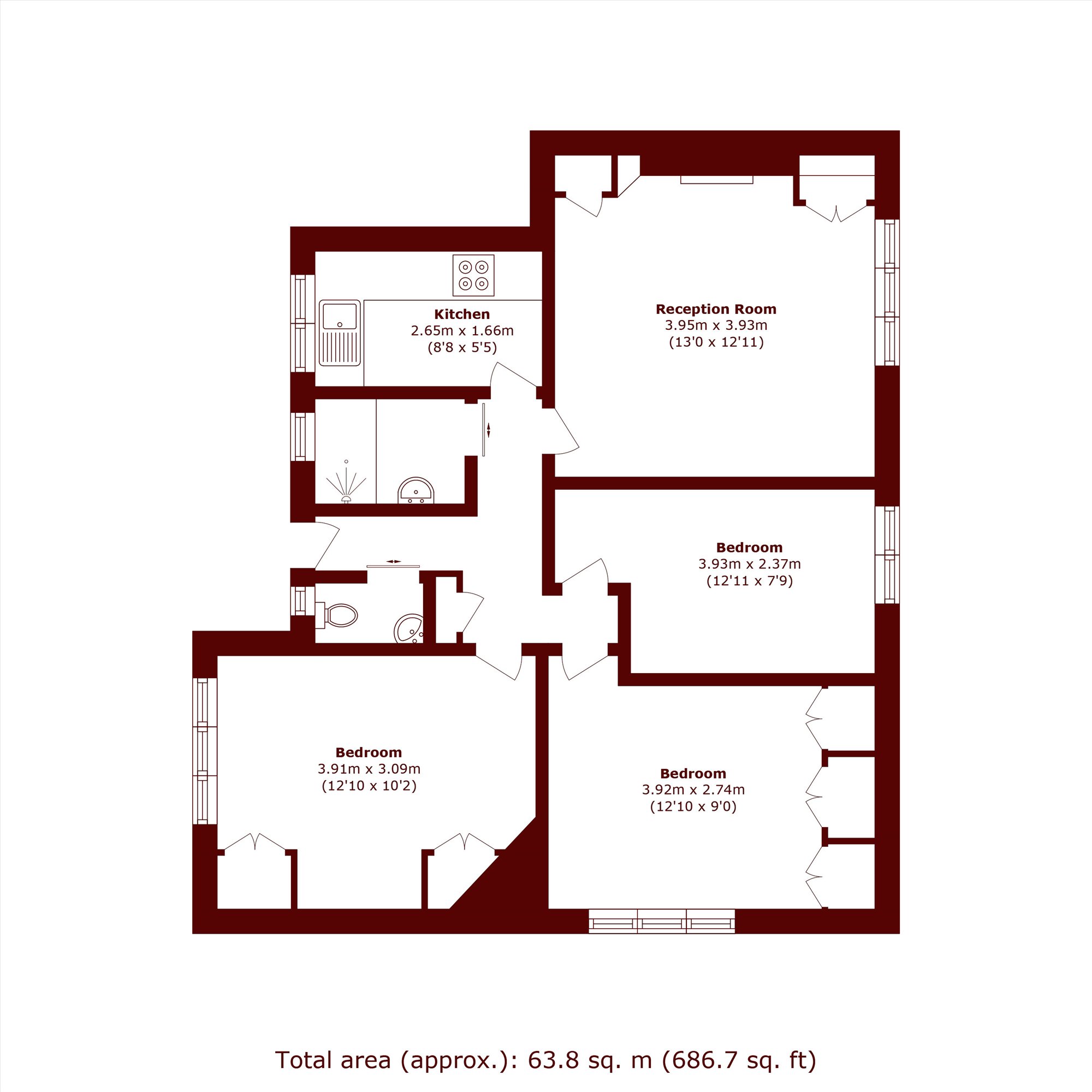 The accommodation comprises two generous double bedrooms and a third bedroom, a modern bathroom with a separate WC, a spacious reception room ideal for entertaining, and a fitted kitchen. Residents also benefit from off-street parking.