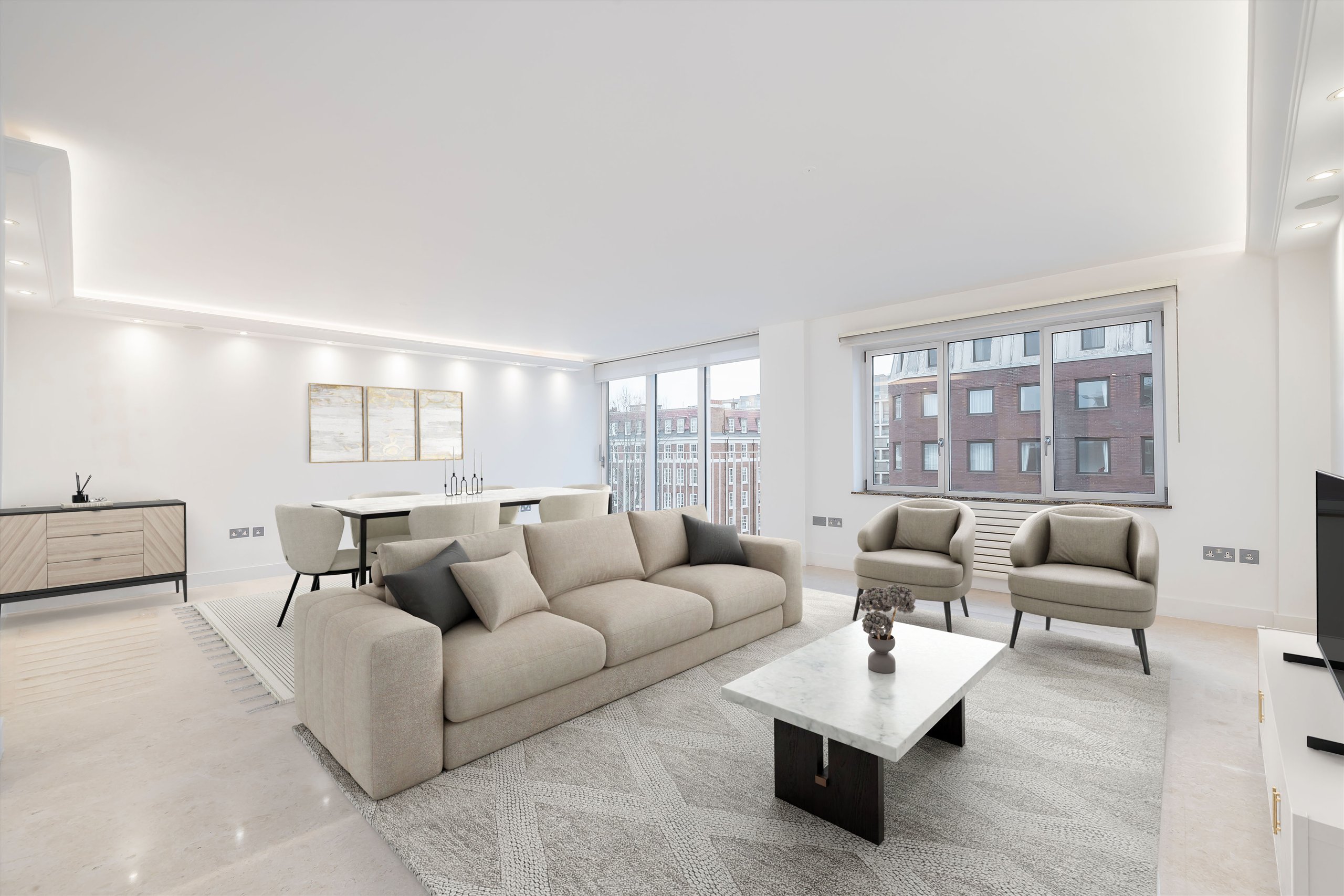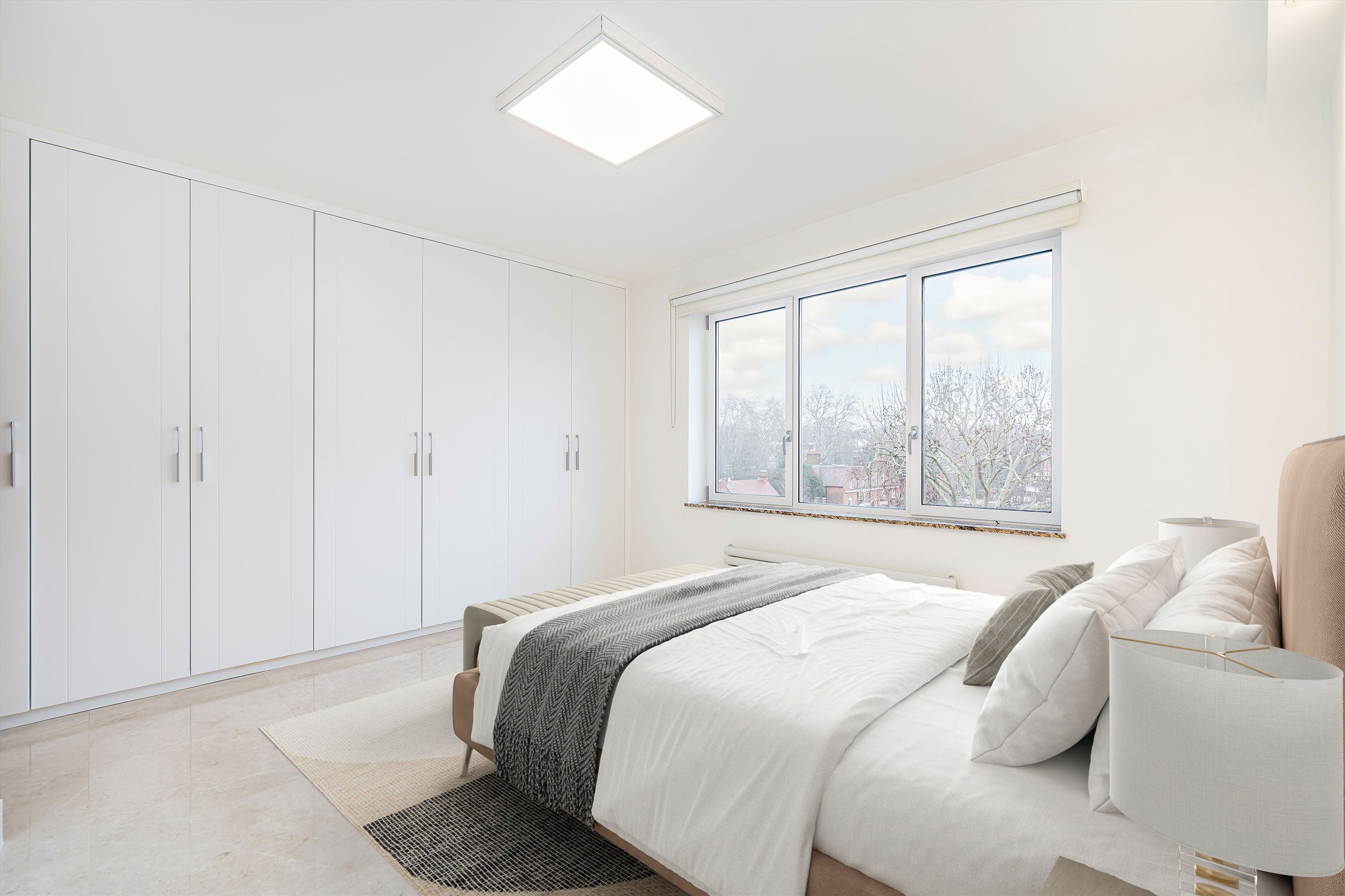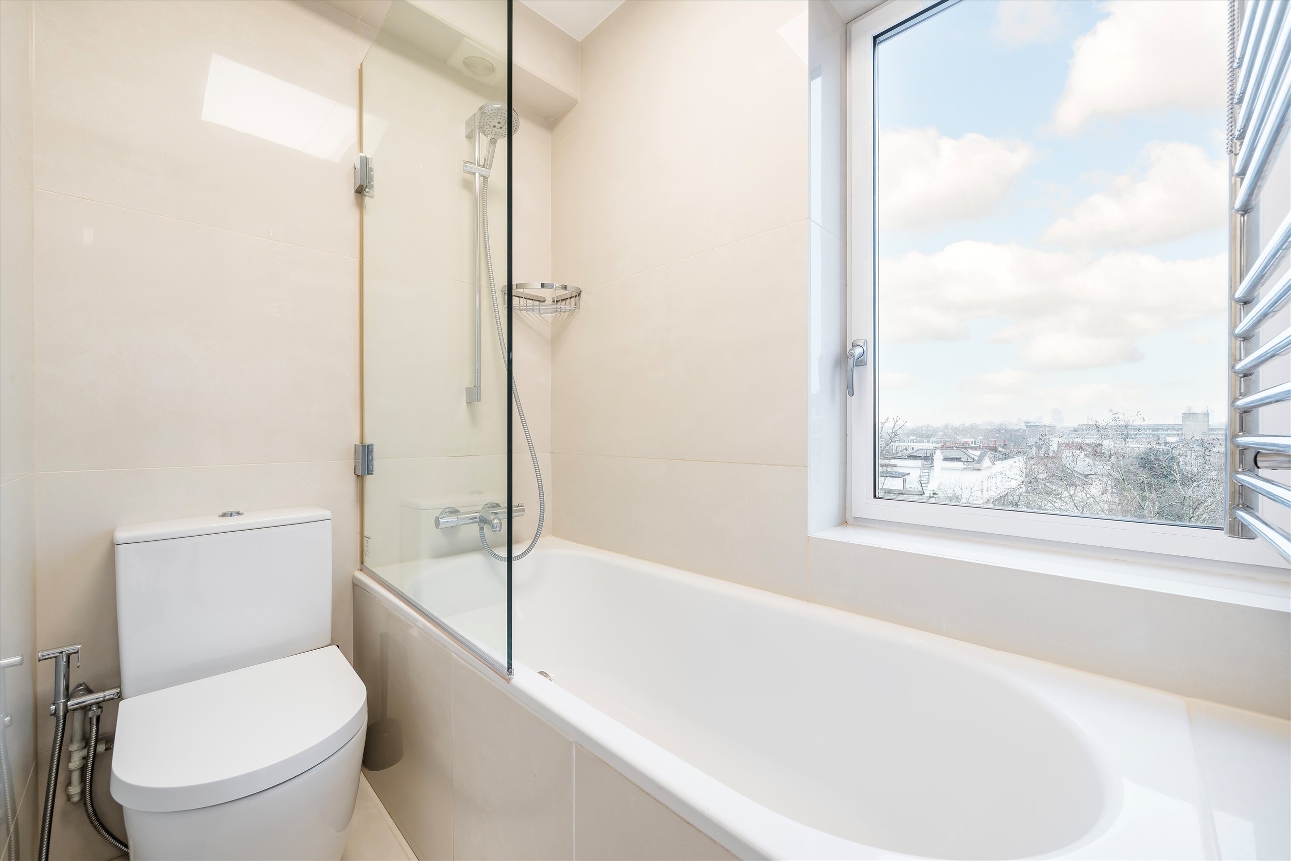 Located on the sixth floor of a highly sought-after residential building with porter and lift access, this outstanding apartment enjoys a rare triple aspect with sweeping views across Holland Park and West London, complemented by a westerly facing balcony. The property has been meticulously refurbished to an exceptional standard, with careful attention paid to every detail. Accommodation includes a bespoke designer kitchen with marble worktops and integrated Miele appliances, a generous reception space, three large double bedrooms including a principal suite with ensuite bathroom, and a further high-quality family bathroom.